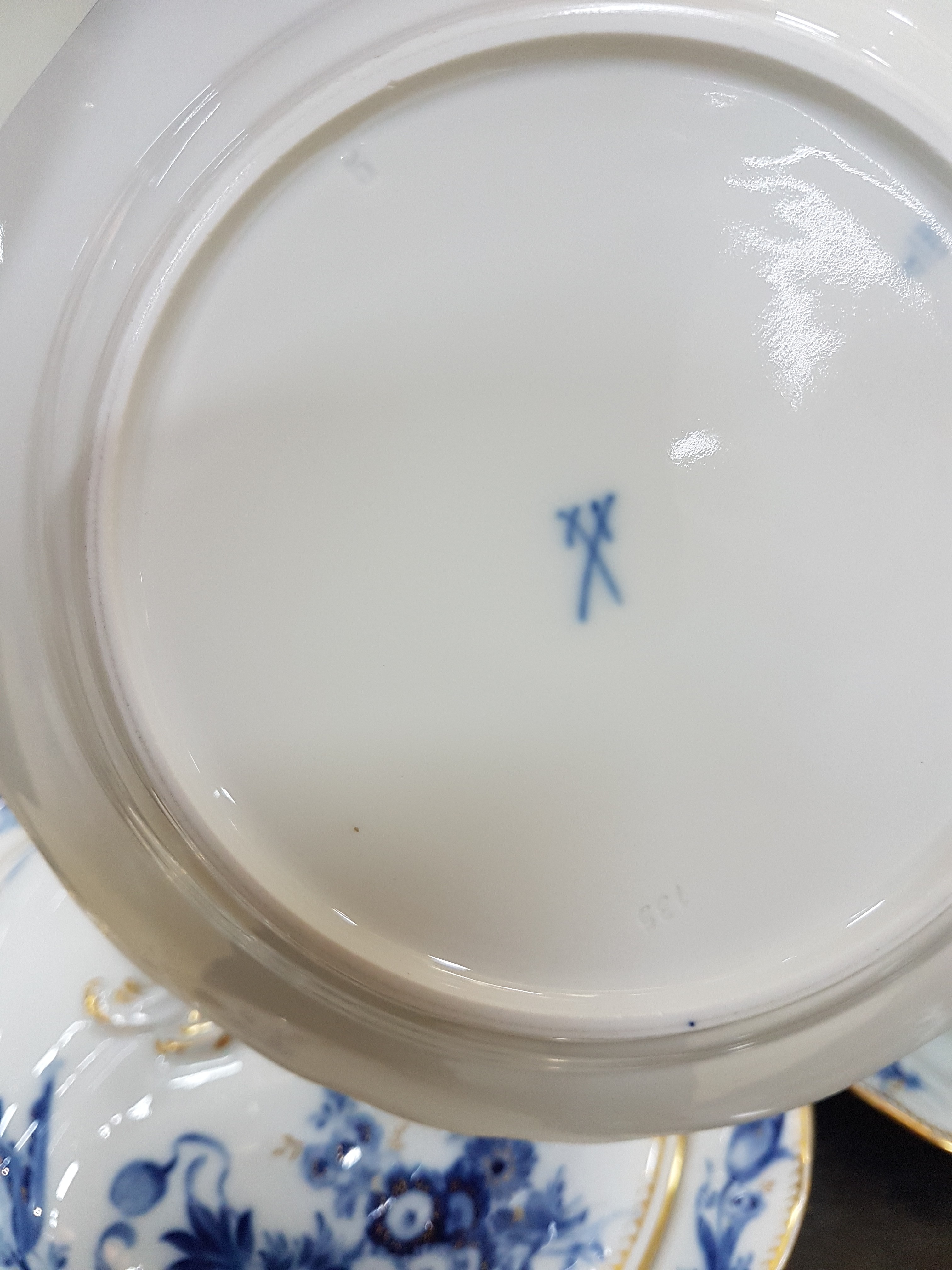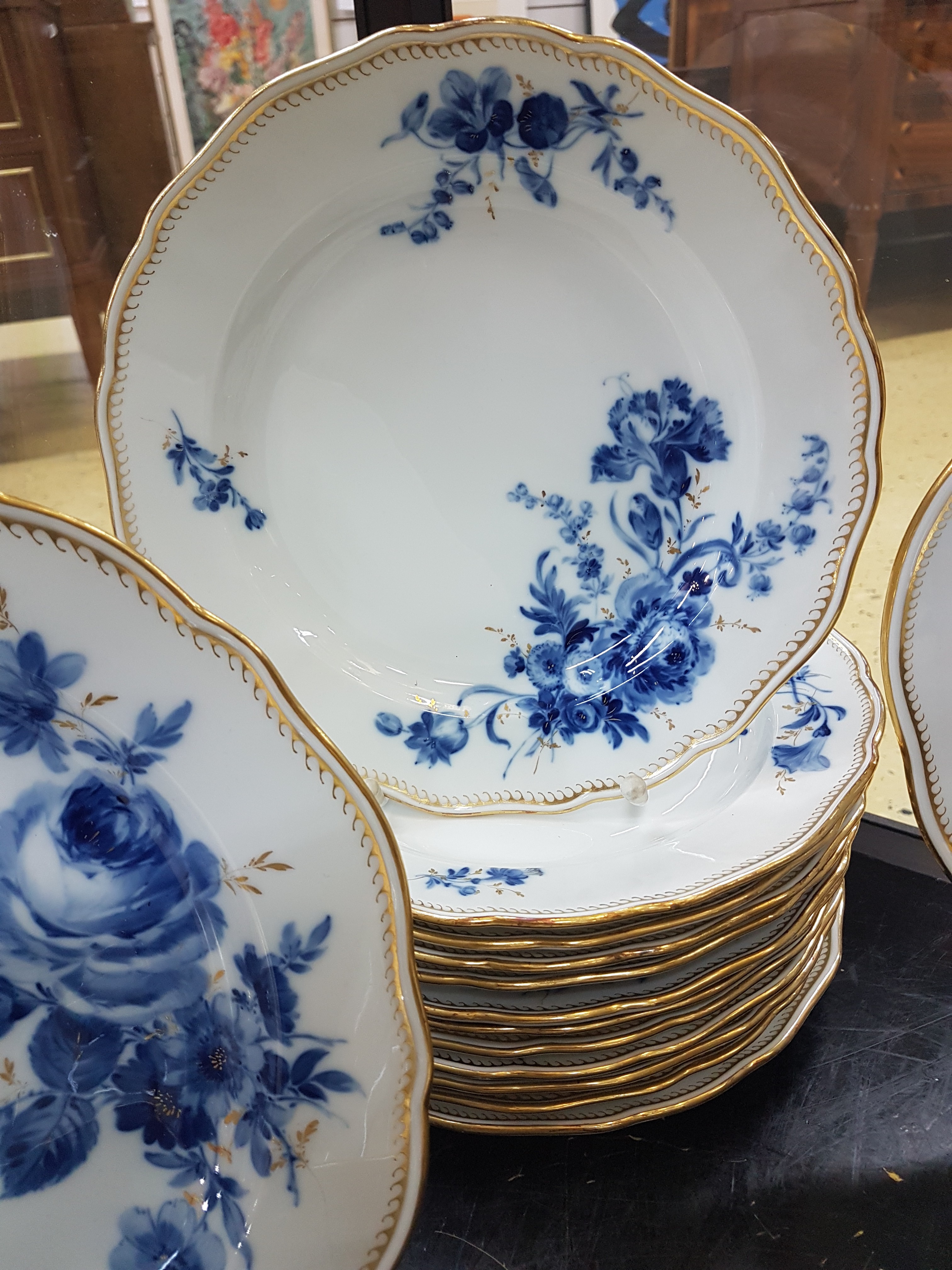 Tafelservice, Meissen, 30er Jahre, Porzellan, blauer Blumenbukettdekor mit Goldgräsern