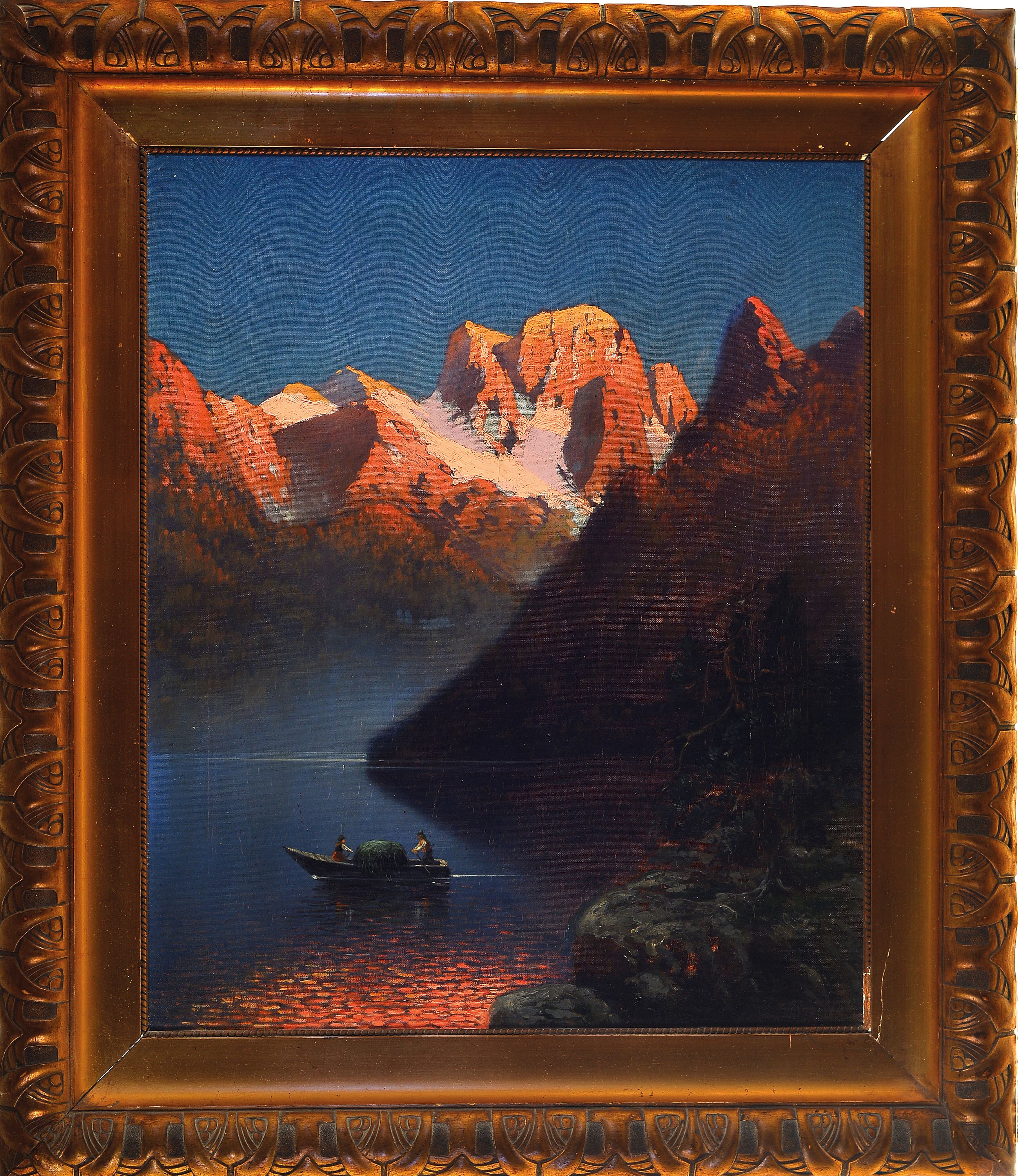F. Feist, wohl Ansicht vom Königsee mit Blick auf den Watzmann, Öl/Lwd., re. unten sign., dat. 1909 (?), ca. 65 x 52 cm, Jugendstilrahmen ca. 85 x 72 cm mit l. Gebr.schäden