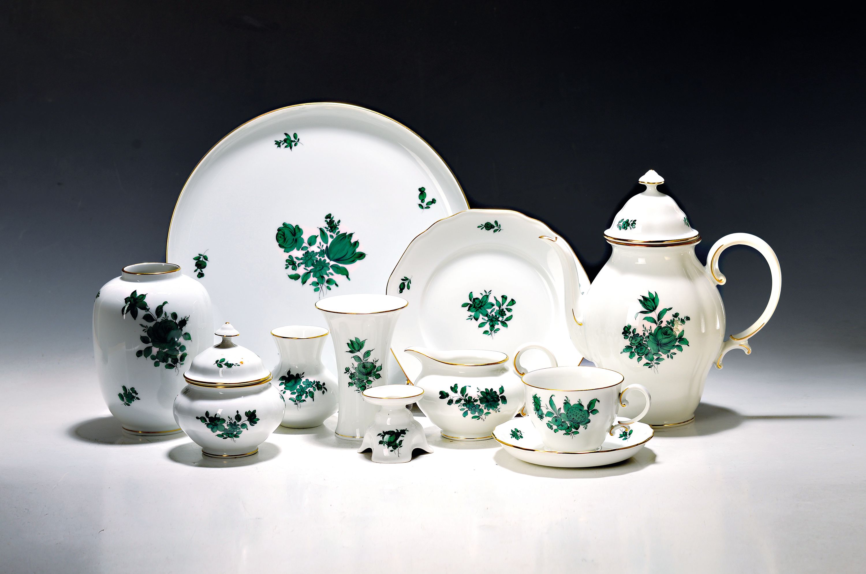 Kaffeeservice, Wien Augarten, für 9 Personen, kupfergrüner Blumenbukettdekor, Kaffeekanne,