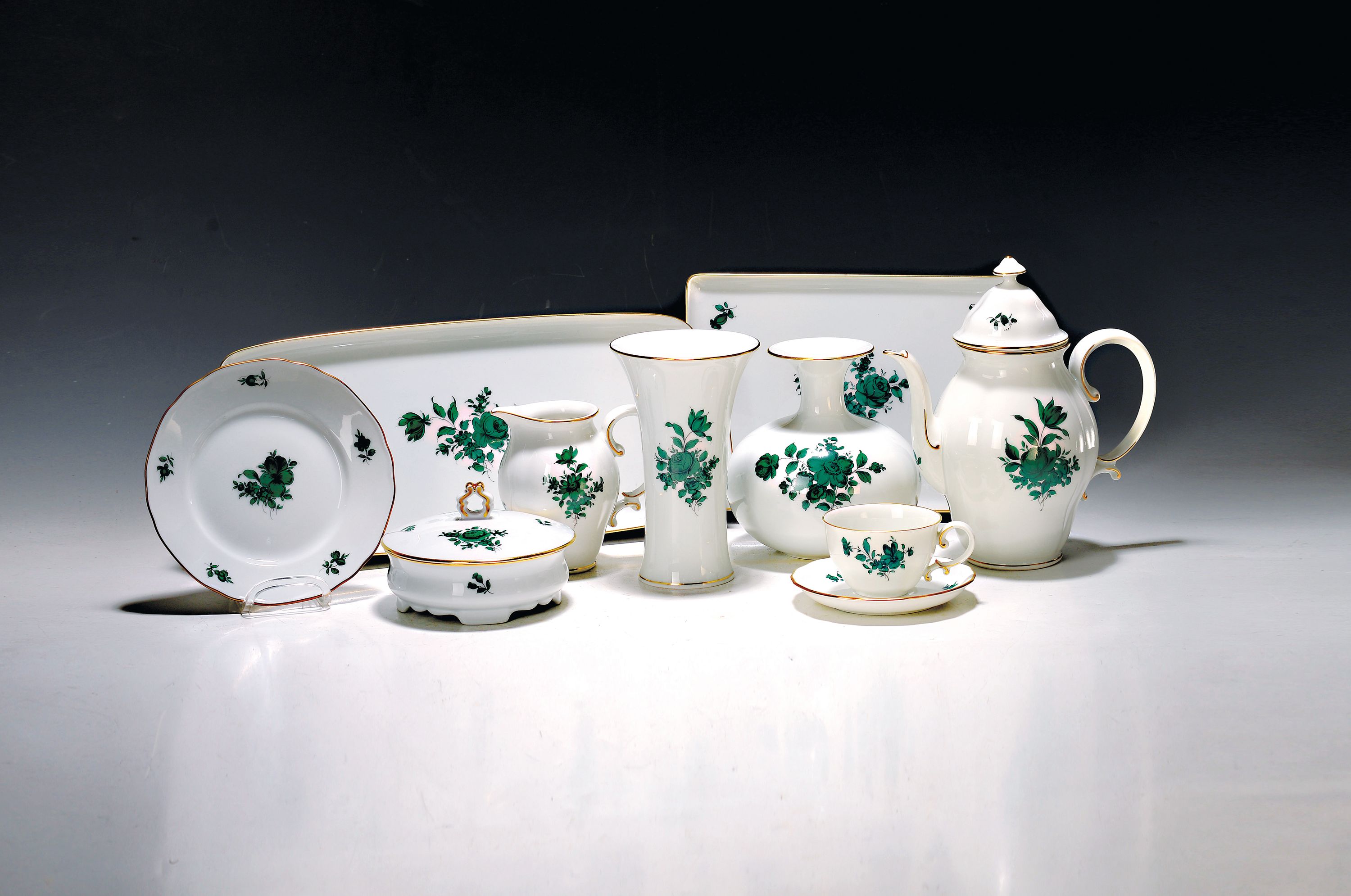 8 kl. Tassen mit Untertassen, 9 Dessertteller, Sahnegießer, Deckeldose, kl. Tablett,