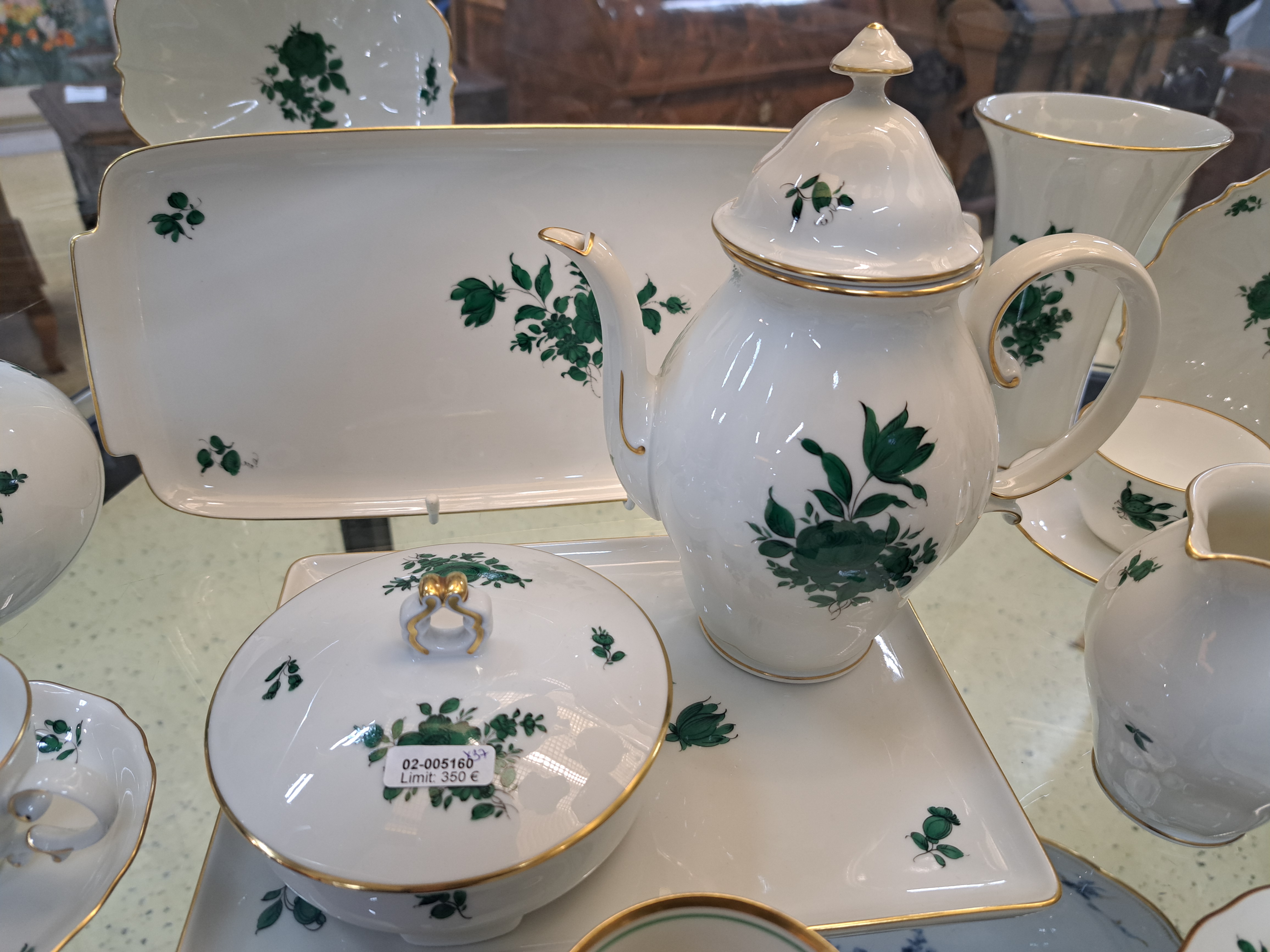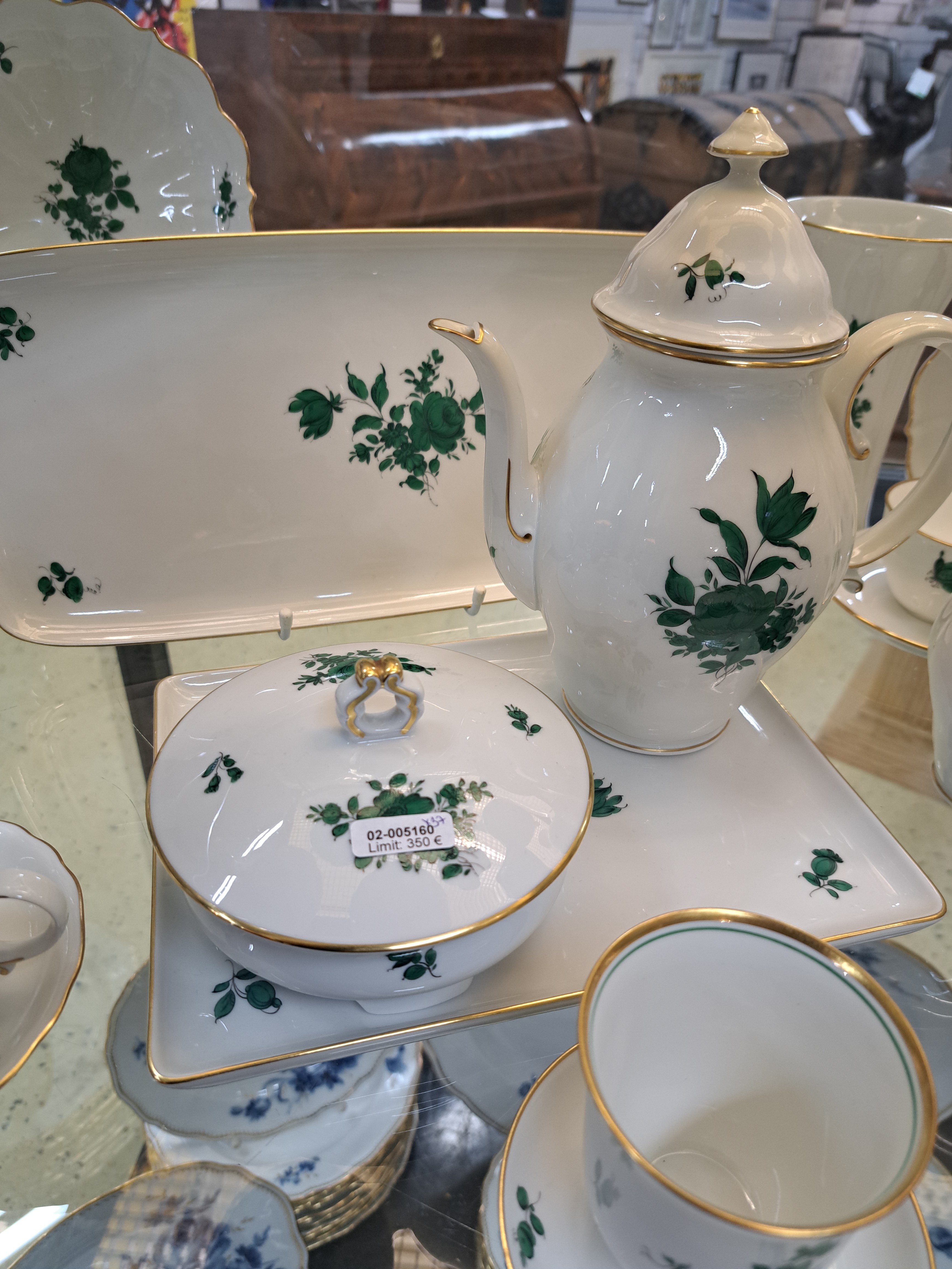 Mokkaservice, Wien Augarten, Porzellan, kupfergrüner Blumendekor, kl. Kaffeekanne,