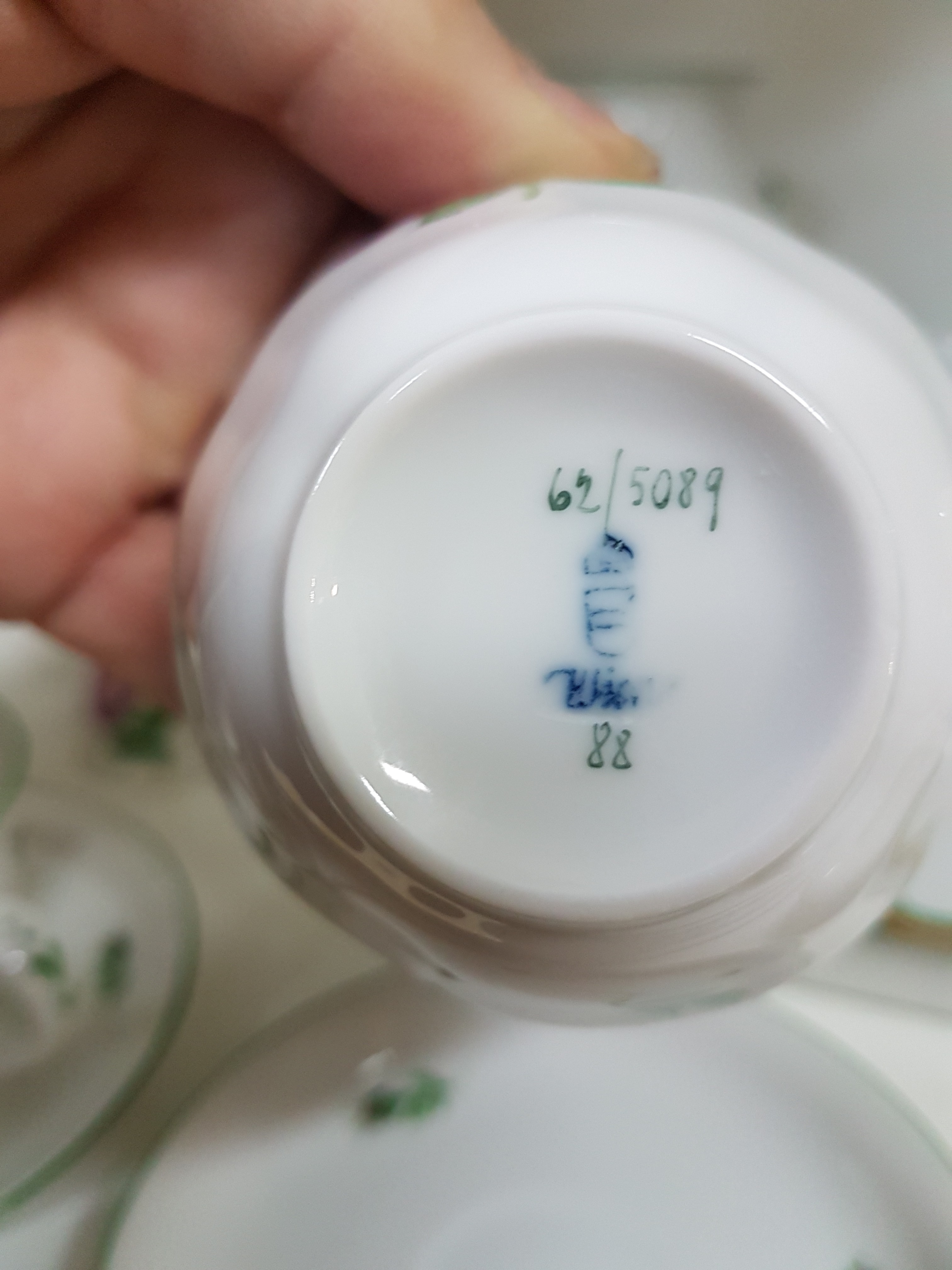6 kl. Kaffeetassen mit Untertassen, Vielpassschale, Leuchter; dazu: Jagddekor mit