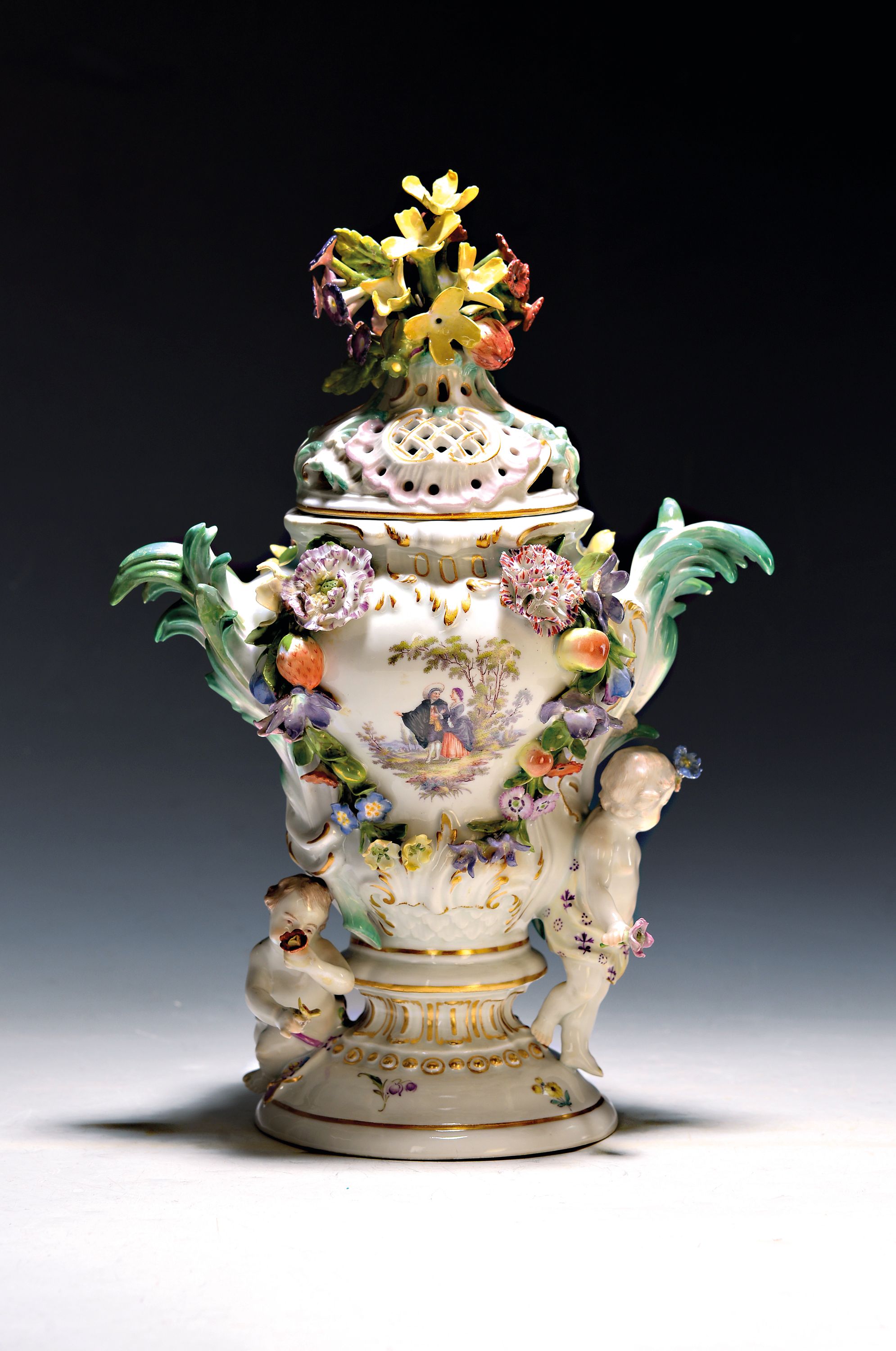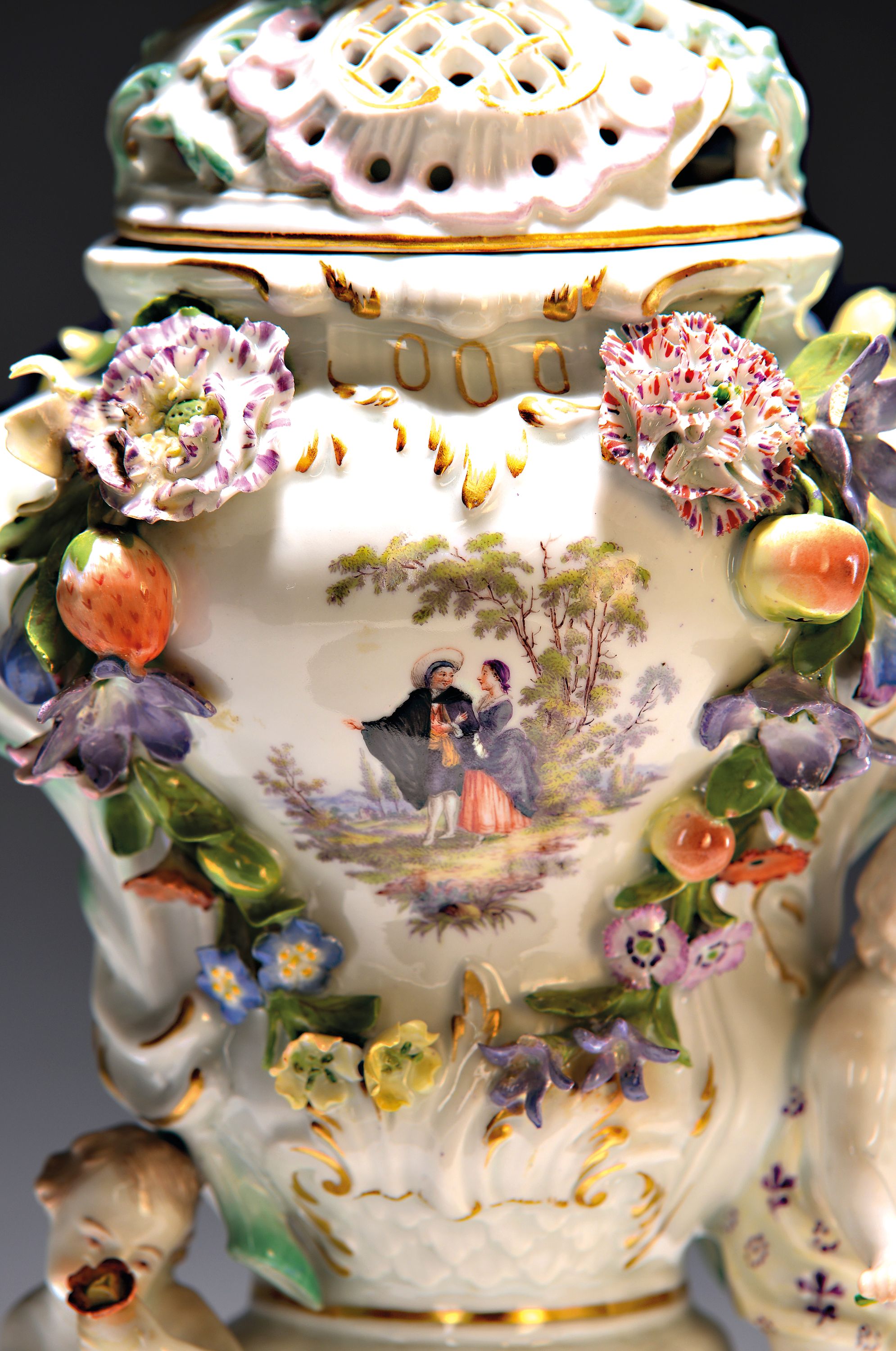 und applizierten Blüten und Obst, vorder- und rückseitig galante Szene mit Paar