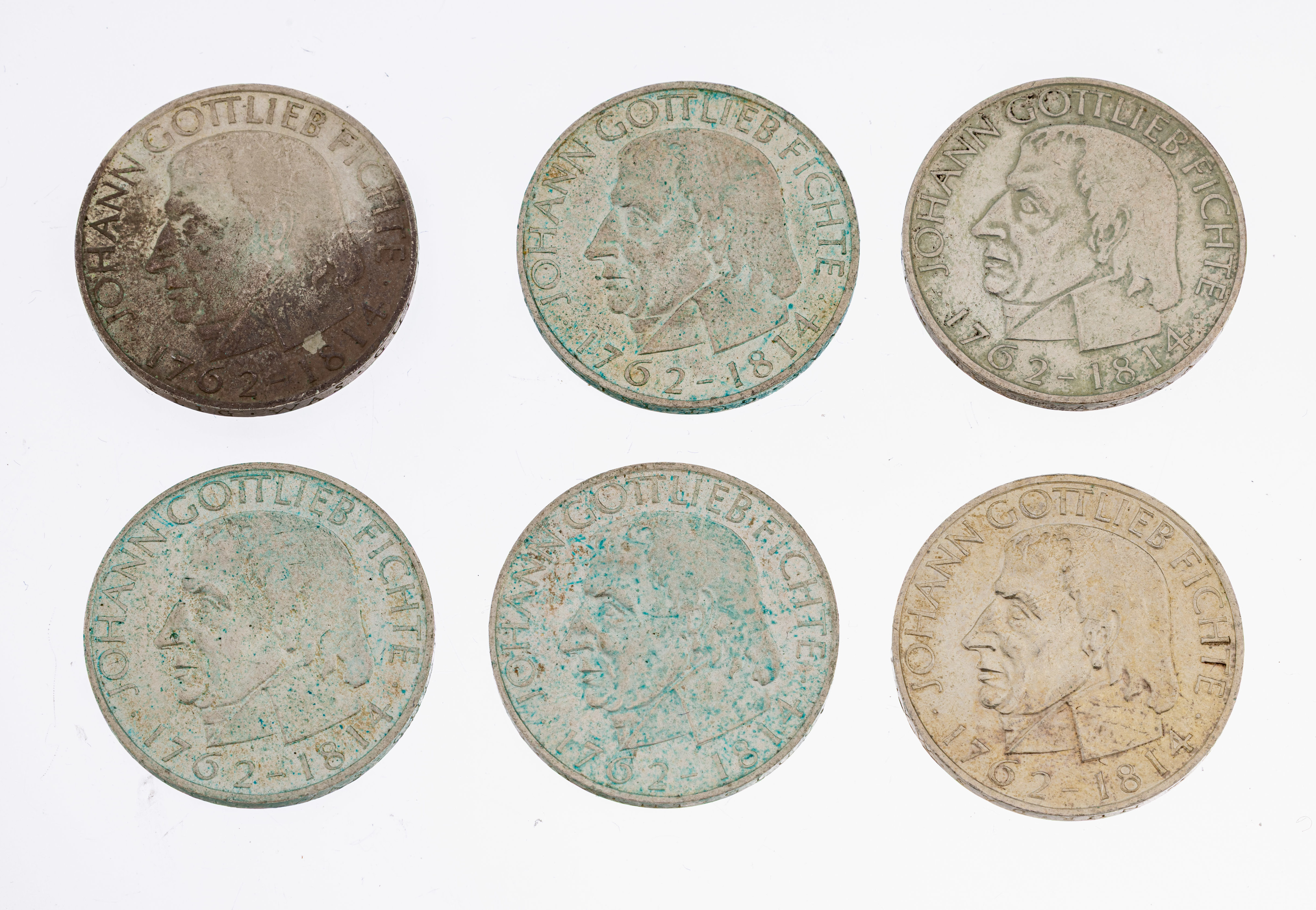 Konvolut 6 Silbermünzen, Deutschland, 1964,6 x 5 Mark Gottlieb Fichte