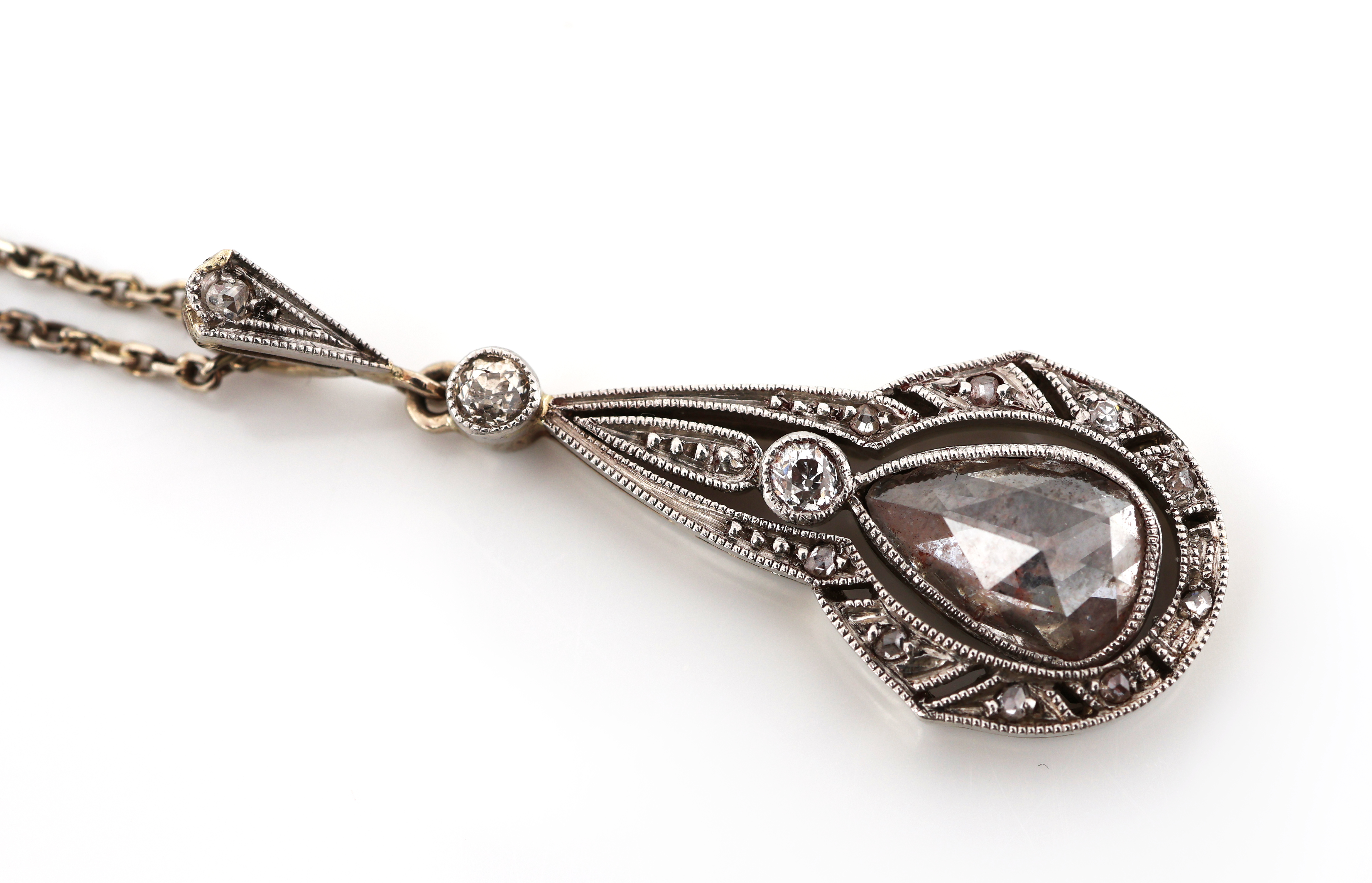 14 kt Gold Diamant-Anhänger, um 1920, WG 585/000 unterlegiert, durchbrochen gearbeitet,mittig
