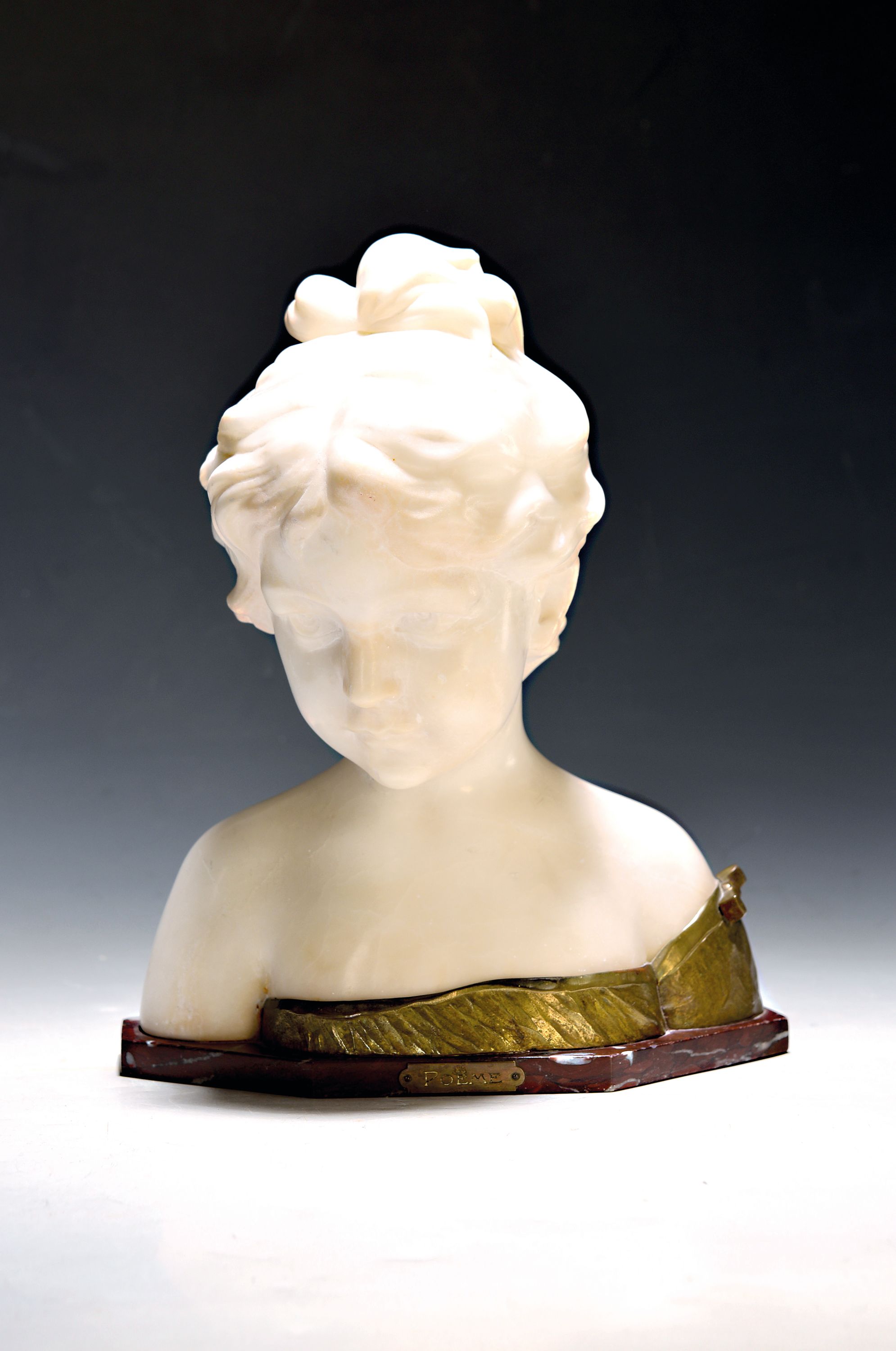 Büste, Italien, um 1900, Alabaster, bez.: Poeme, junge Frau, Metallapplikation als