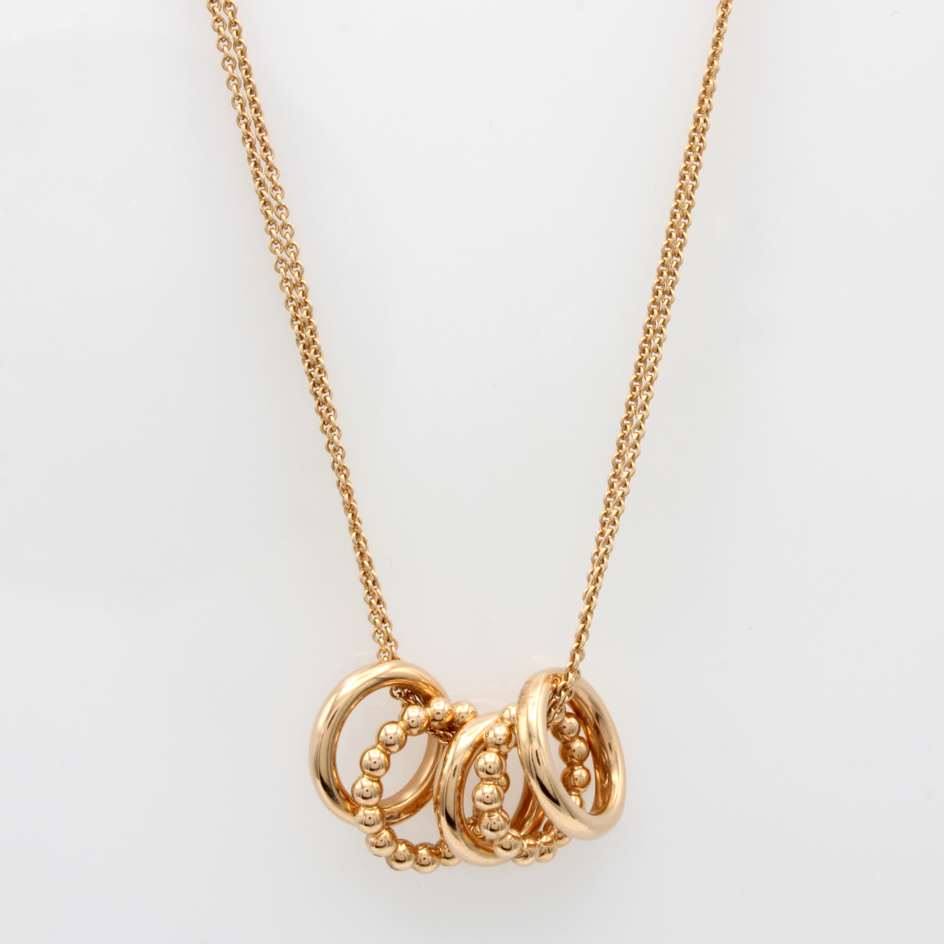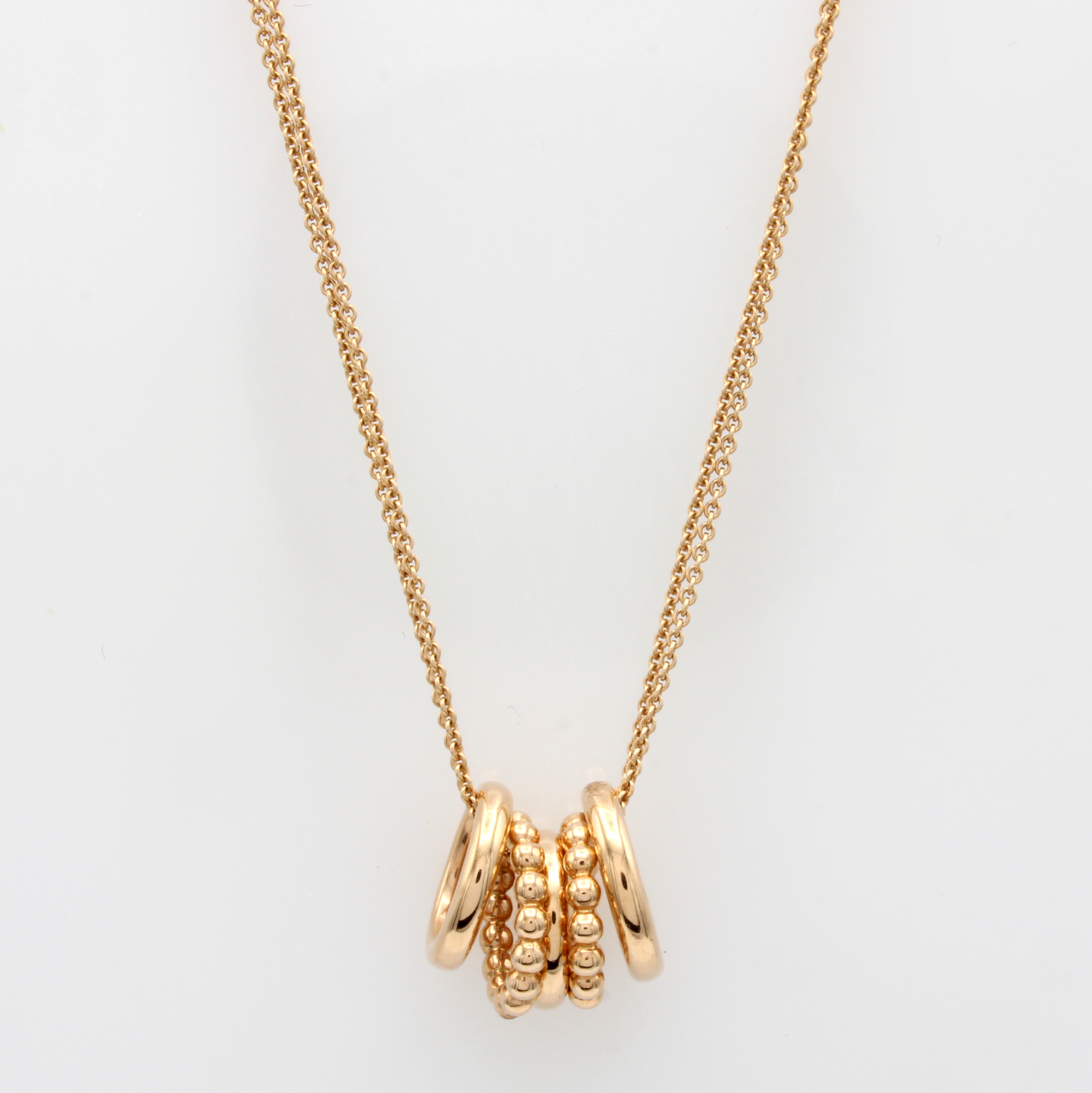 5 runde Anhänger an 2-reihiger Kette, RG 585/000, 2 kreisförm. Anhänger in Kugelmuster, L. ca. 42 cm Schätzpreis: 2590, - EUR