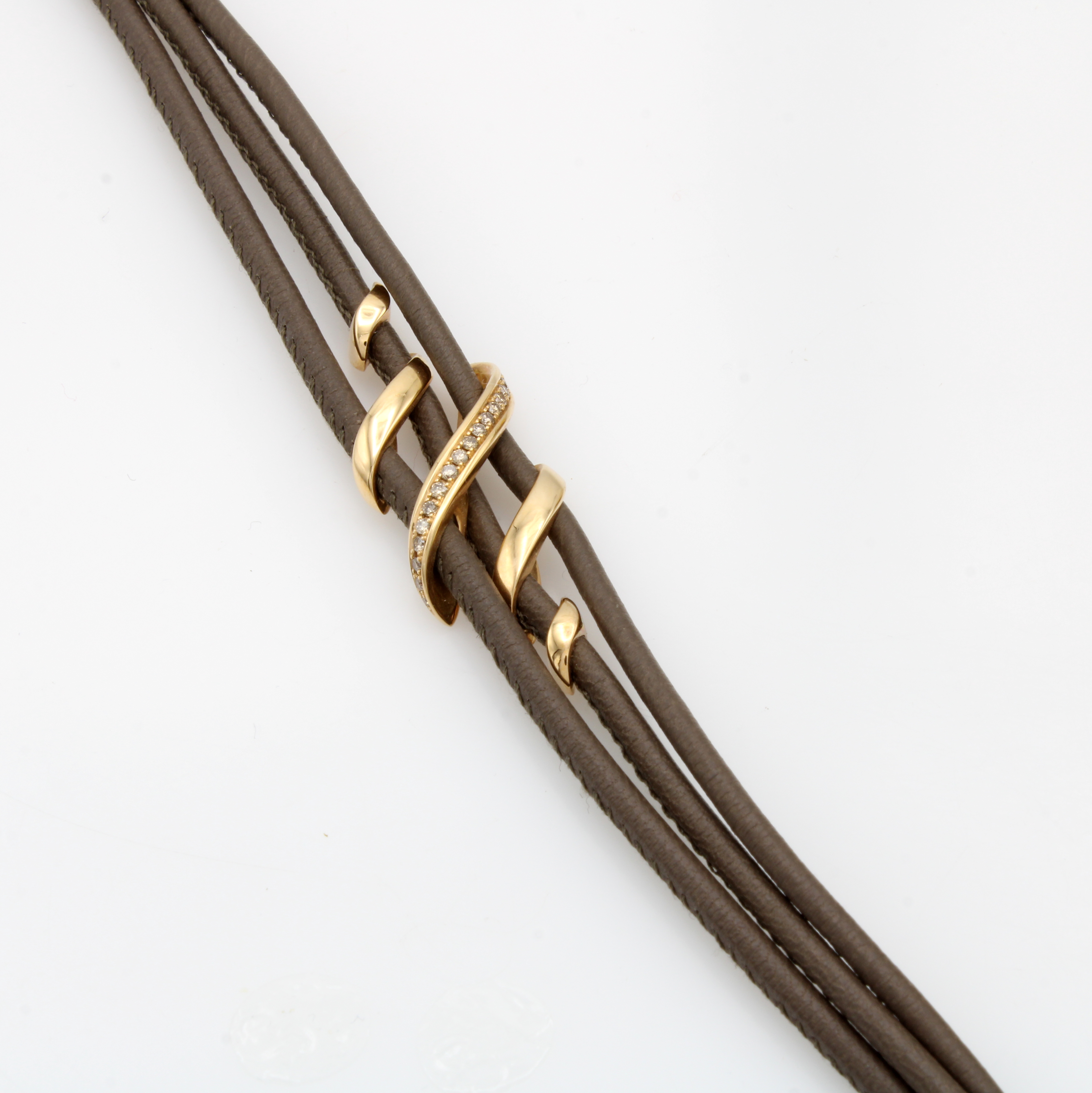 3-reihiges Lederarmband mit Goldoberteil und Brillanten, RG 750/000, Brill. zus. ca. 0.19 ct braun nat./si, L. ca. 18.5 cm Schätzpreis: 3150, - EUR