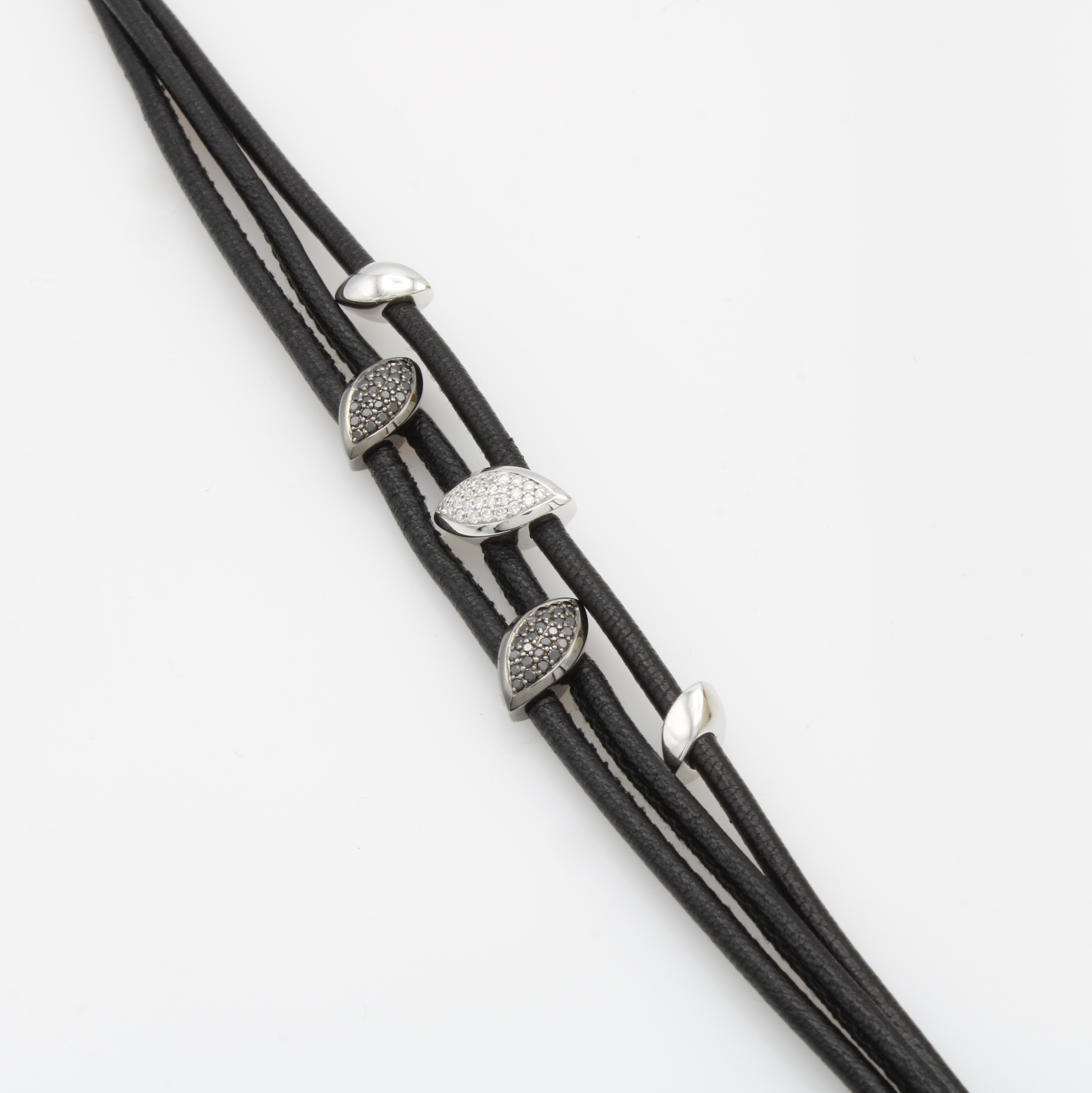 3-reihiges Lederarmband mit Goldelementen und Brillanten, WG 750/000, Brill. zus. ca. 0.15 ct Weiß/si u. 0.30 ct schwarz (beh.), L. ca. 19 cm