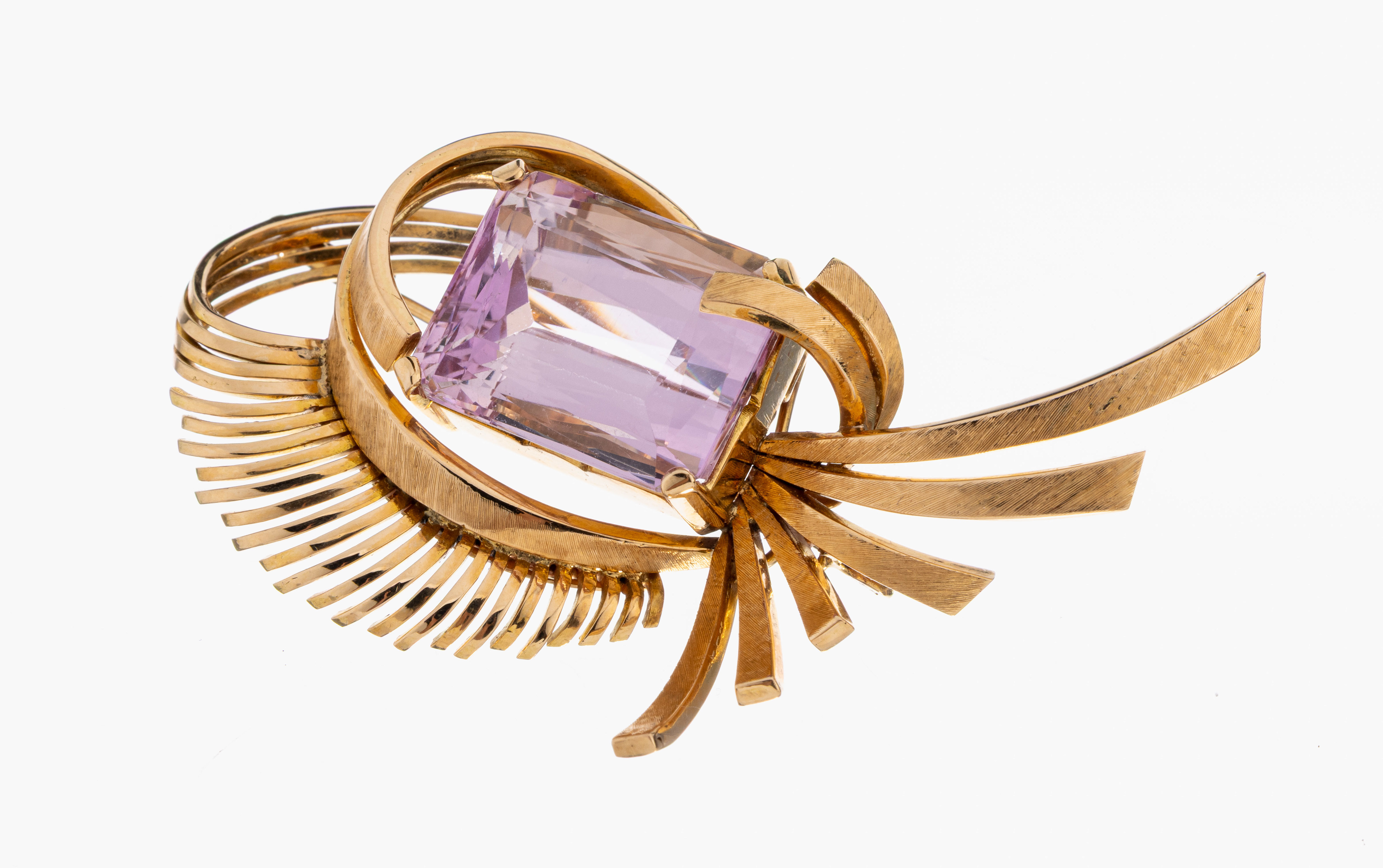 18 kt Gold Kunzit-Brosche, 1950er-60er Jahre, GG 750/000 gepr., sehr hochwertige