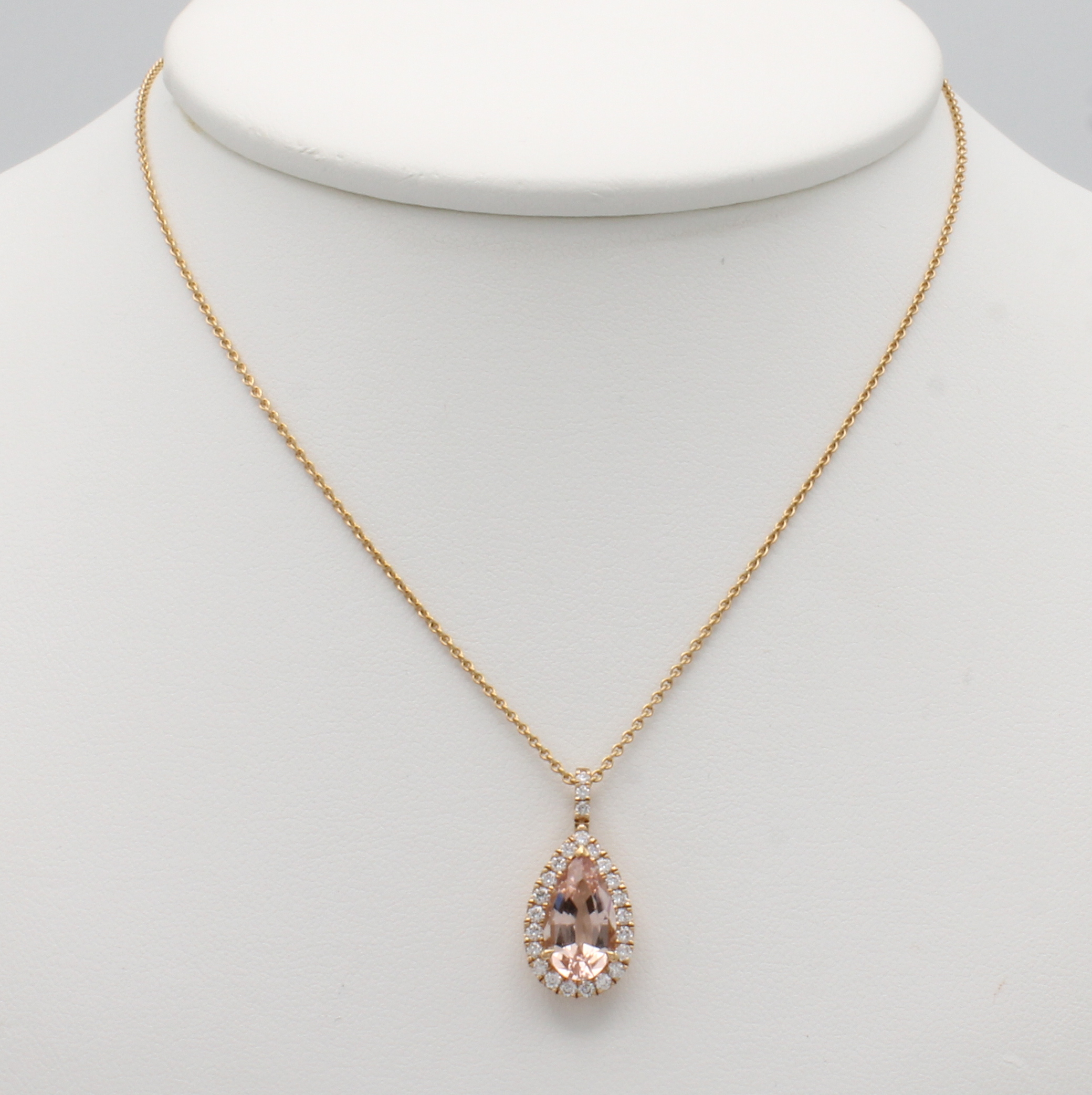 Anhänger mit Morganit und Brillanten an Kette, RG 750/000, Morganittropfen ca. 2.0 ct, Brill. zus. ca. 0.838 ct feines Weiß/vs, L. ca. 44 cm Schätzpreis: 3650, - EUR