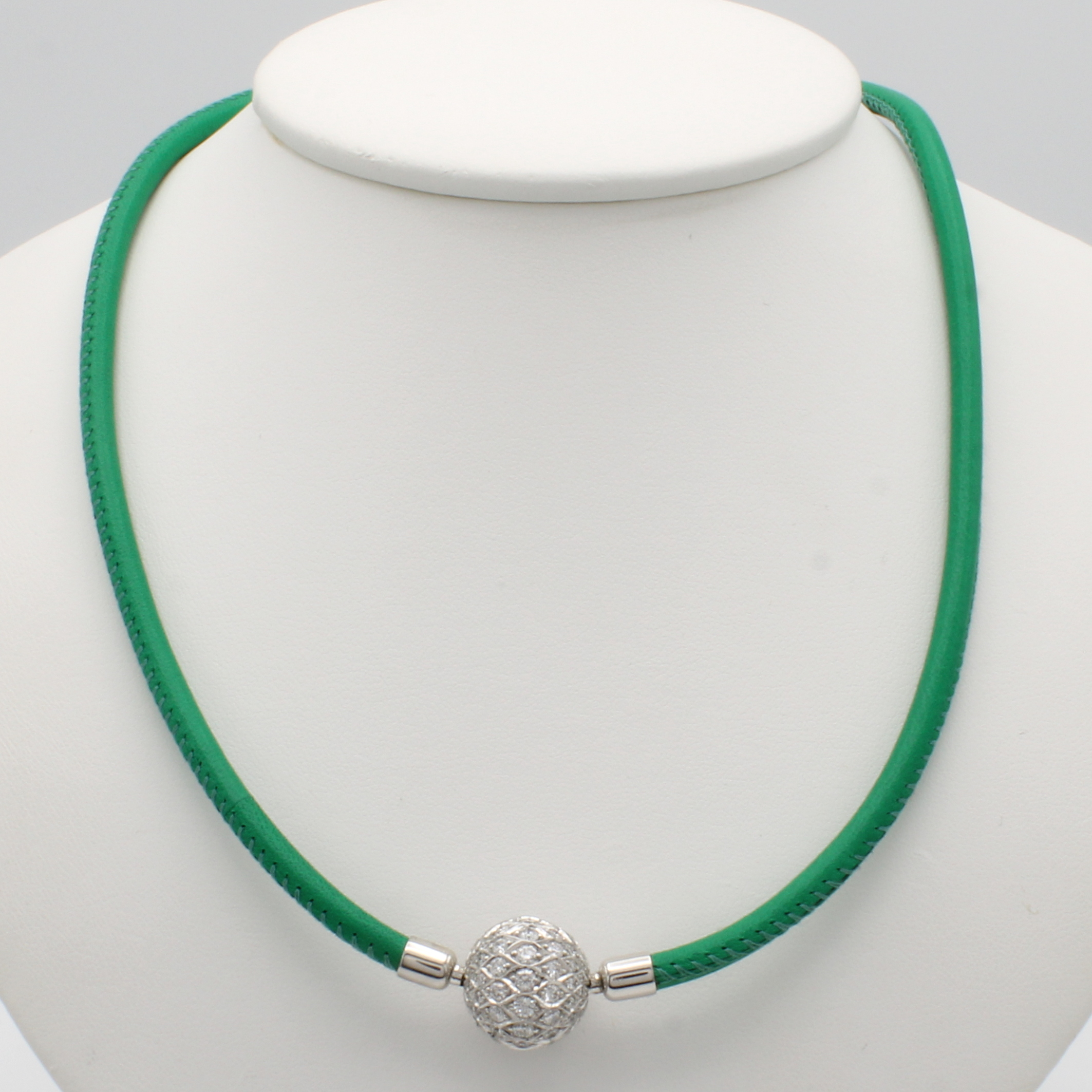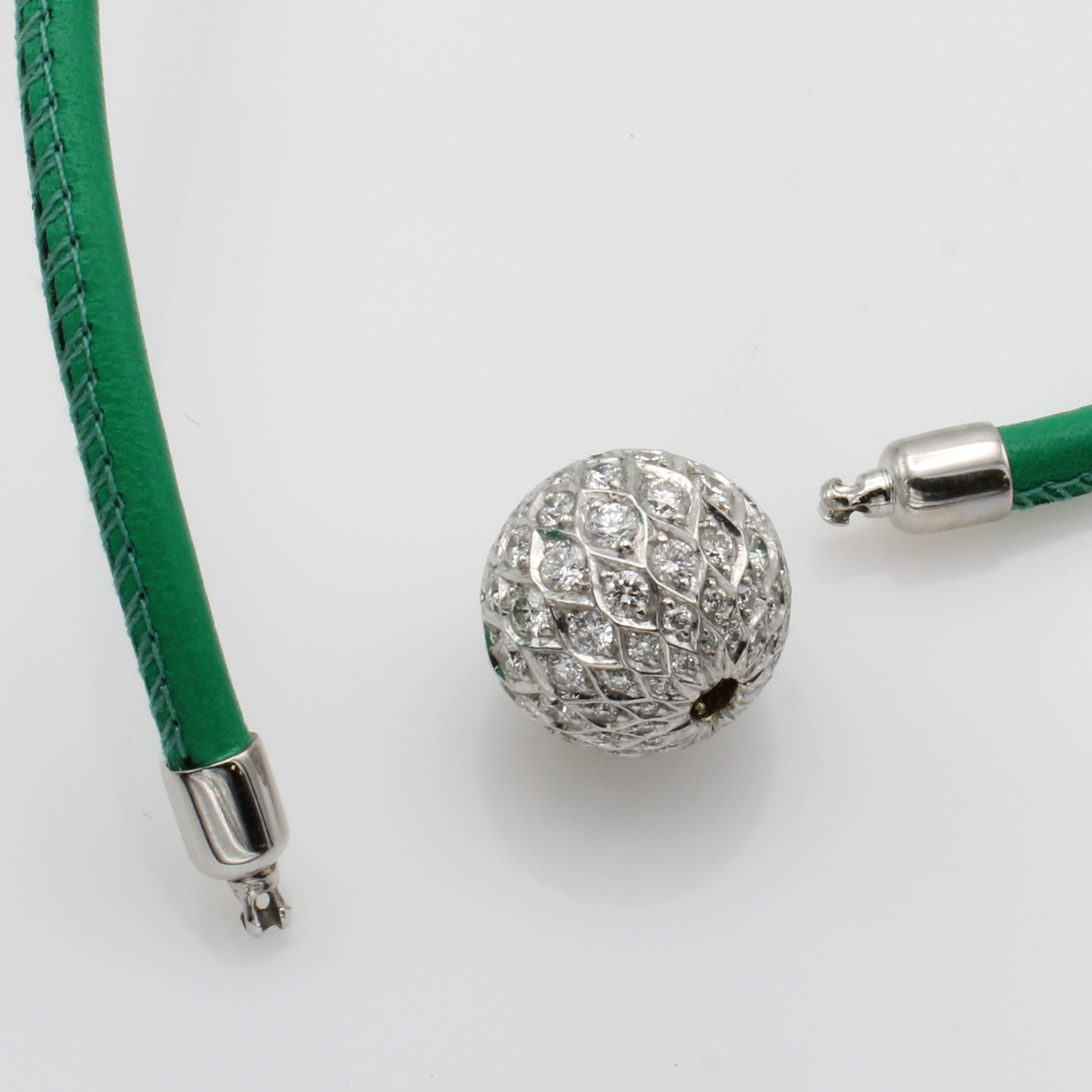 Schmuckschließe mit Brillanten an Nappaleder- collier, WG 750/000 Wechselkugelschließe bes. m. Brill. zus. ca. 3.20 ct feines Weiß/si, L. ca. 44.5 cm Schätzpreis: 17800, - EUR