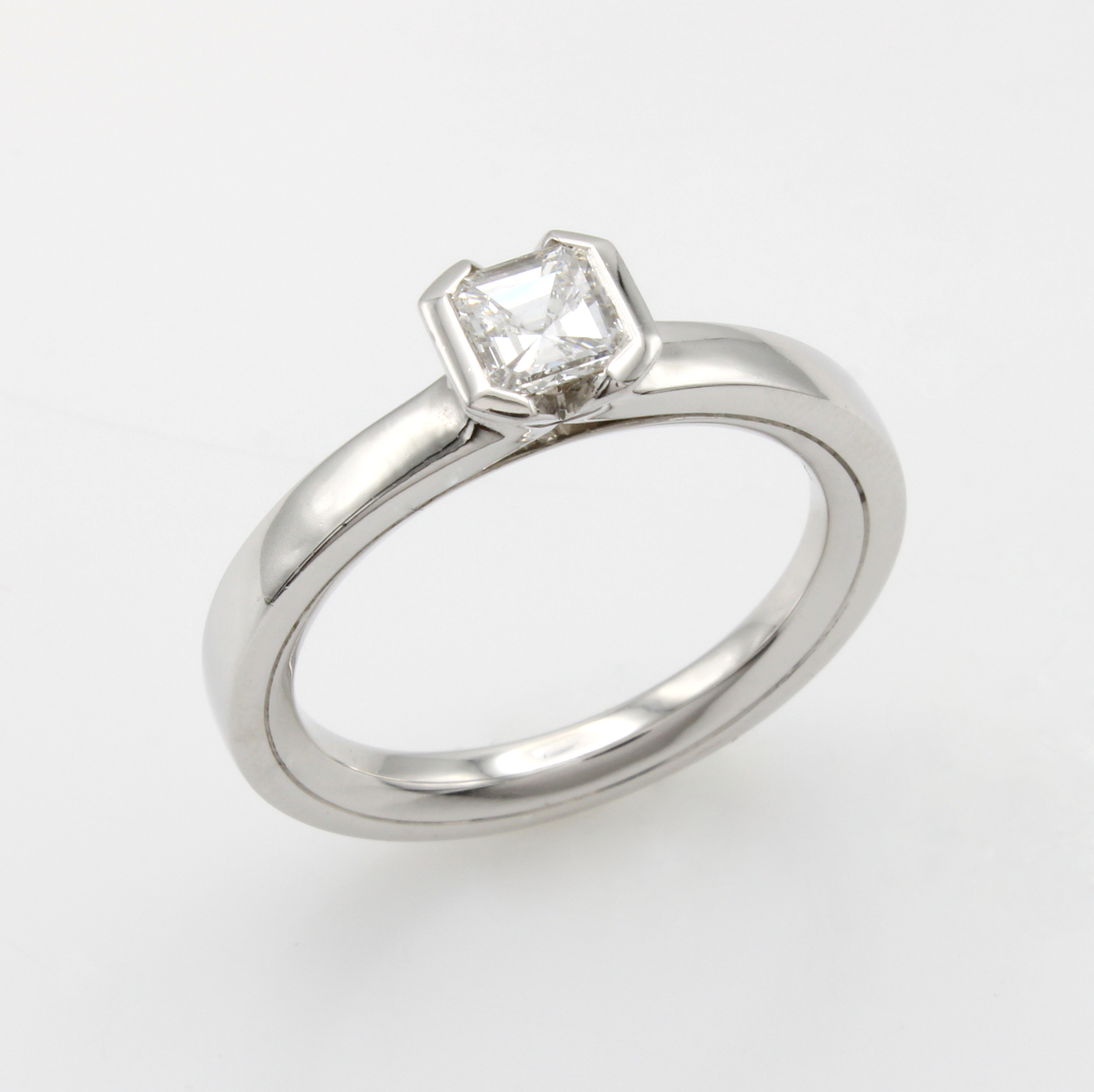 Ring mit Diamant, WG 750/000, Diam. im Asher-Cut ca. 0.53 ct feines Weiß/vs, RW ca. 55 Schätzpreis: 7490, - EUR