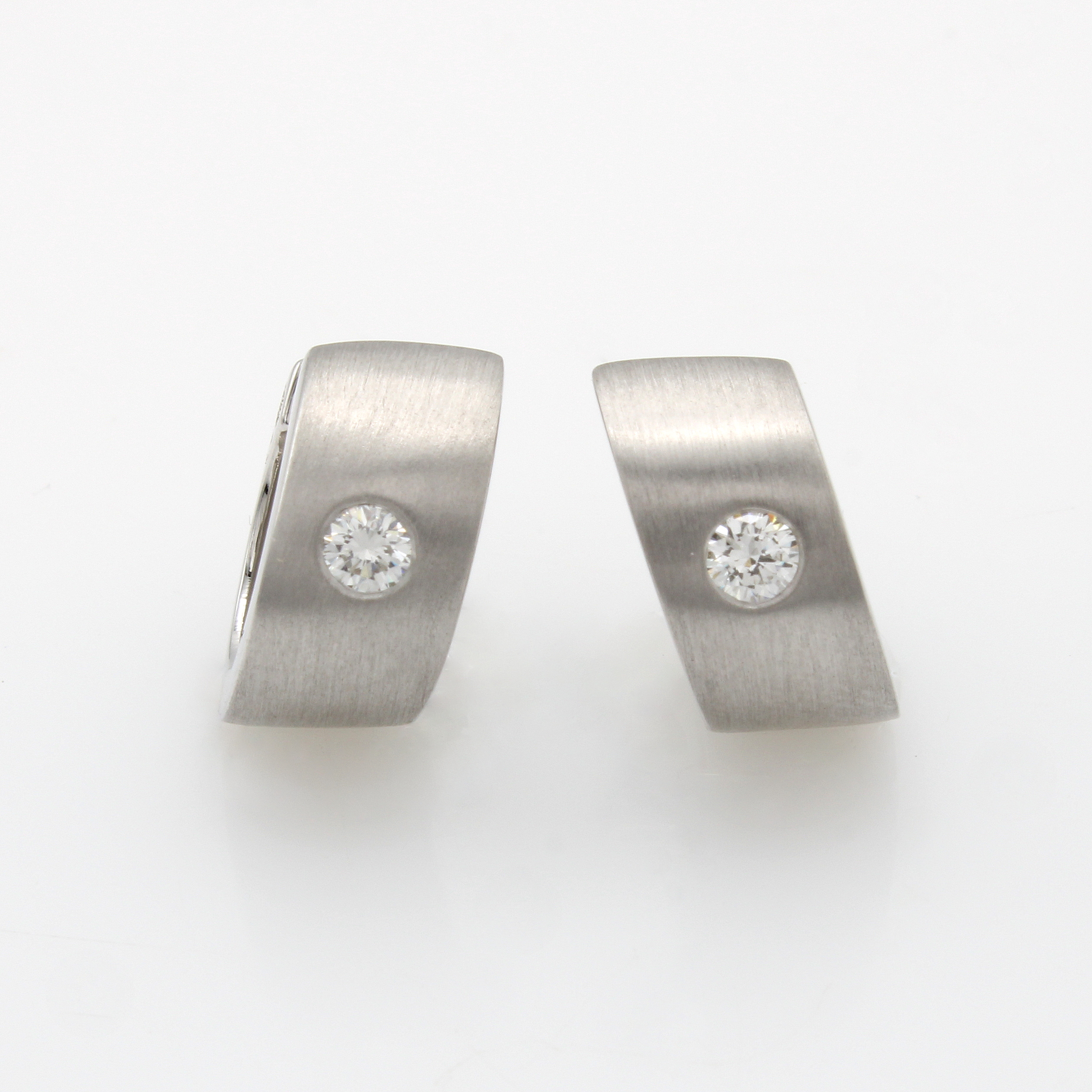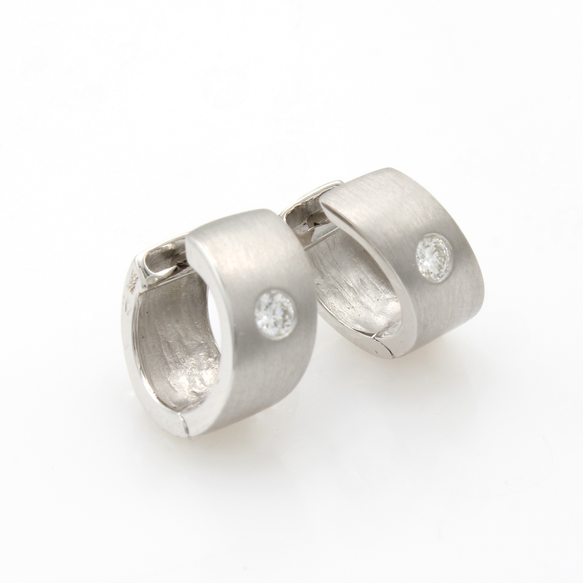 Paar Creolen mit Brillanten, WG 585/000, z.T. matt., 2 Brill. zus. ca. 0.14 ct Weiß/si,Br. 5.5 mm, D. ca. 12 mm