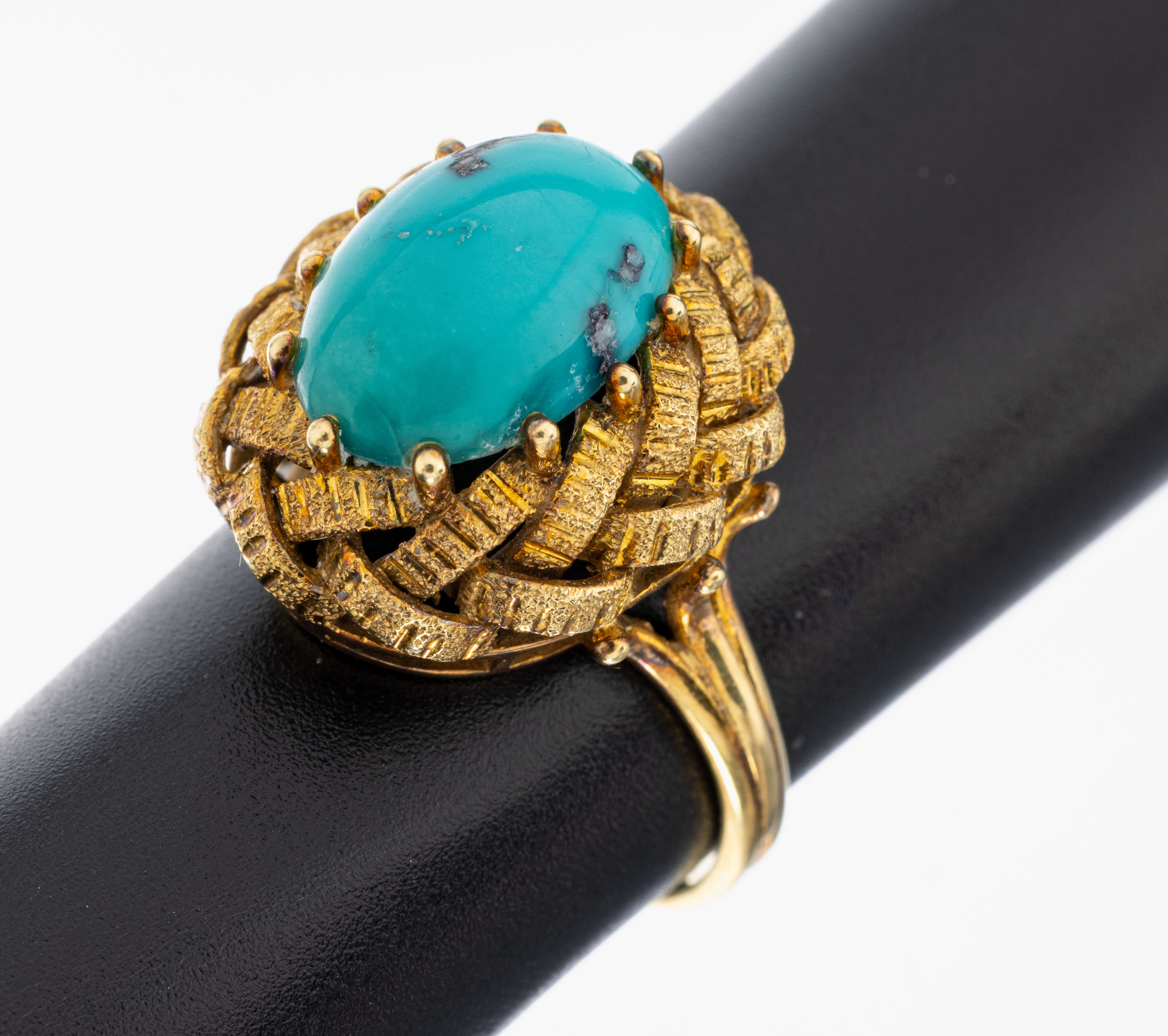 14 kt Gold Türkis-Ring, GG 585/000, ovaler Türkiscabochon, Ringkopf reich verz., RW 56, ca. 6.5 g