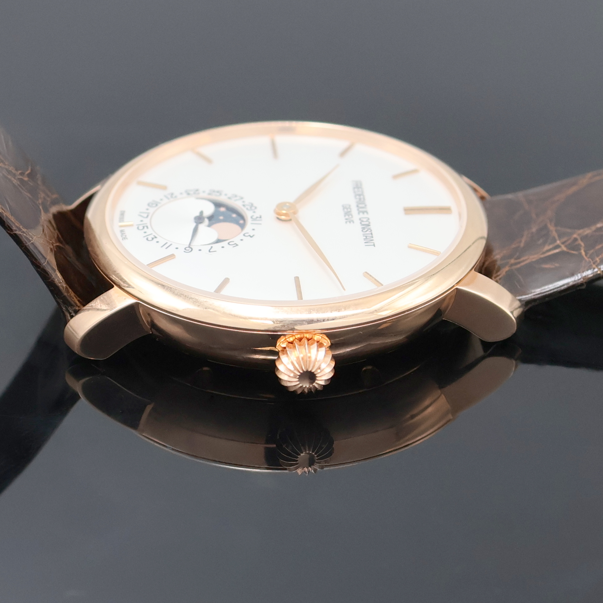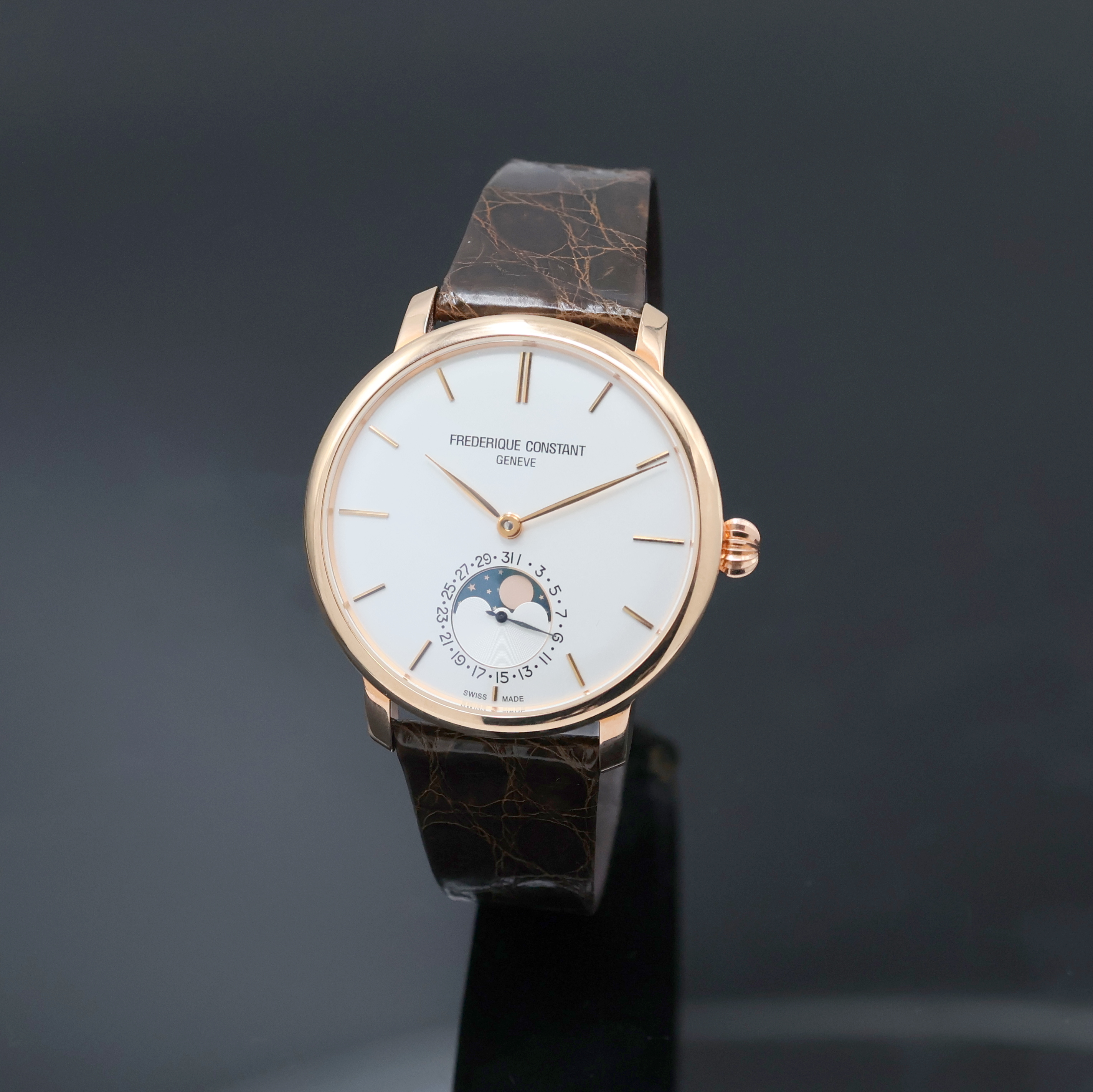 FREDERIQUE CONSTANT vergoldete Herrenarmbanduhr mit Mondphase Referenz FC- 705X4S4/5/6, Automatik, beids. vergl. Geh., Boden verschr., silb. Zifferbl. m. gold. Std.-Ind. u. Zeigern, Mondphase u. Datum b. 6, D. ca. 42 mm, EZ 2
