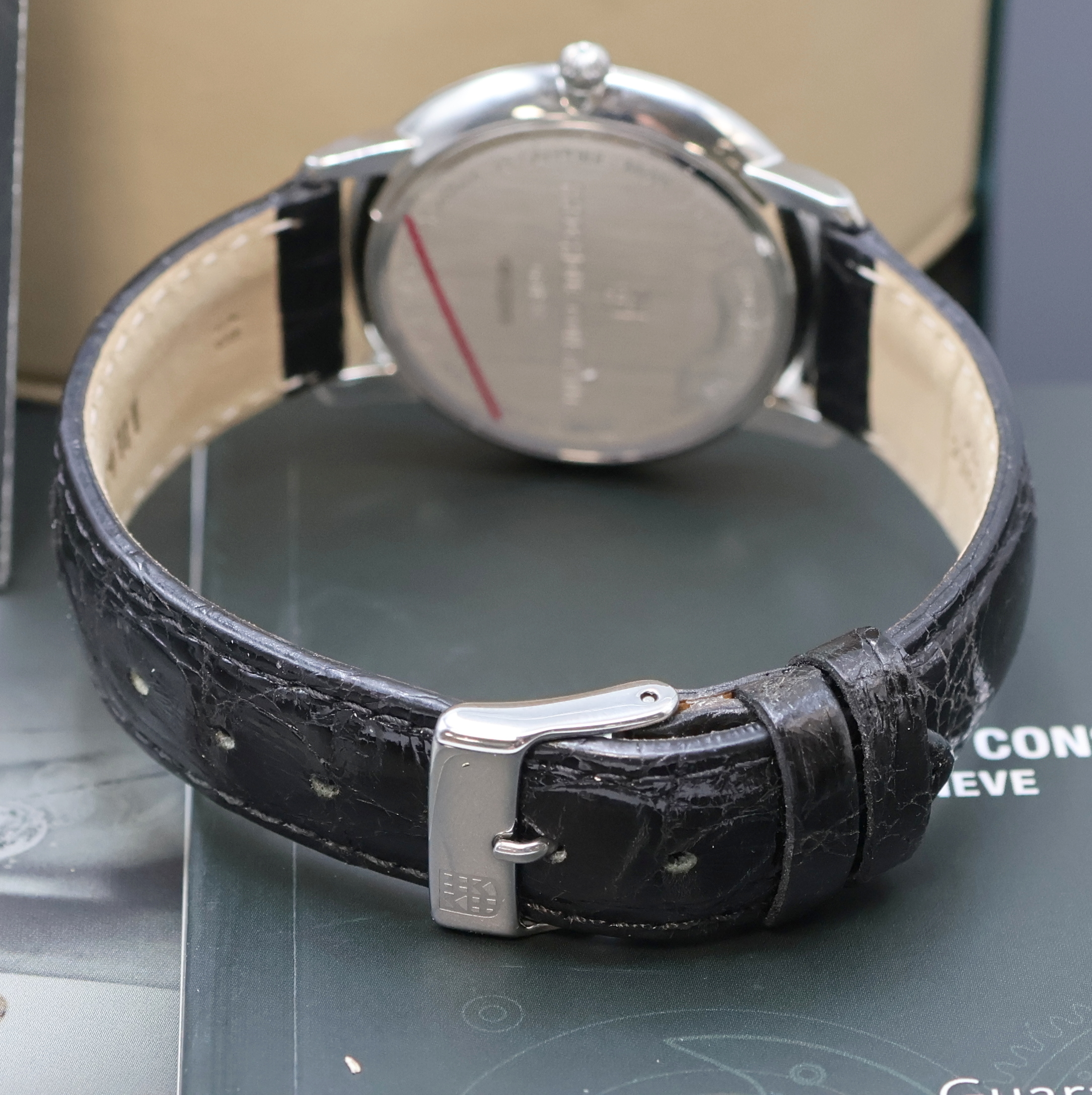 quarz, Edelstahlgeh. inkl. neutr. Lederband m. orig. Dornschl., Boden gedr., Lünette