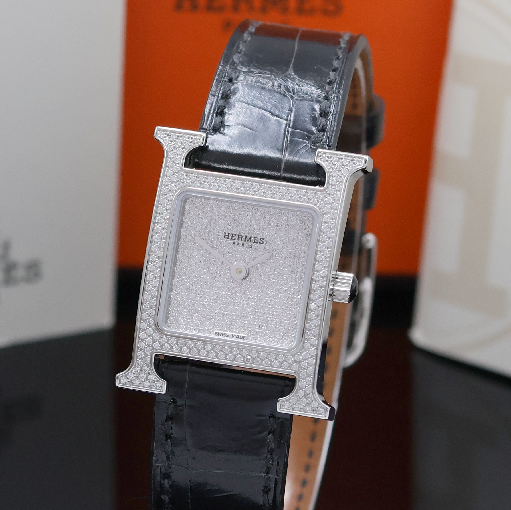 HERMES Heure H diamantbesetzte Armbanduhr in Stahl Referenz HH1.236, quarz, orig. Lederband m. Dornschl., Boden 4-fach verschr., Geh. sowie Zifferbl. m. Diamanten bes., silb. Zeiger, M. ca. 30 x 22 mm, Hermes Etui u. unausgef. Pap. anbei, EZ 2