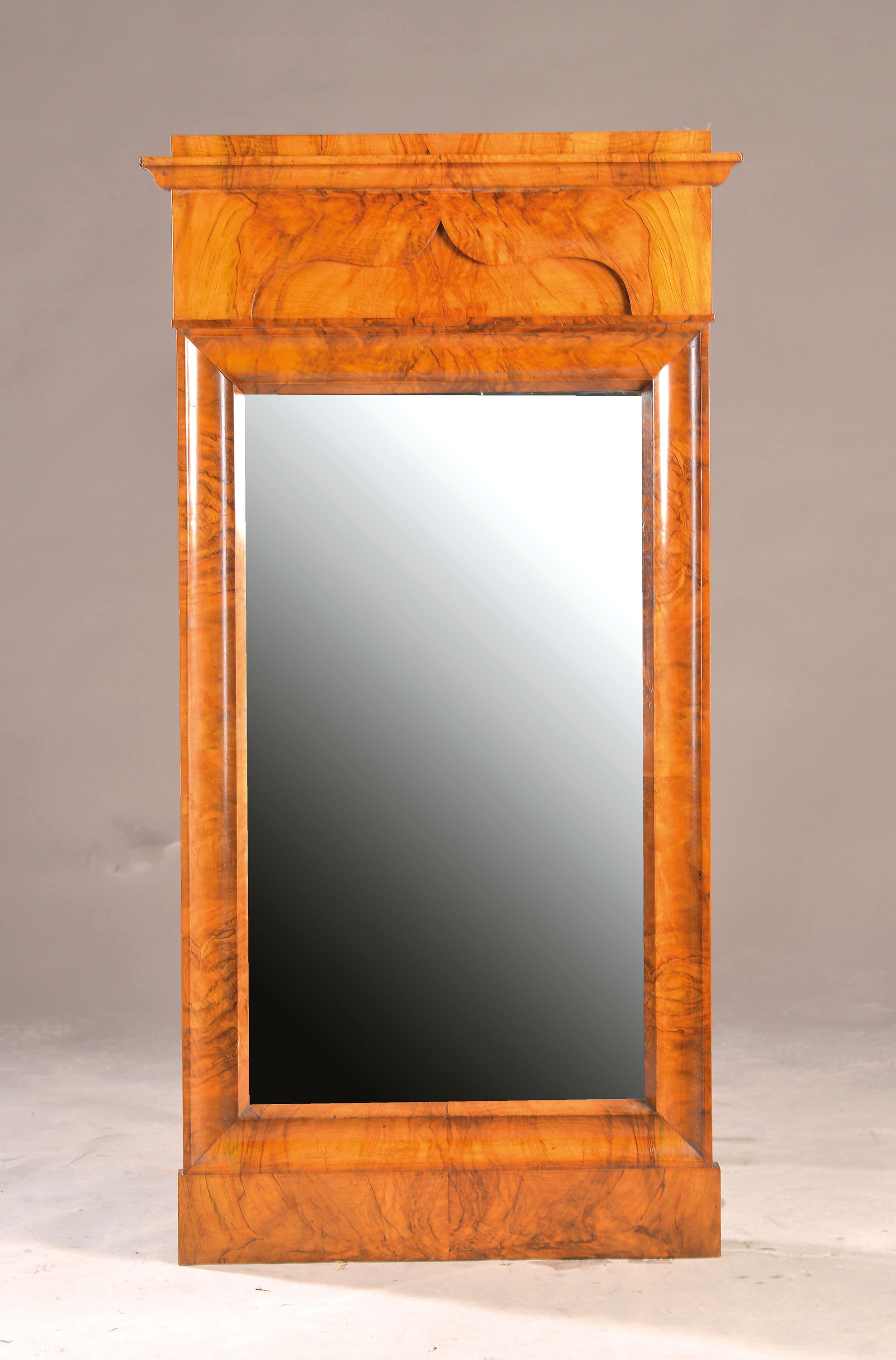 Biedermeier-Spiegel, um 1825, Nußbaumfurnier, Oberteil mit ausgeschnittenem Segmentbogen,
