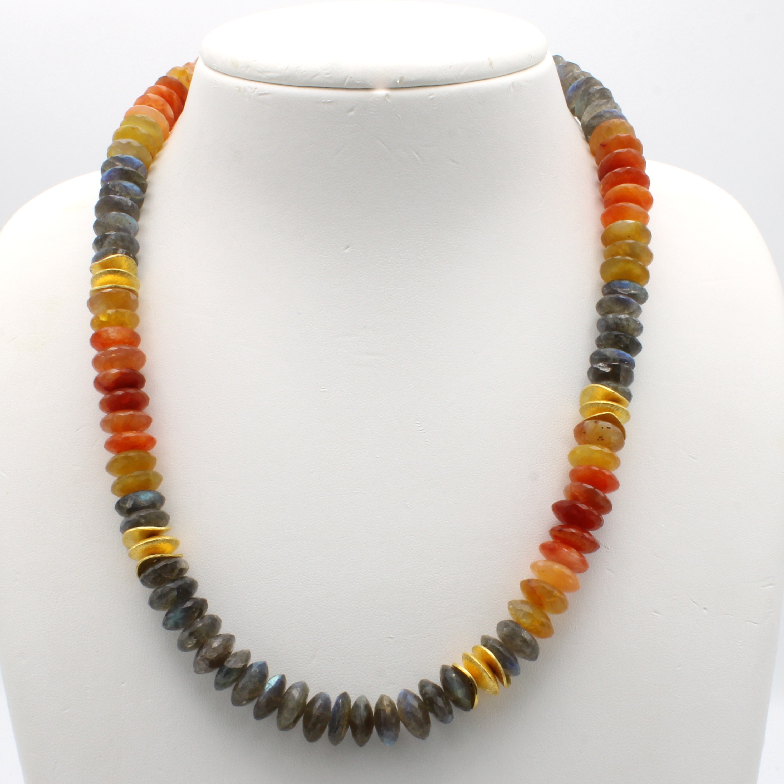 Collier aus Farbsteinen, Schließe und Zwischenteile Silber verg., Labradorit und Karneollinsen z.T. im Farbverlauf, L. ca. 55 cm