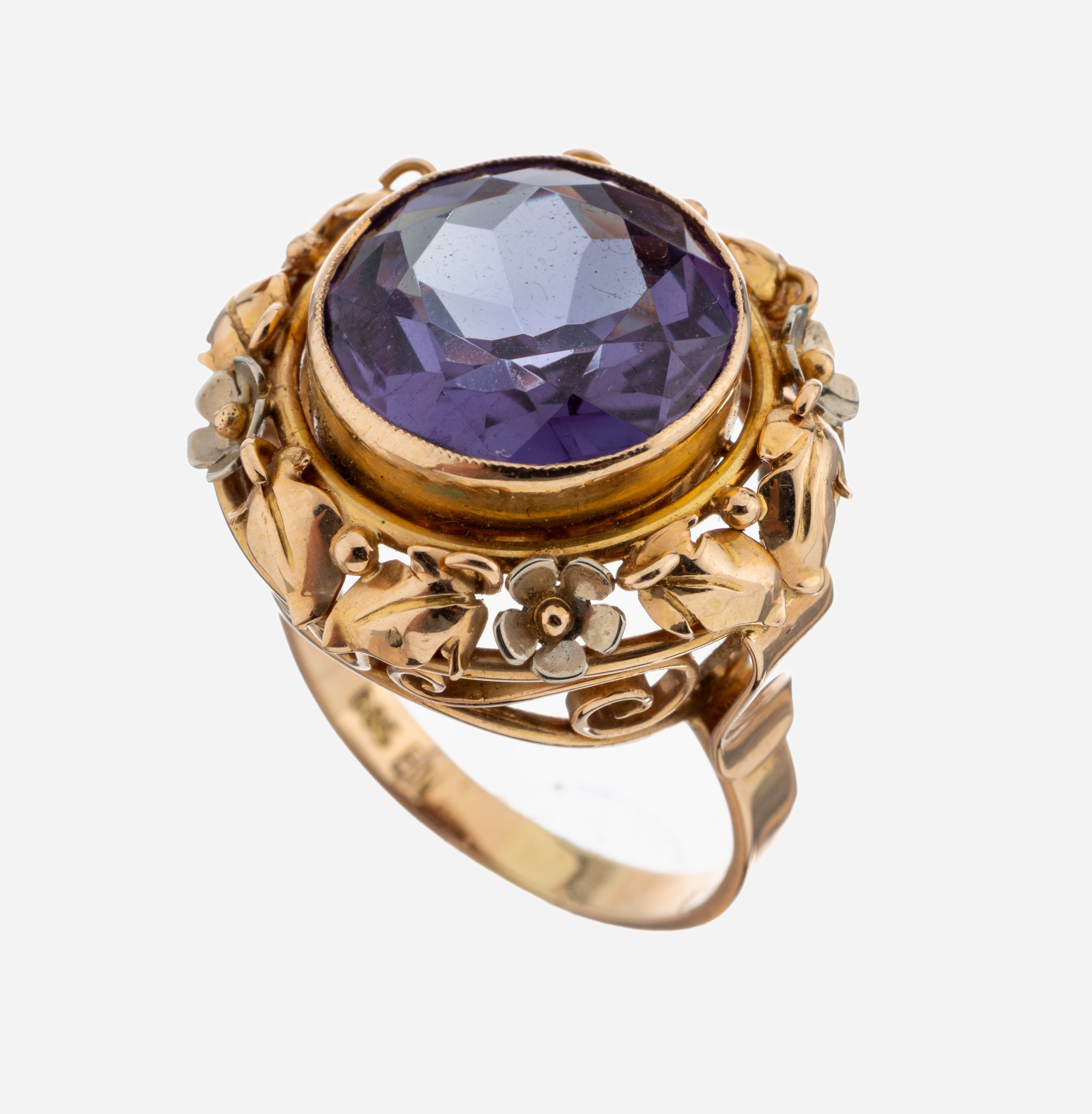 14 kt Gold Farbstein-Ring, 1950er Jahre, GG/WG 585/000, mittig rundfacett. synth.