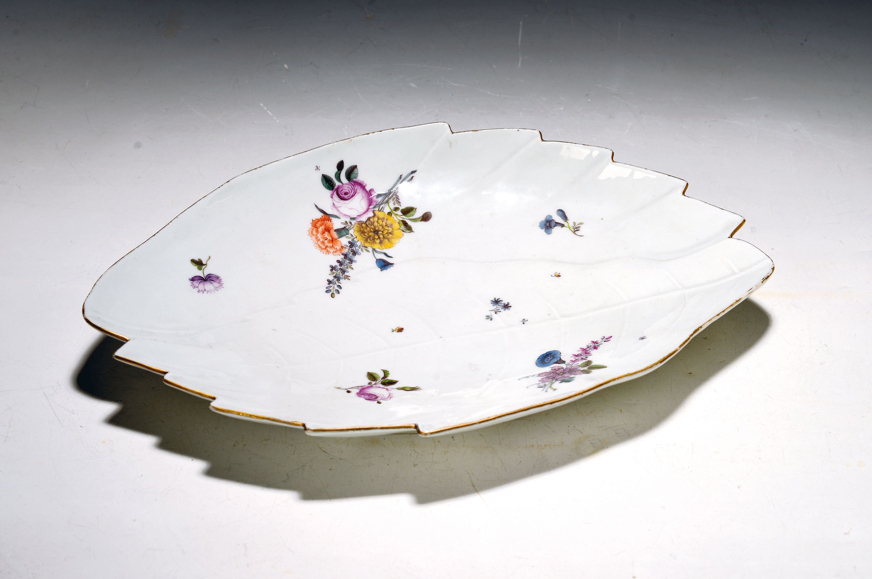 Große Blattschale, Meissen, um 1750, Porzellan, polychrom bemalt, Entwurf J.J. Kaendler,