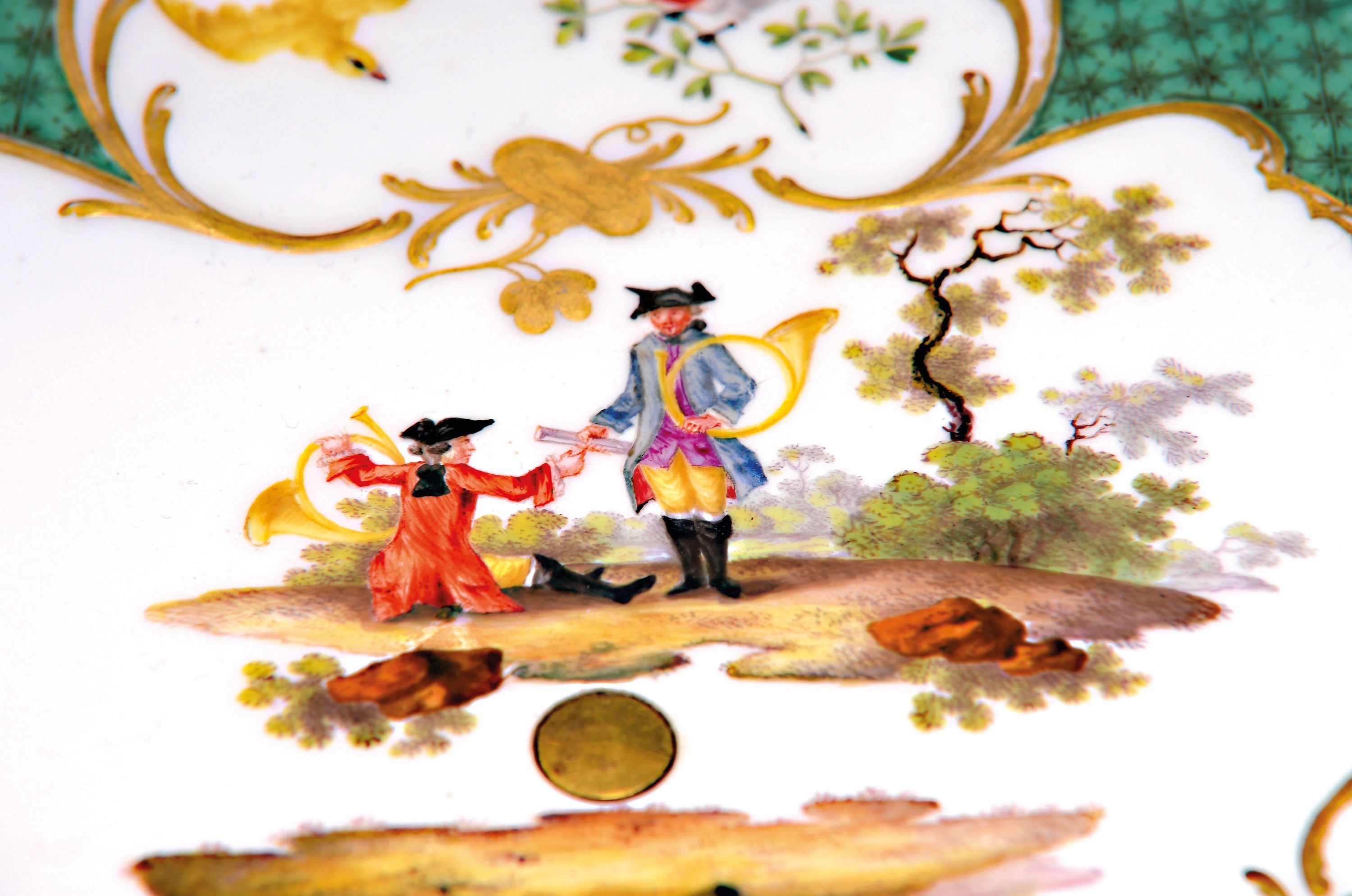 in gold gefassten Reserven, Vögel, Obst und Blumenmalerei, mittig Jagdszene mit