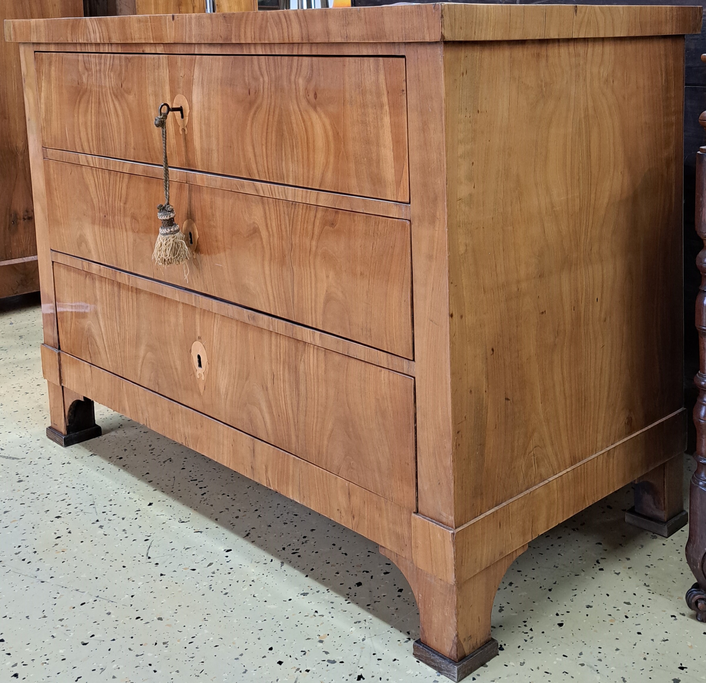 Biedermeier-Kommode, um 1820, Kirschbaumfurnier, 3 Schubladen, Pfostenfüsse in schwarz