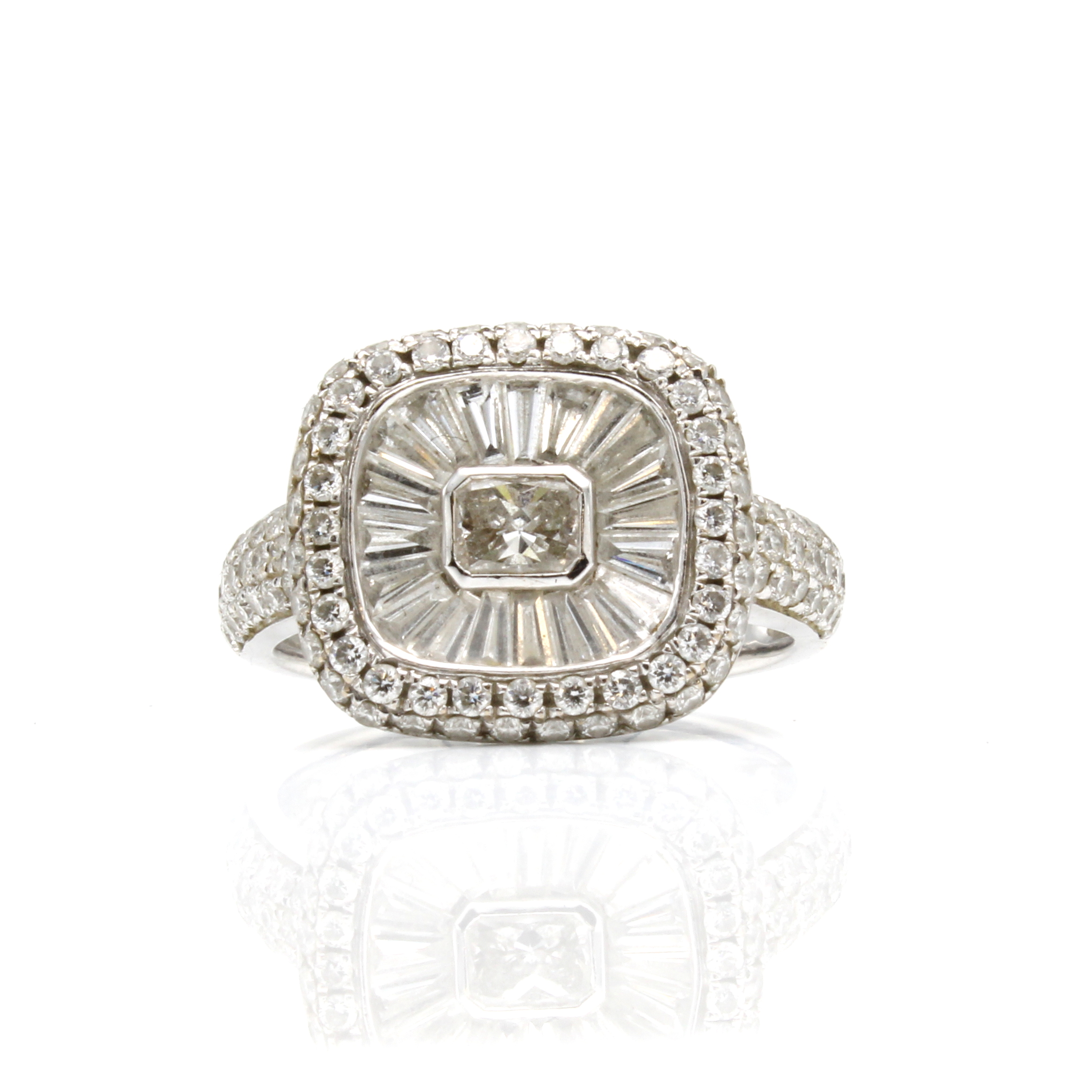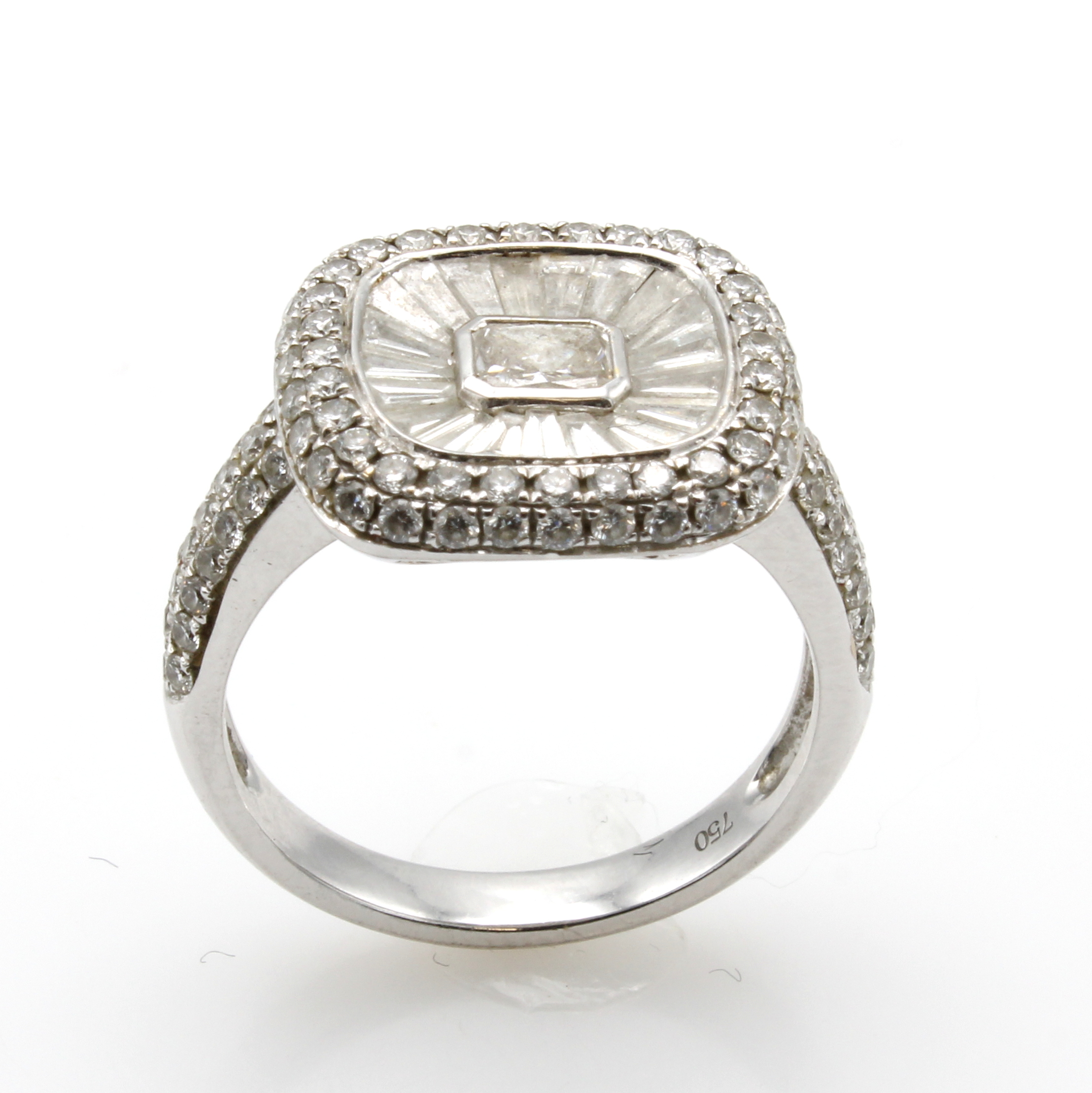 Ring mit Diamanten und Brillanten, WG 750/ 000, 1 Diam.-Radiant ca. 0.34 ct, 20 Diam.- Triangeln zus. ca. 0.66 ct und Brill. zus. ca. 0.92 ct feines Weiß/vs, RW ca. 56
