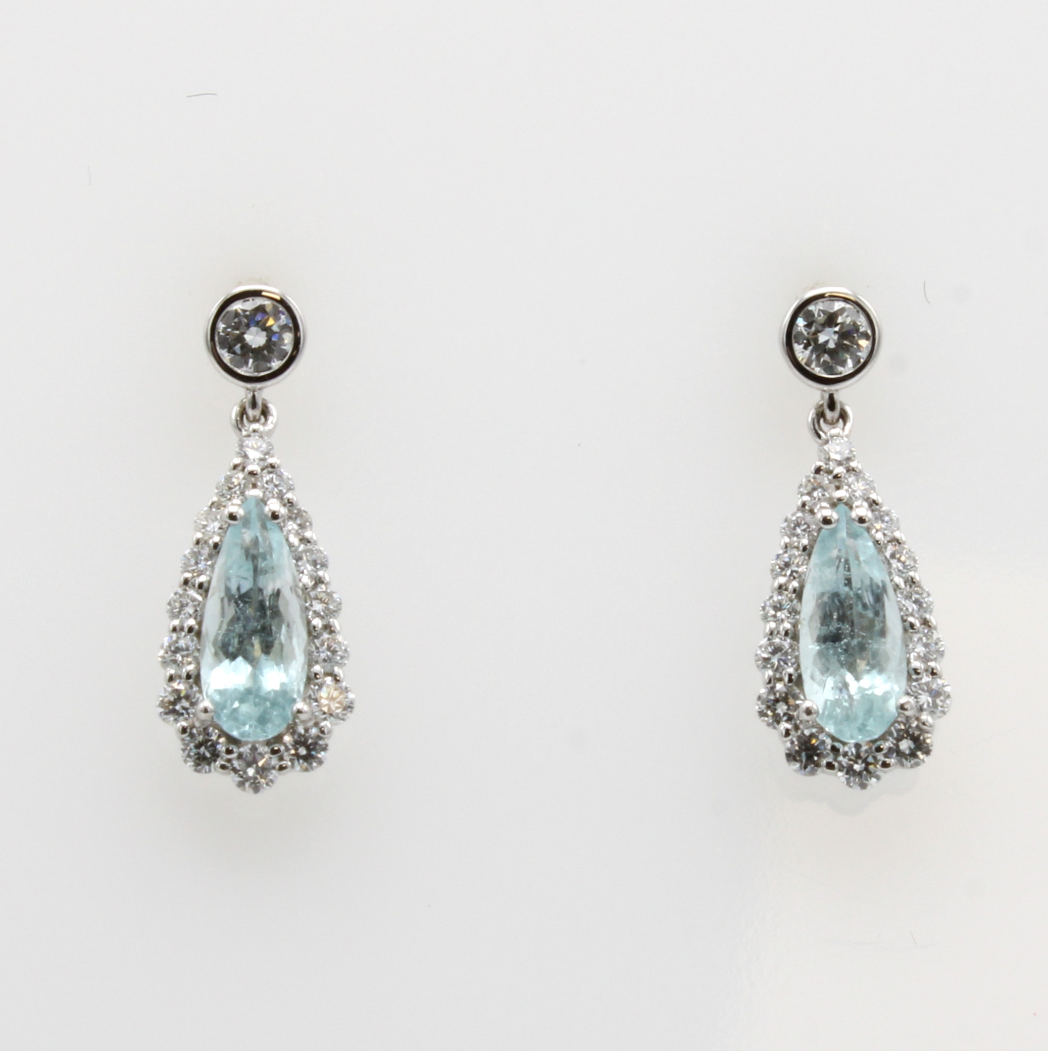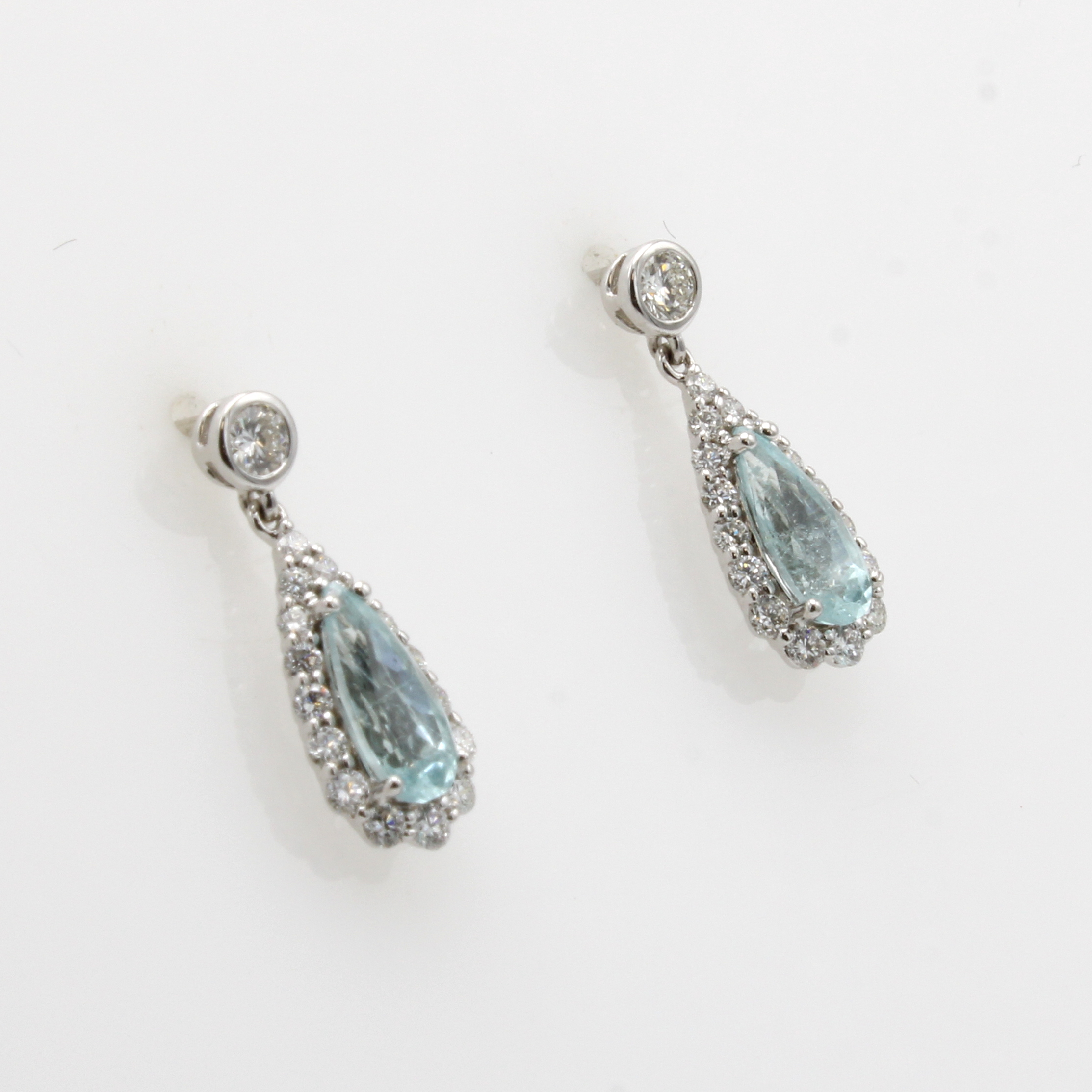 Paar Ohrgehänge mit Paraibatropfen und Bril- lanten, WG 750/000, Paraibas zus. ca. 1.16 ct u. Brill. zus. ca. 0.62 ct feines Weiß/vs
