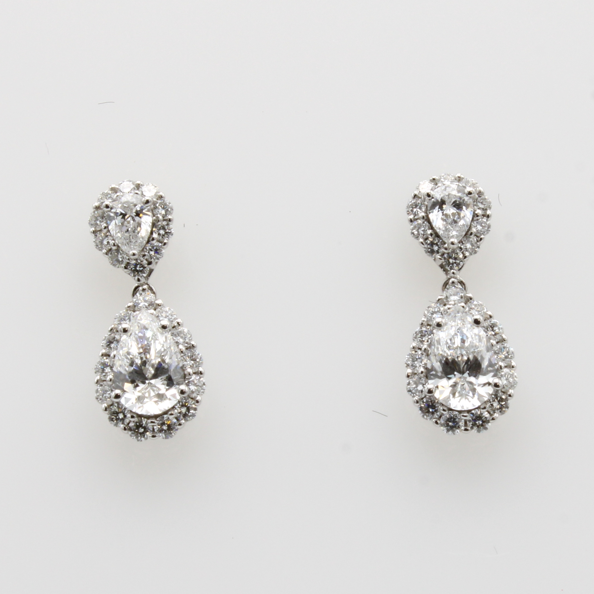 Paar Ohrgehänge mit Diamanten und Brillanten, WG 750/000, 2 Diam.-Tropfen zus. ca. 1.02 ct hochfeines Weiß(E)/vs2 mit Expertise, 2 Diam-tropfen zus. ca. 0.26 ct und 46 Brill. zus. ca. 0.56 ct feines Weiß/vs