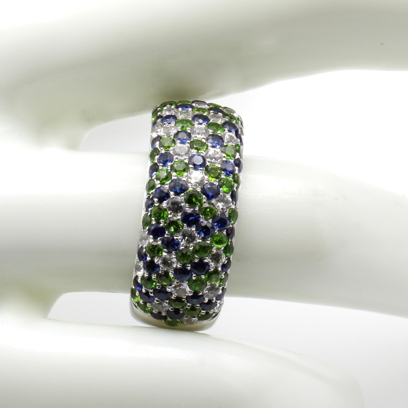 Ring mit Farbsteinen, WG 750/000, 45 blaue Saphire zus. ca. 0.99 ct, 30 weiße Saphire zus. ca. 0.67 ct, 46 Chromdiopside zus. ca. 0.97 ct, RW ca. 55 Schätzpreis: 4900, - EUR