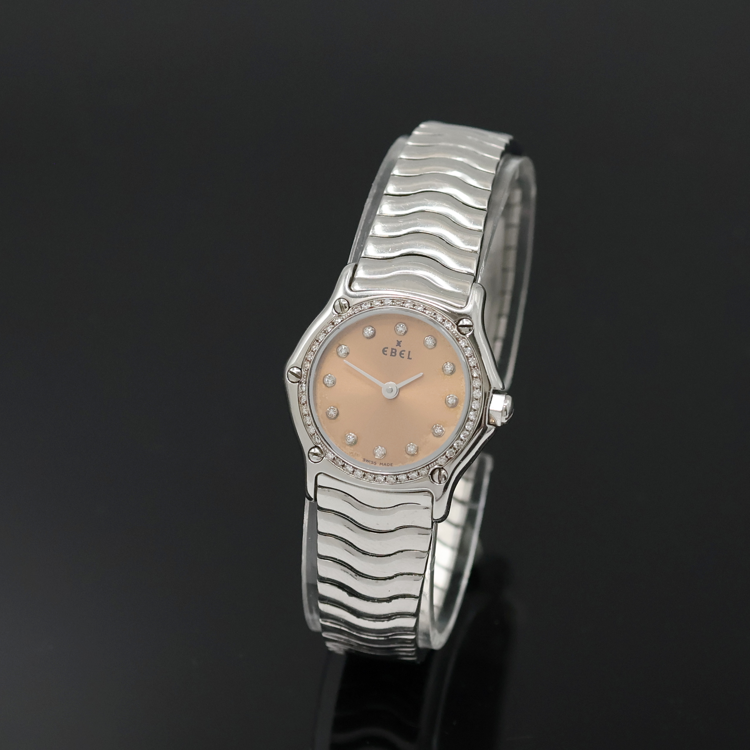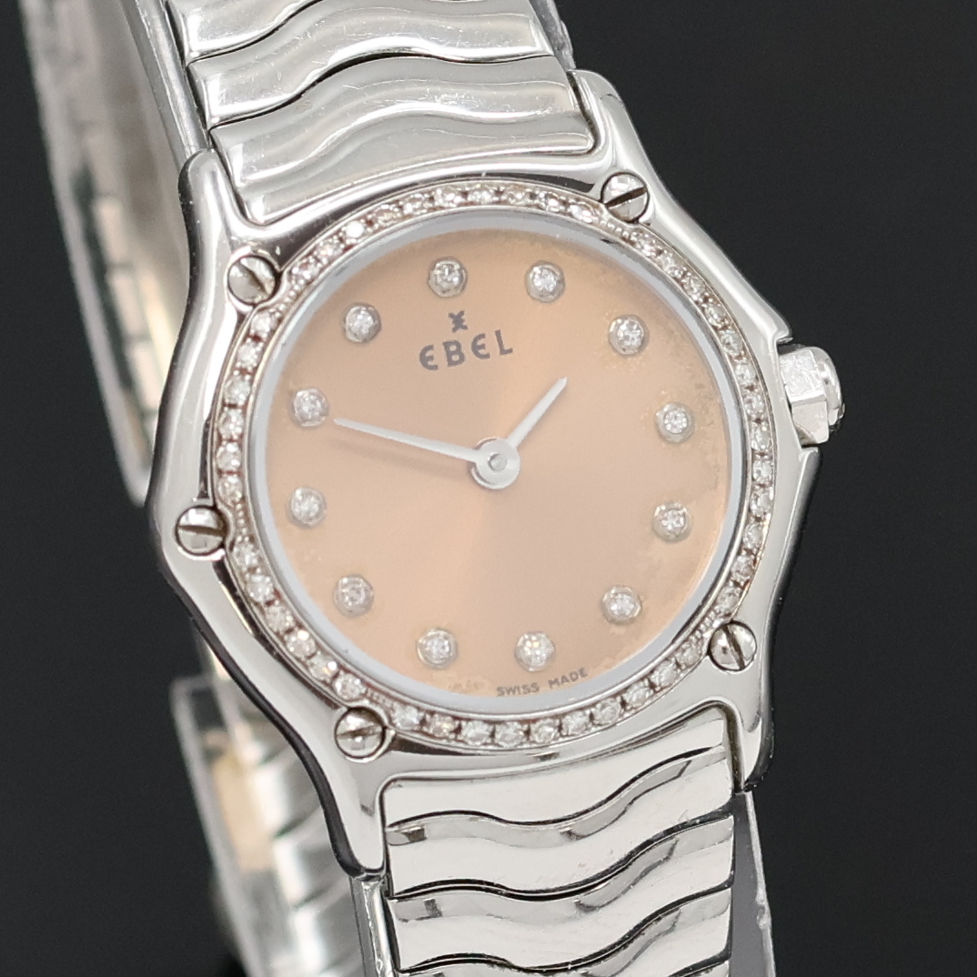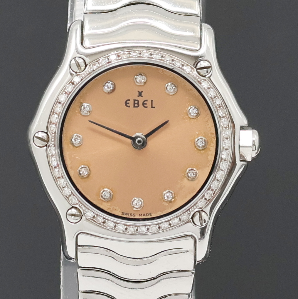 EBEL Damenarmbanduhr Classic Sport Lady Referenz 9157112, quarz. Edelstahlgeh. inkl. Wellengliederband m. Faltschl., kupferfarb. Zifferbl. wie 5-fach verschr. Lünette m. Brillantbesatz, Anz. v. Std. und Min., D. ca. 23 mm, L. ca. 16 cm, EZ 2