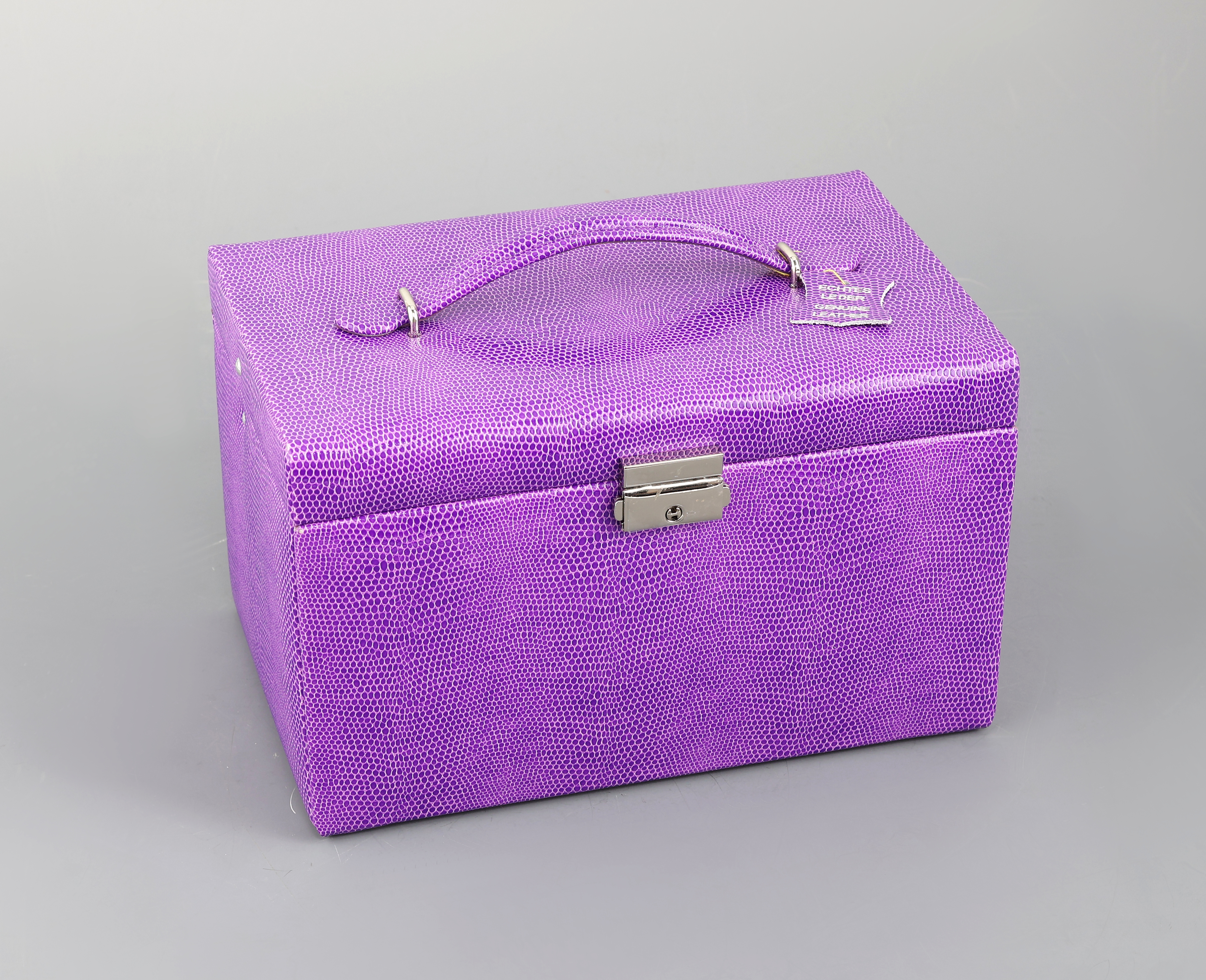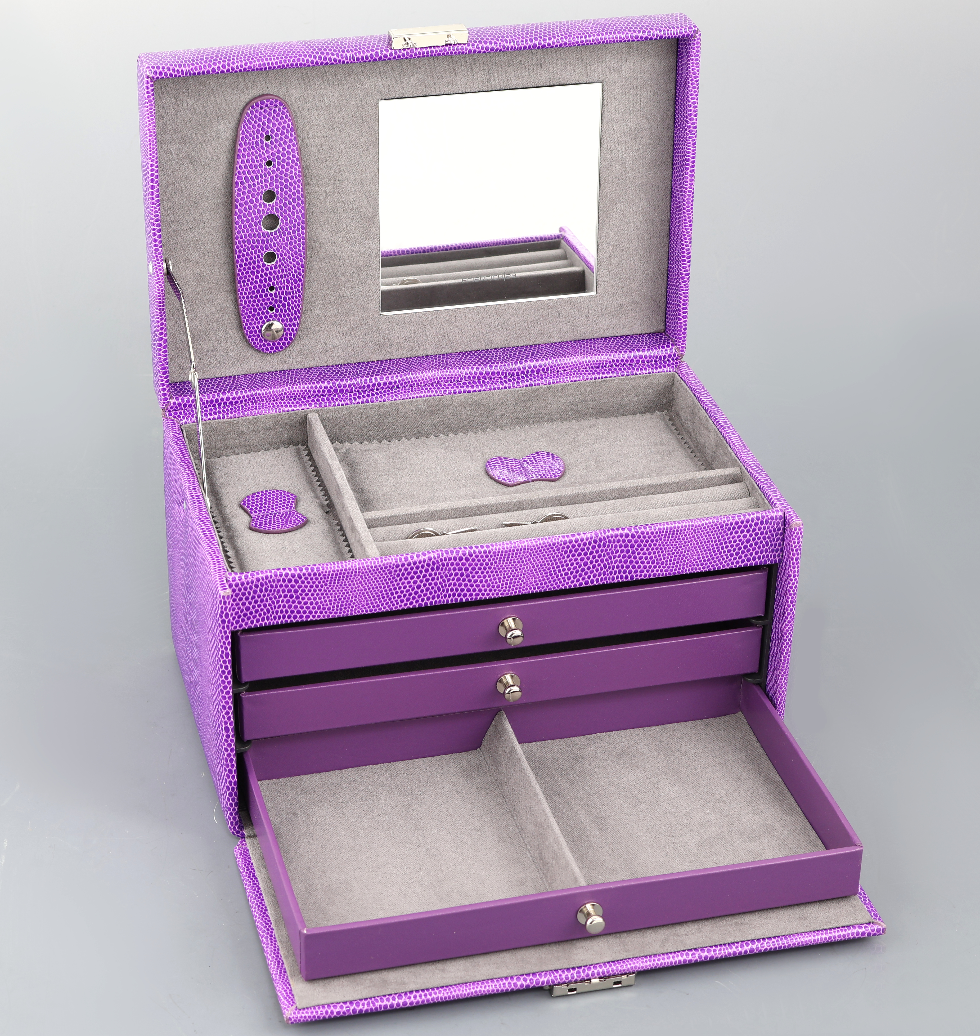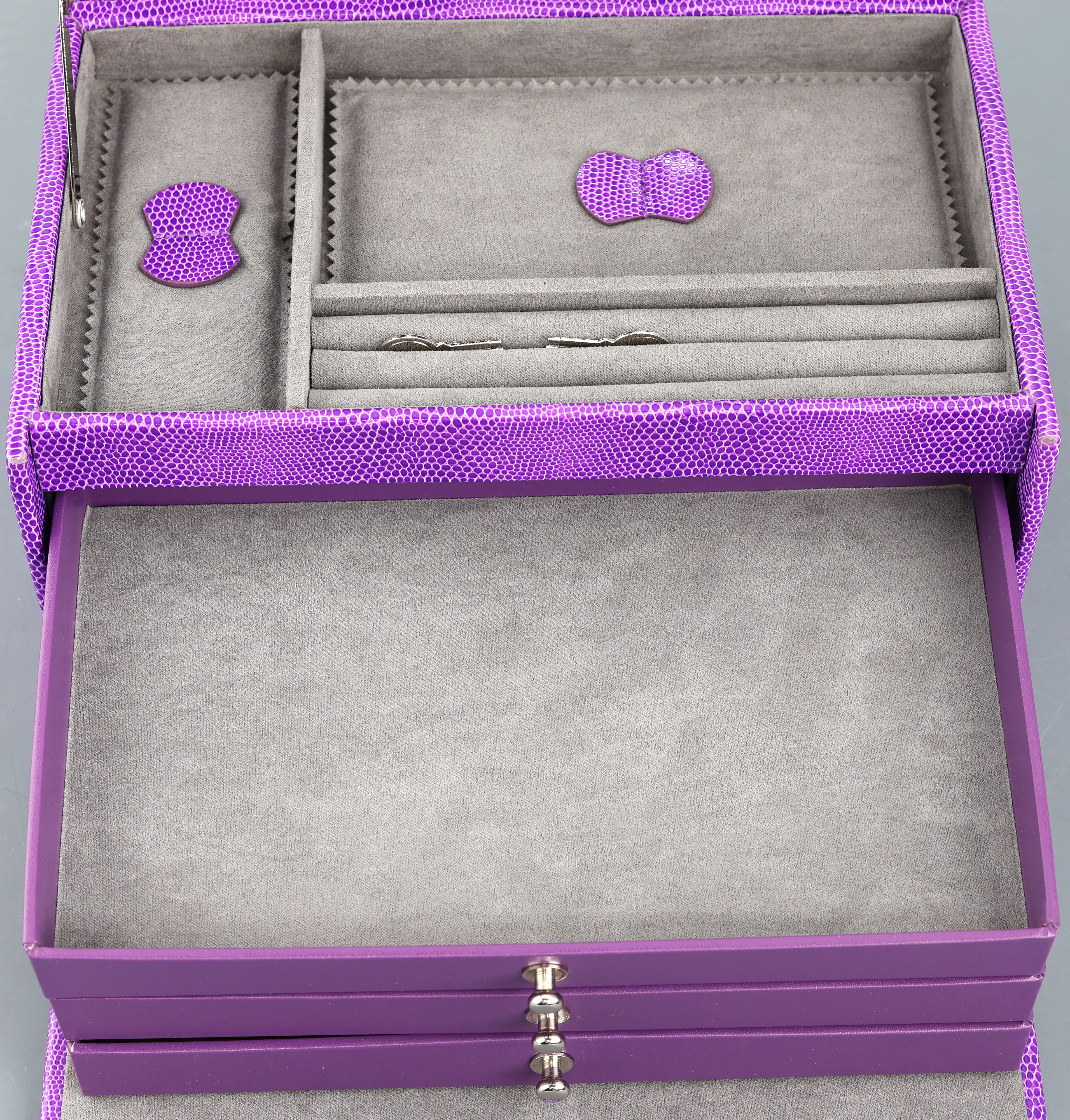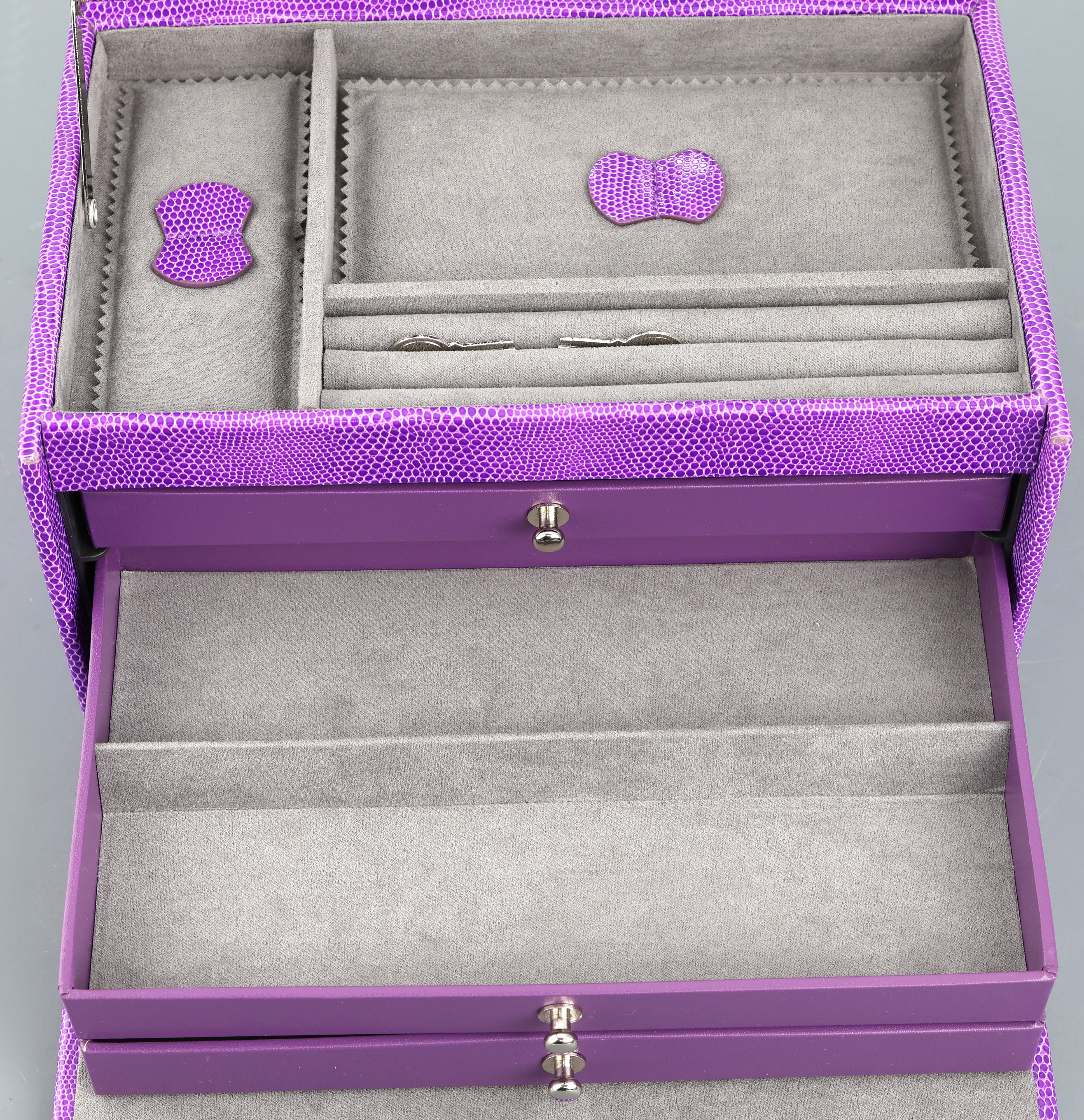 Schmuckkoffer aus lilafarb. Leder in Echsen- optik, Innenausstattung aus dunkelgrauem