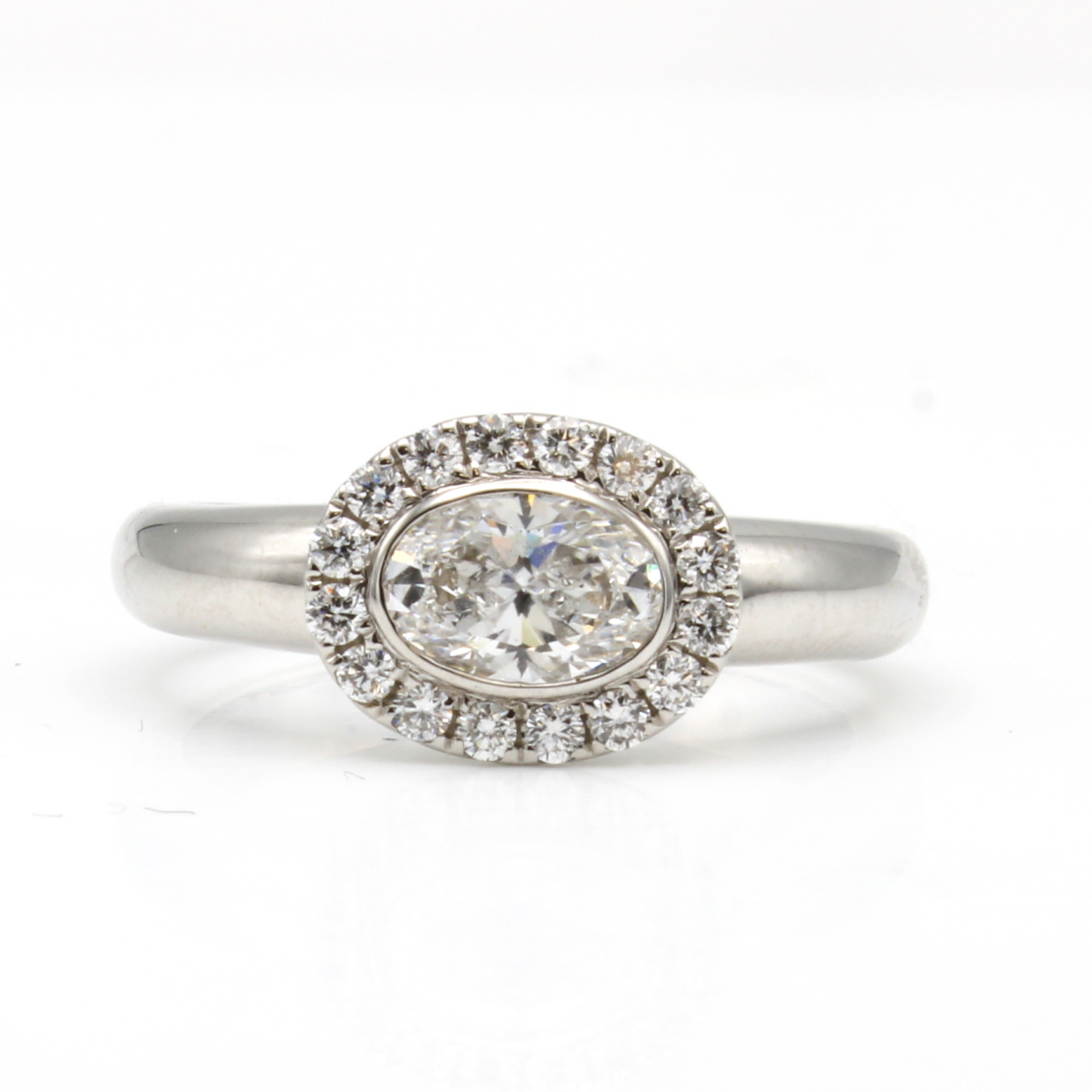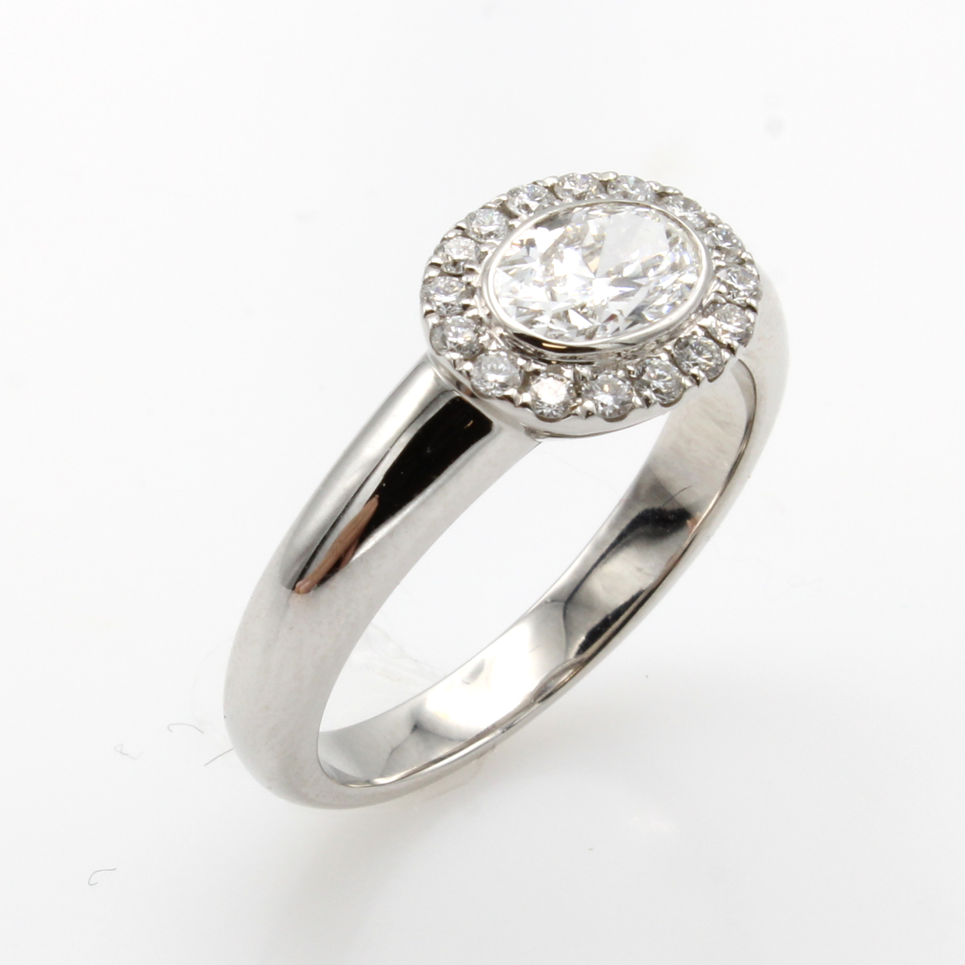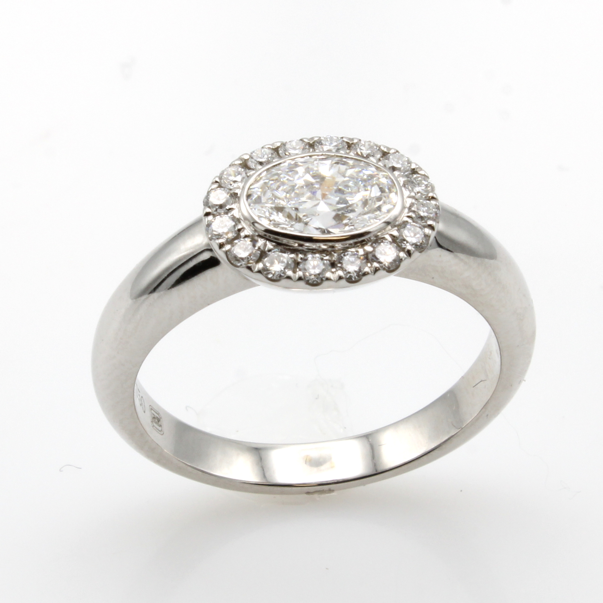 Ring mit Diamant und Brillanten, WG 750/000, diam. ca. 0.73 ct hochfeines Weiß(D)/vs1 mit Expertise, Brill. zus. ca. 0.23 ct feines Weiß/si, RW ca. 55