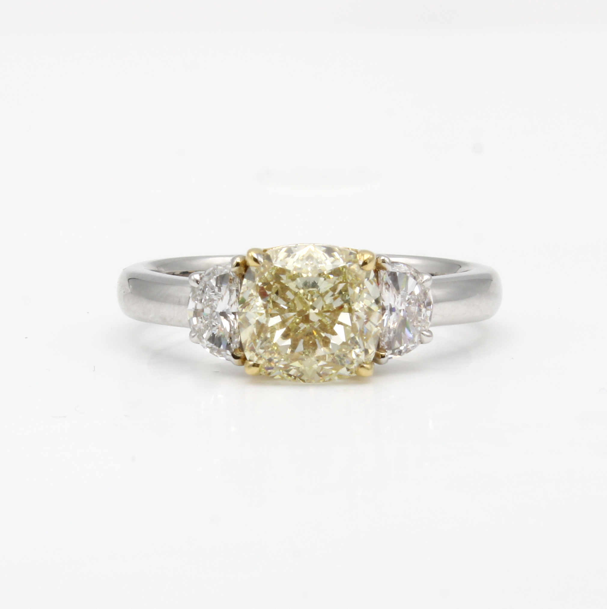 Ring mit Diamanten, WG 750/000, 1 Diam. im Cushionschliff 2.4 ct get (U-V9)/vvs1 mit Ex- pertise, 2 Diam. im Halbmondschliff zus. ca. 0.40 ct hochfeines Weiß(E)/vvs, RW ca. 55