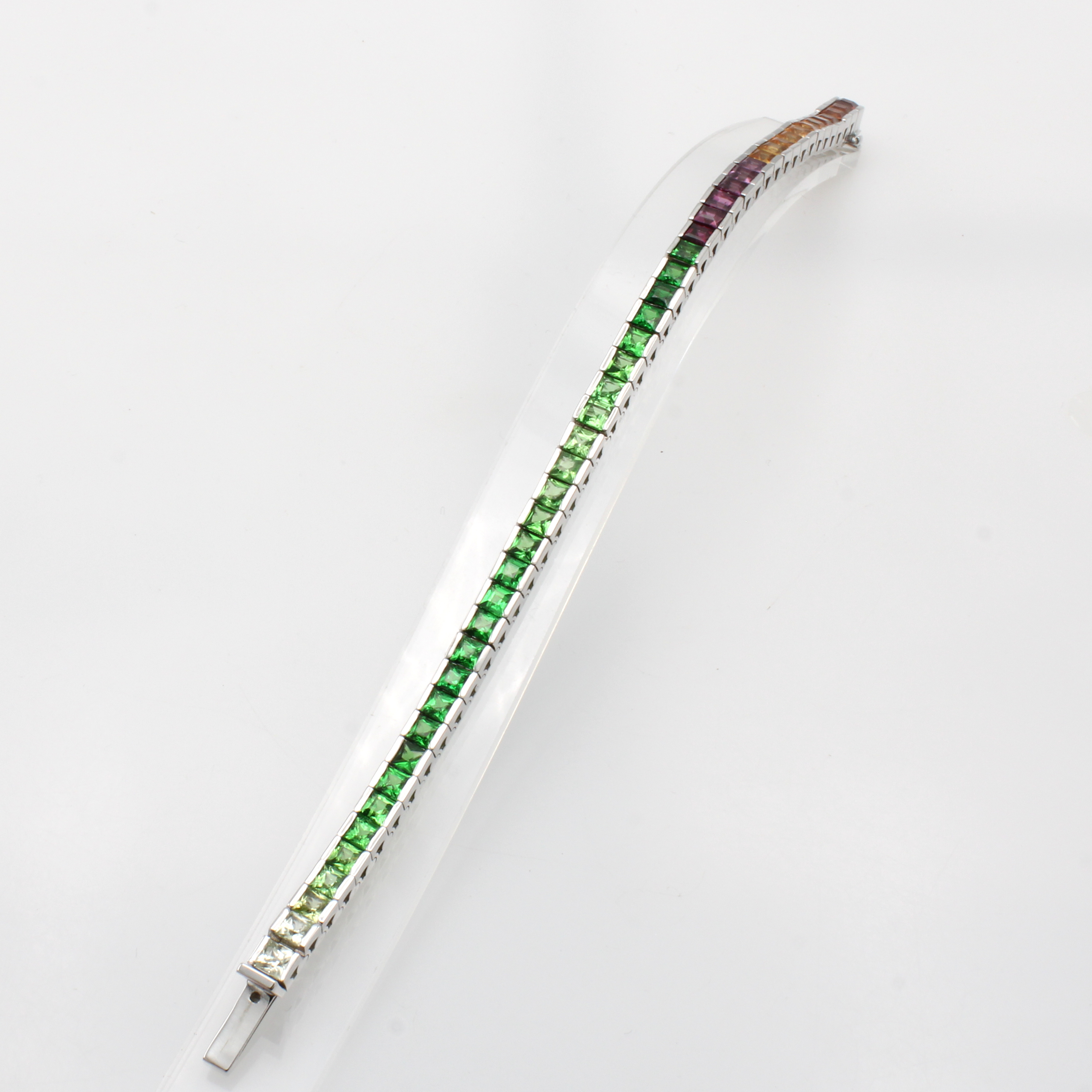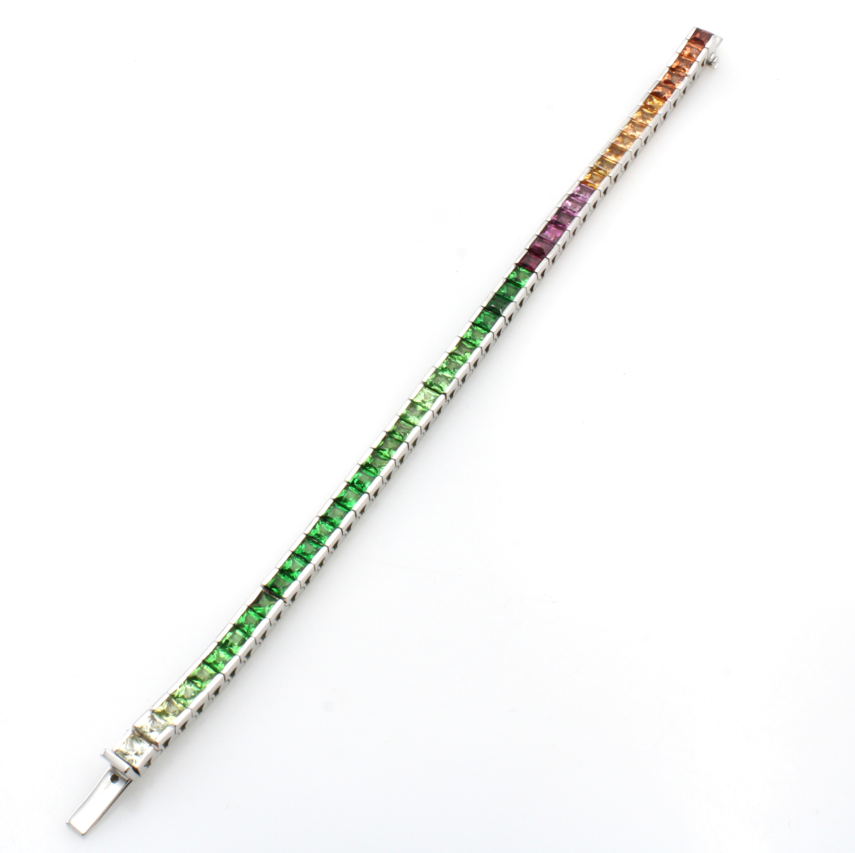 Armband mit Grossularen, WG 750/000, Kastenschl., 47 Grossularcarrées in versch. Farben u. Farbnuancen zus. ca. 17.10 ct, Kastenschl., L. ca. 17.5 cm Schätzpreis: 13000, - EUR