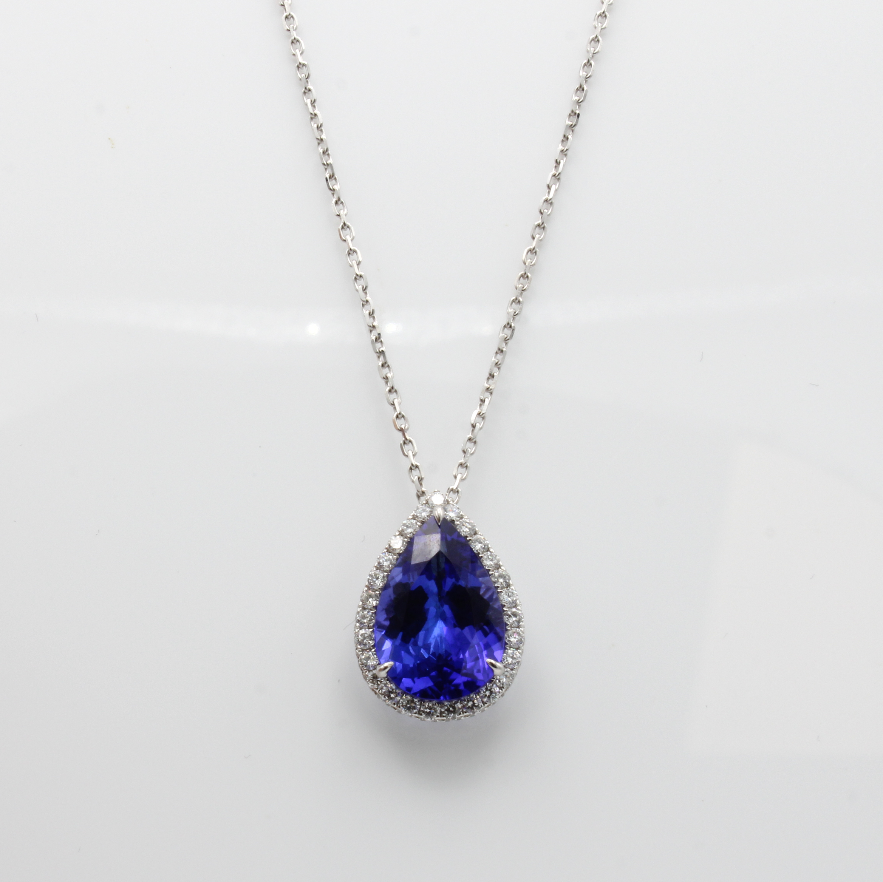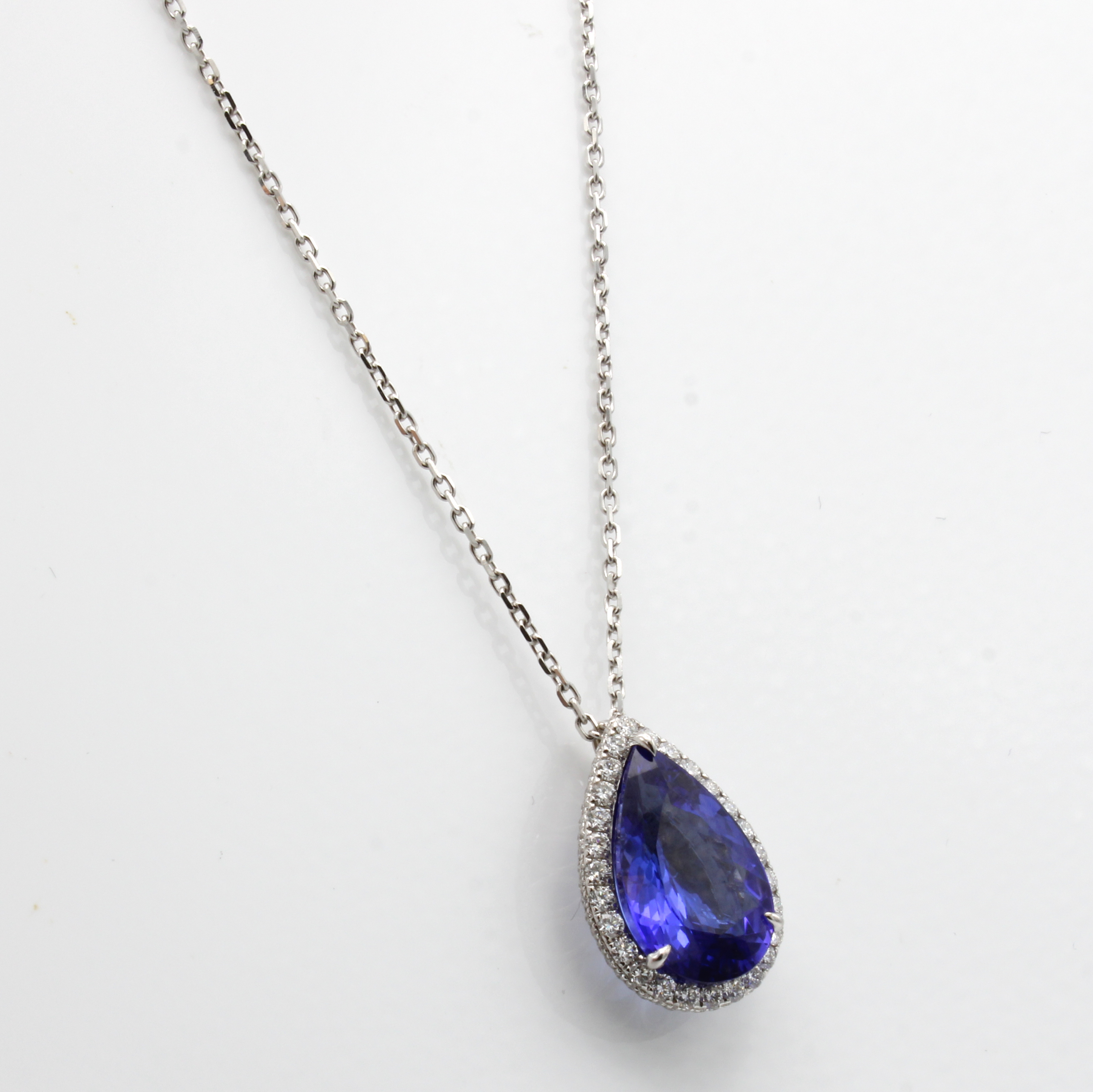 Collier mit Tansanit und Brillanten, WG 750/000, Tansanittropfen ca. 10.08 ct u. Brill. zus. ca. 1.10 ct feines Weiß/vs, L. ca. 42 cm