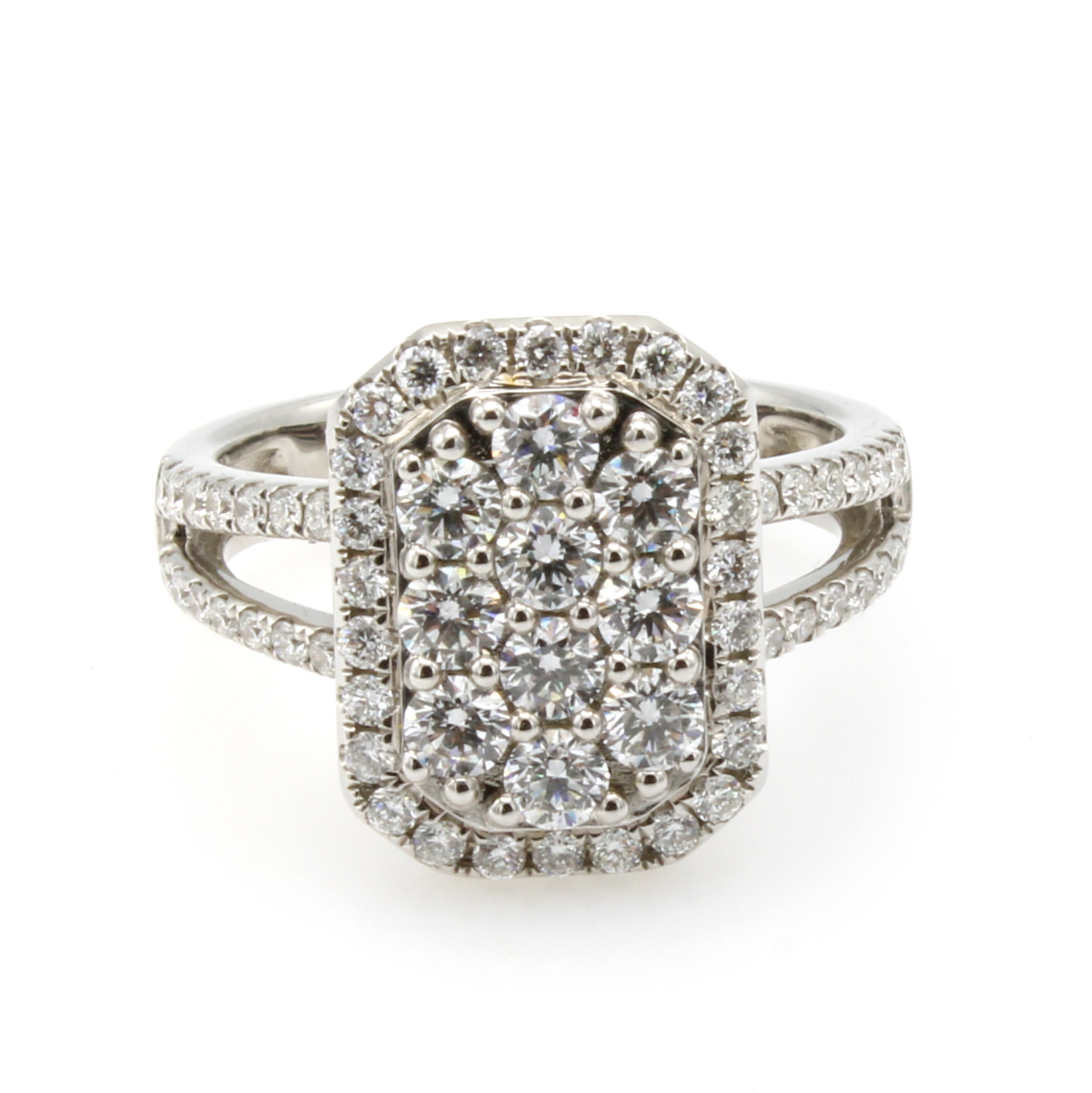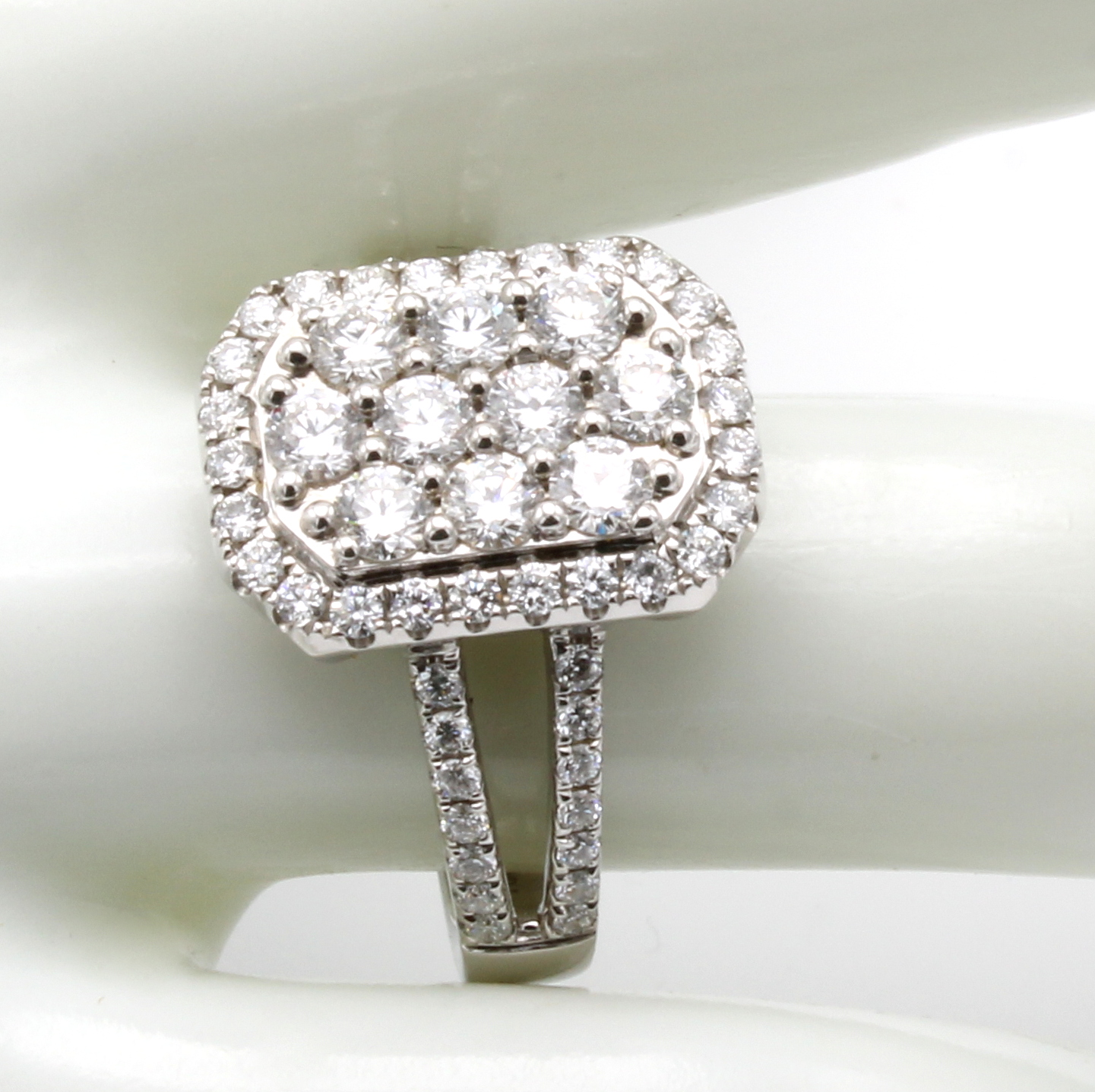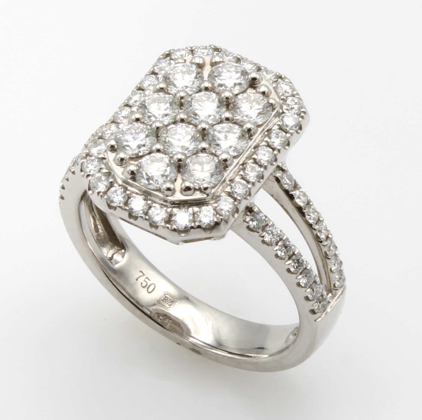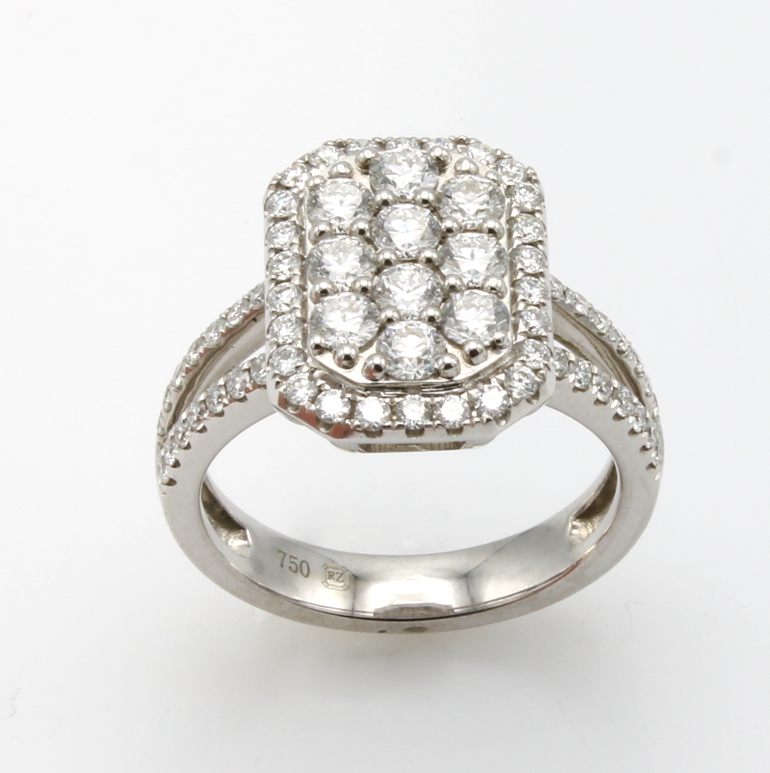 Ring mit Brillanten, WG 750/000, 10 Brill. zus. ca. 0.94 ct u. 55 Besatzbrill. zus. ca. 0.61 ct feines Weiß/si, RW ca. 55 Schätzpreis: 7400, - EUR
