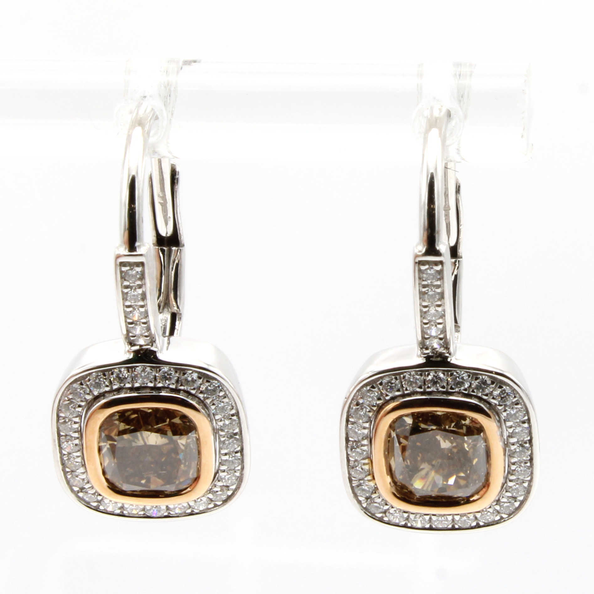 Paar Ohrgehänge mit Diamanten und Brillanten, WG 750/000, 2 Diam. im Kissenschliff zus. ca. 2.09 ct braun (natur) 58 Brill. zus. ca. 0.32 ct feines Weiß/vs Schätzpreis: 7900, - EUR