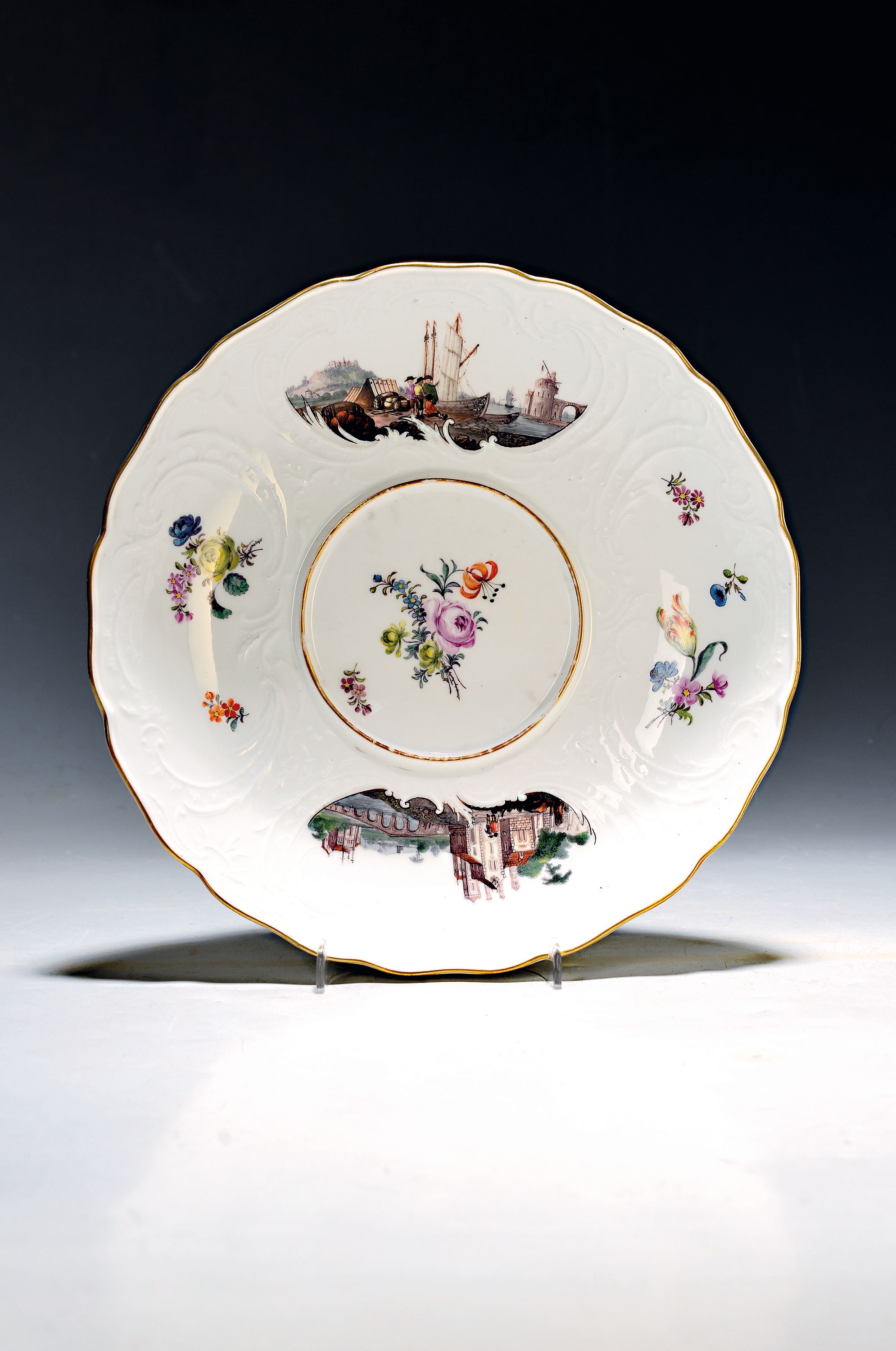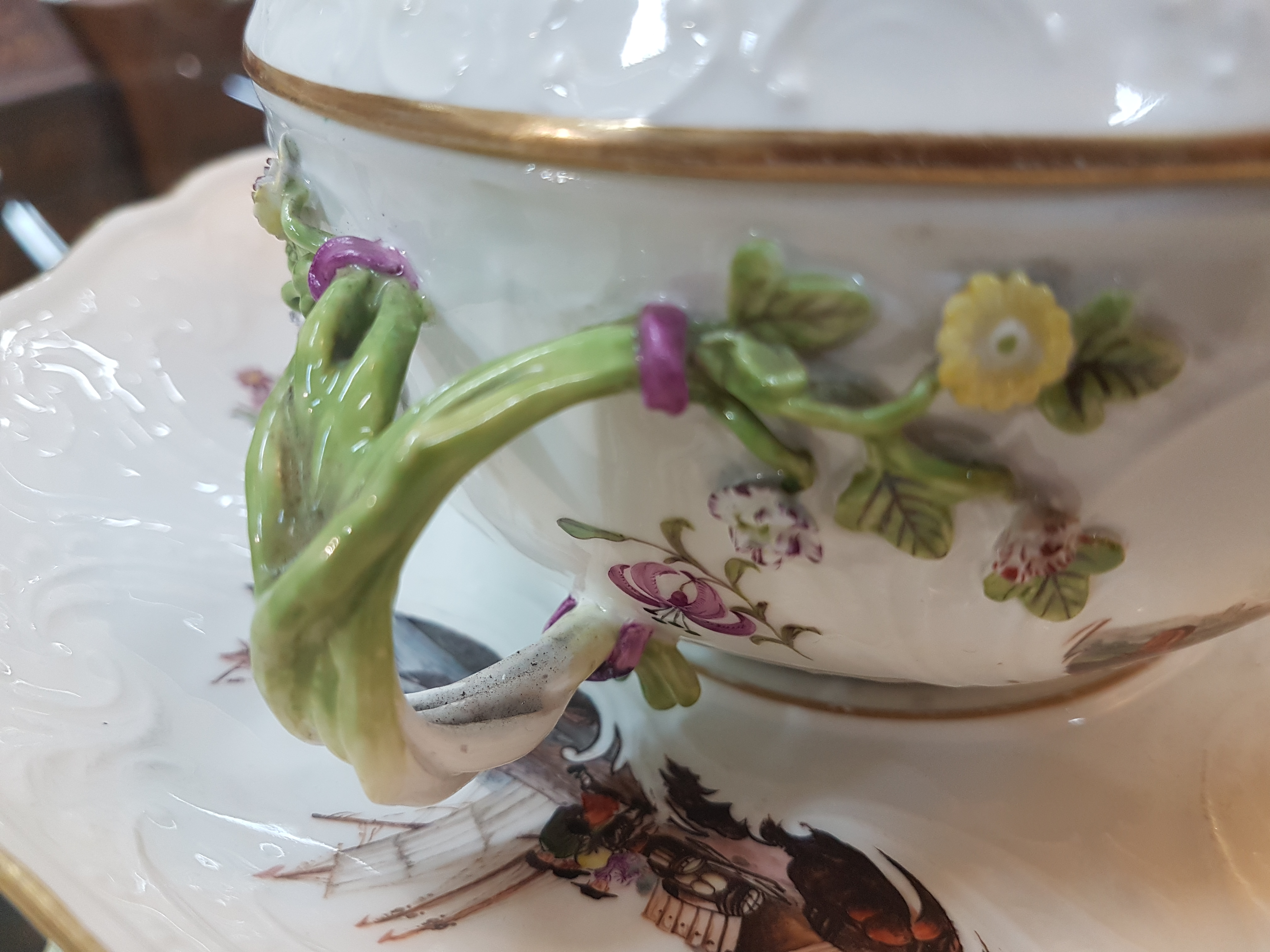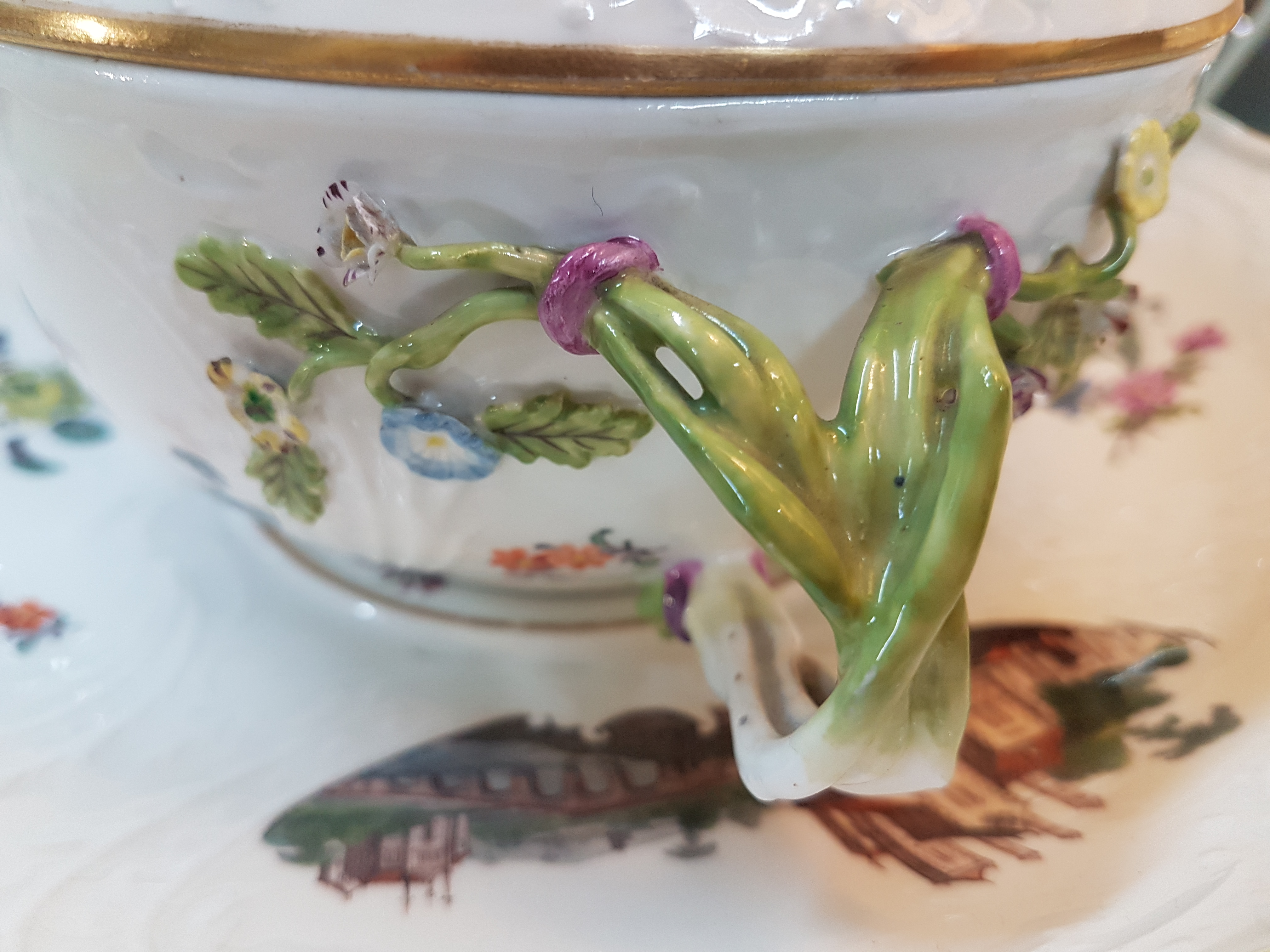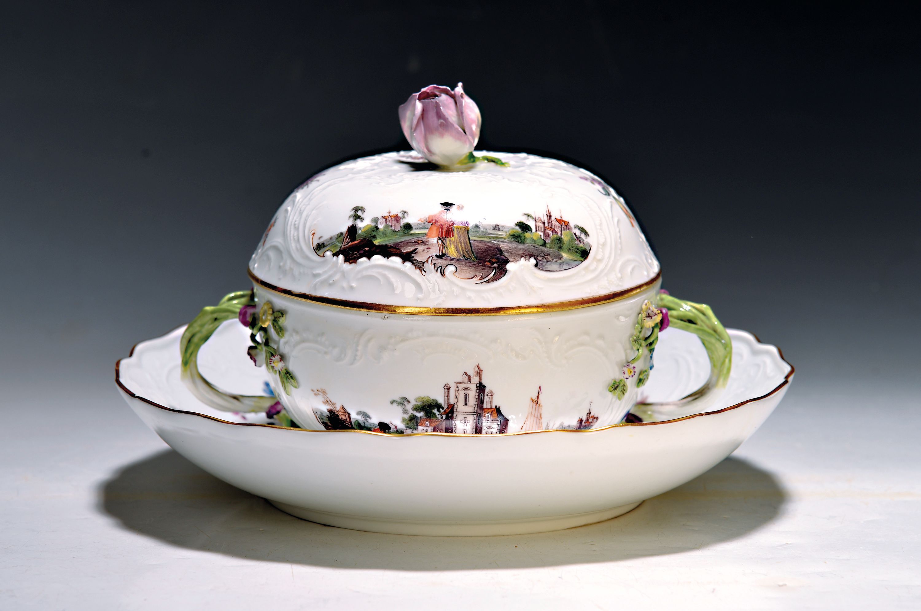 Small lidded tureen/lidded bowl with presentoir/plate, Meissen, around 1745/50, porcelain, sea prospect scenes and landscapes in six reserves, braided branch handles with applied flowers, lidded rose rest., gold edges, H. approx. 13.5 cm, W. approx. 18 cm, plate D. 23.5 cm