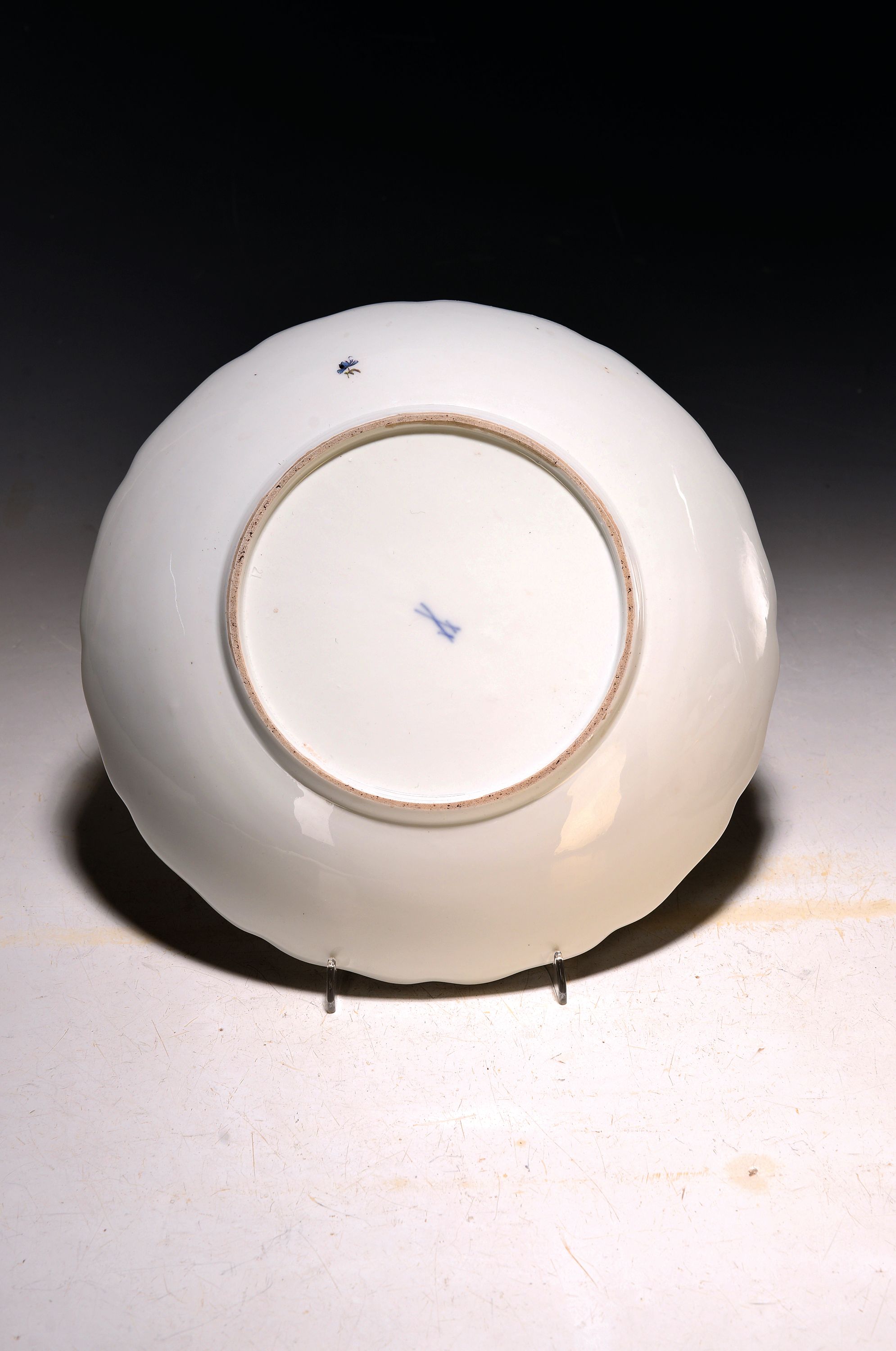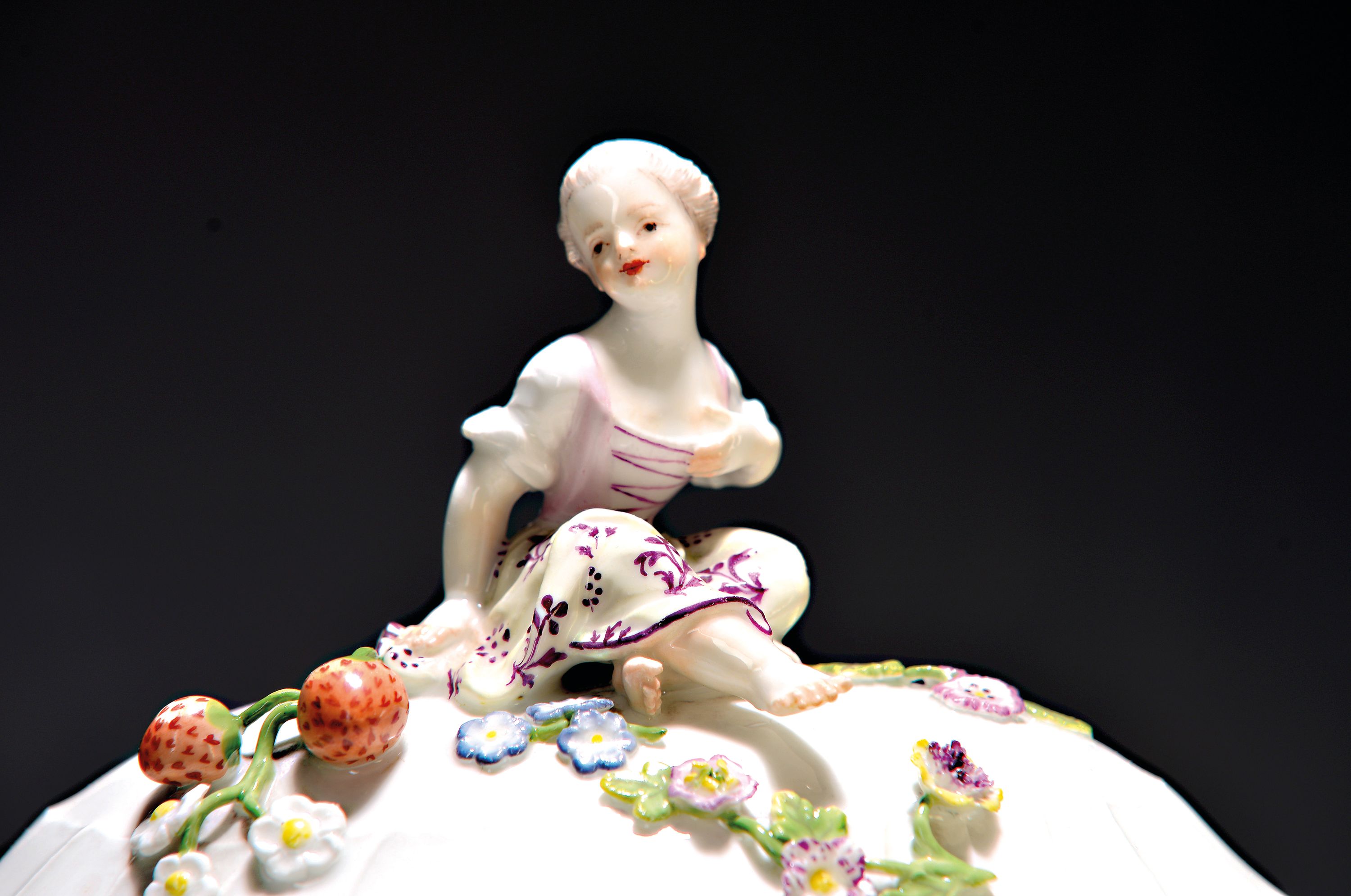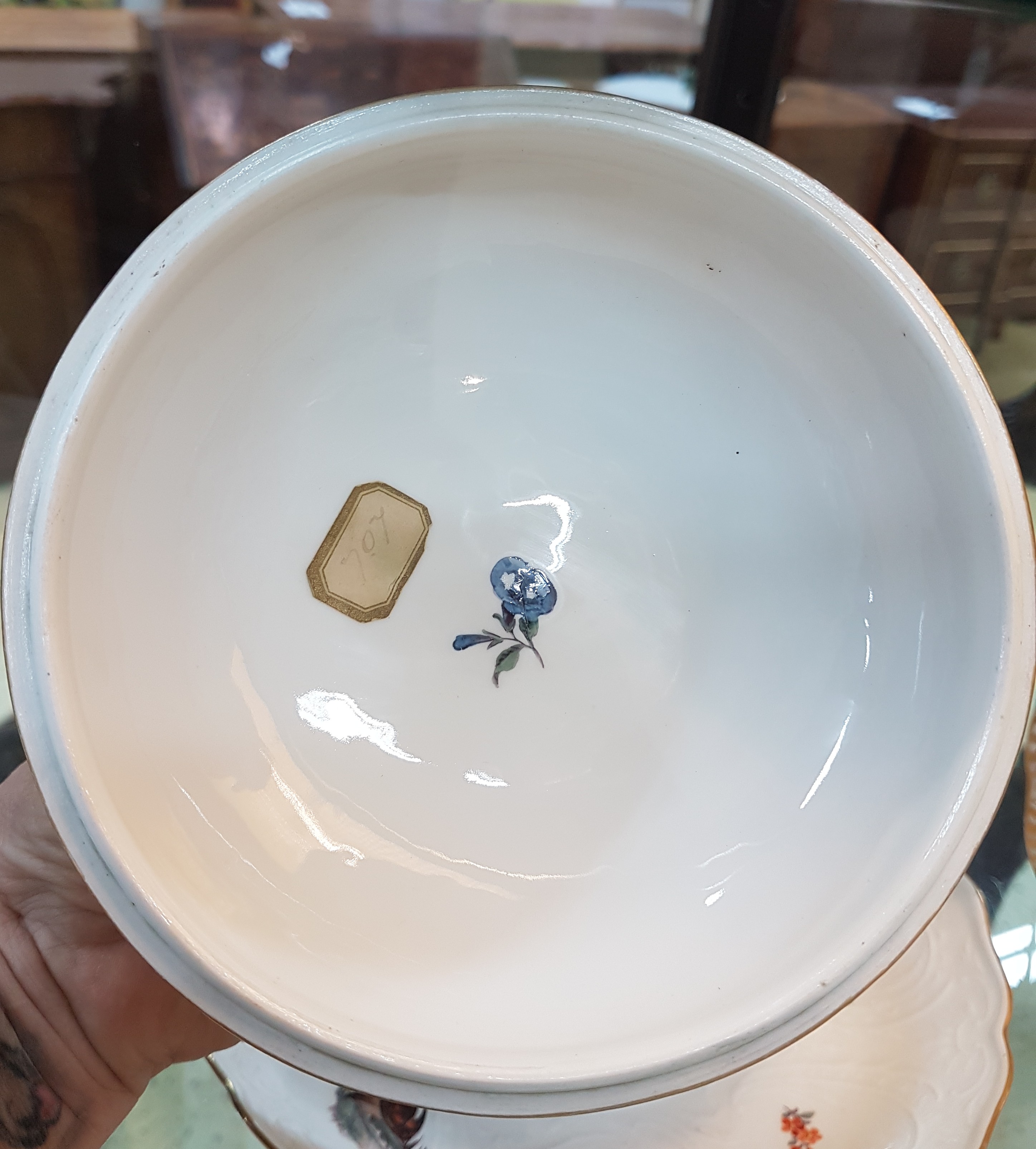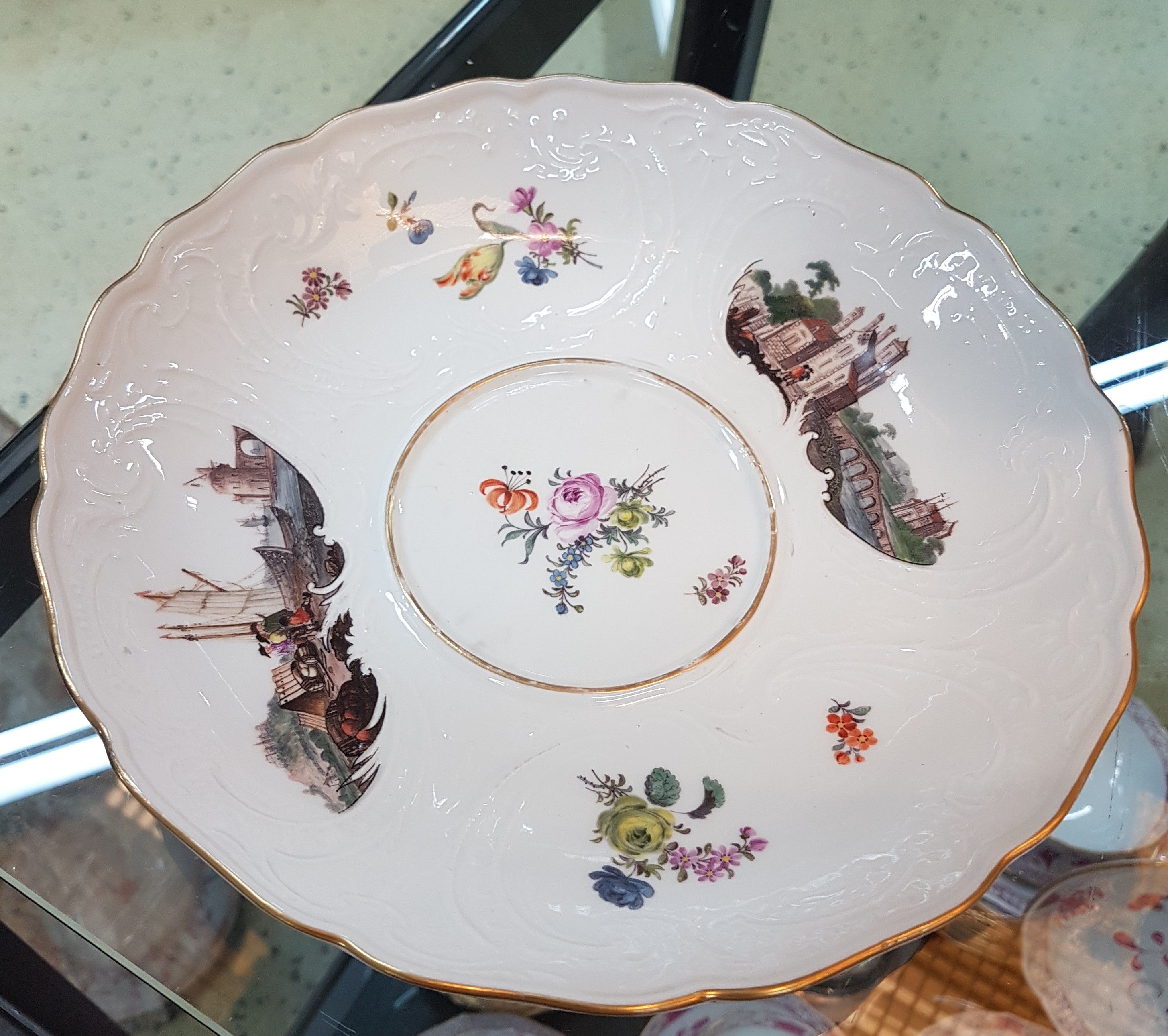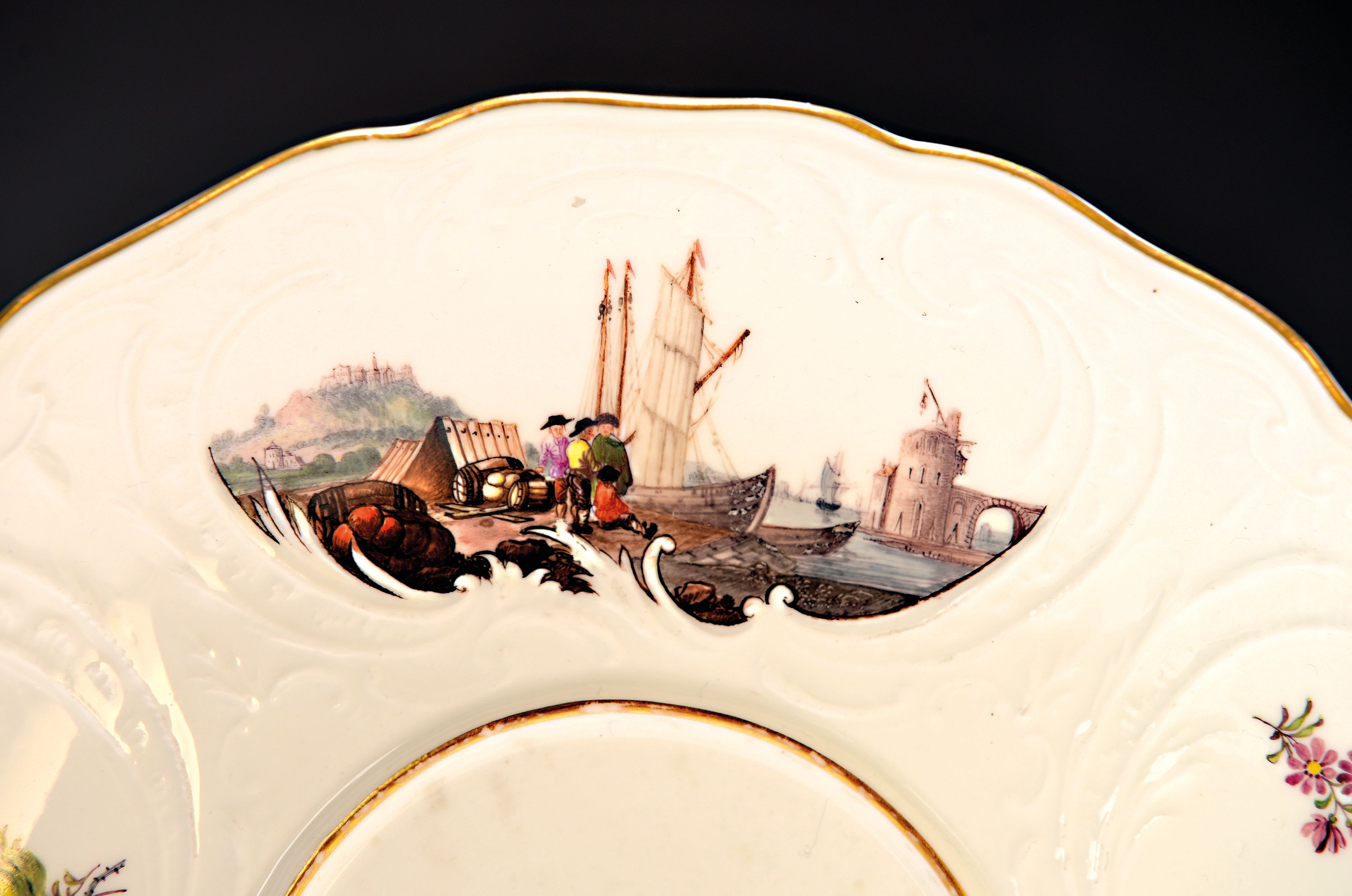 Small lidded tureen/lidded bowl with presentoir/plate, Meissen, around 1745/50, porcelain, sea prospect scenes and landscapes in six reserves, braided branch handles with applied flowers, lidded rose rest., gold edges, H. approx. 13.5 cm, W. approx. 18 cm, plate D. 23.5 cm