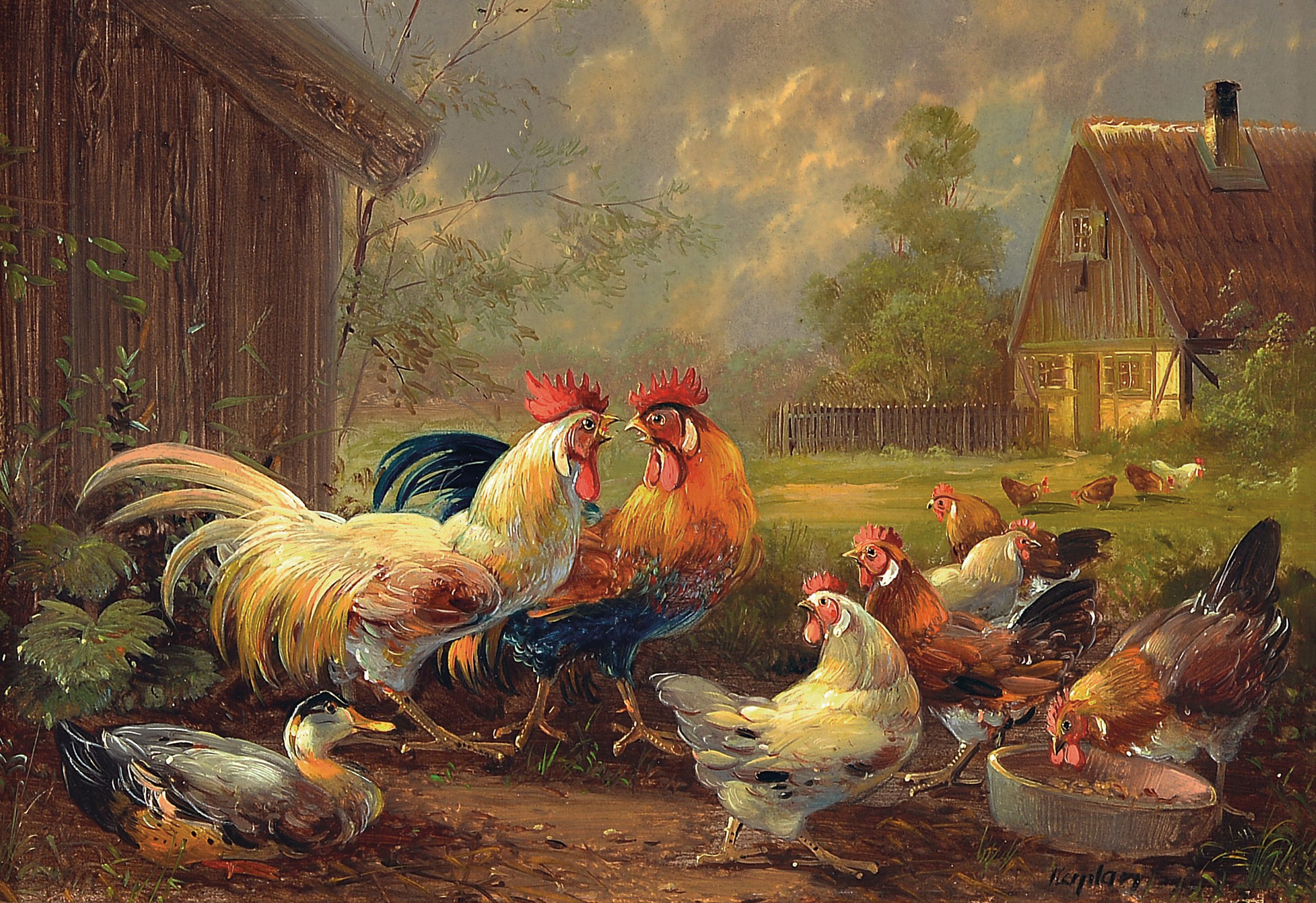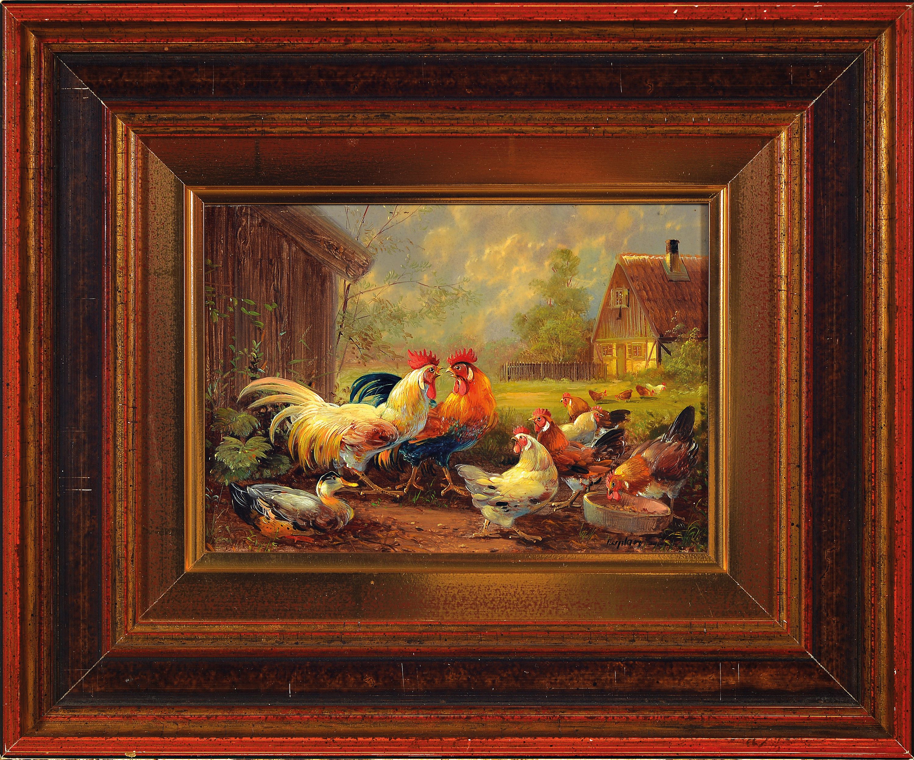 Hubert Kaplan, 1940-2024 München, auf dem Hühnerhof, Öl/Holz, feine detailreicheMalerei,