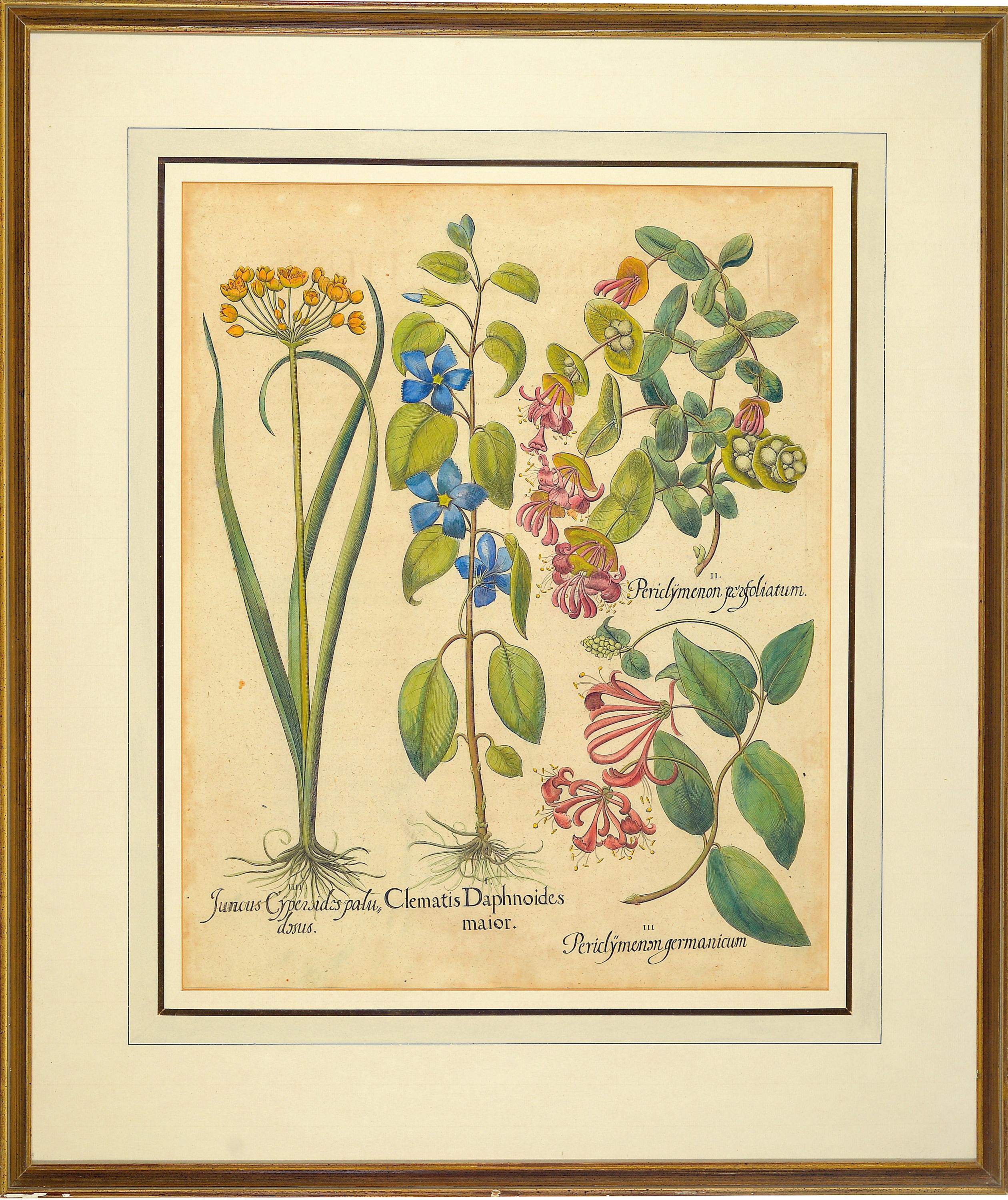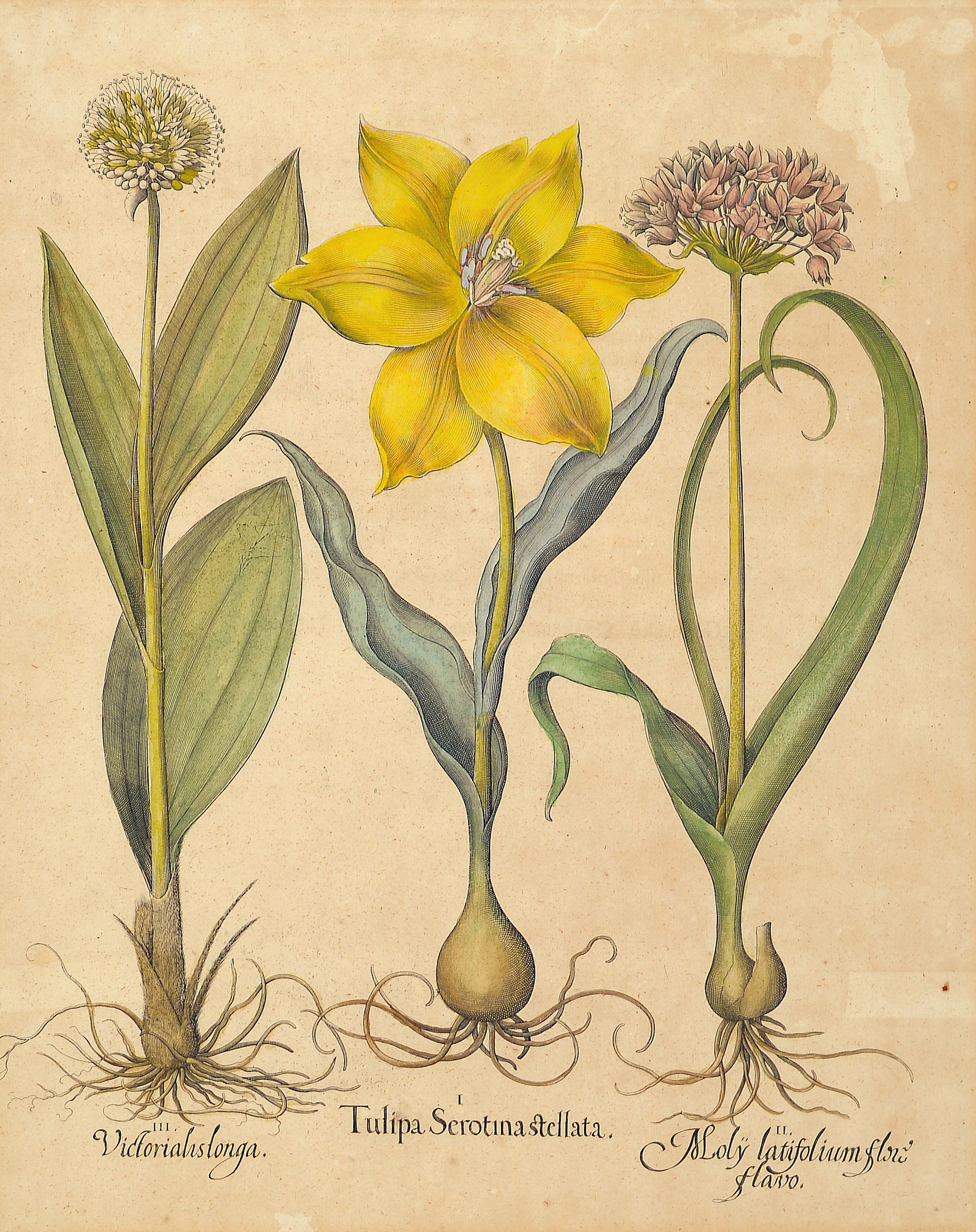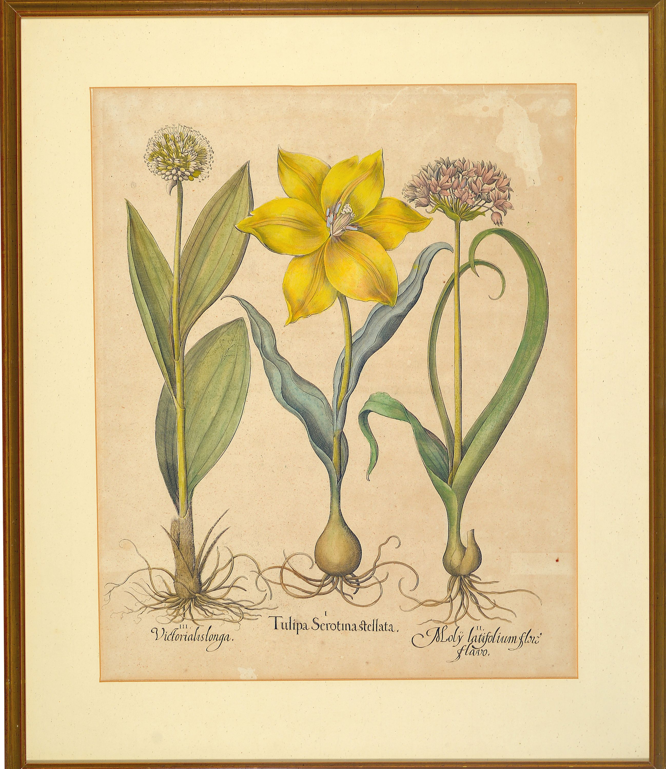 4 Kupferstiche aus Hortus Eystettensis, Basilius Besler (1561-1629), Tulipa Serotina stellata, ca. 52x42cm, PP, u.Gl., R. ca. 69x 58cm, Flos Cheyri maximus eystettensis, ca. 50x40cm, leicht knitterfaltig, PP, u.Gl., R. ca. 69x58cm; Hyacinthus cosmosus spuriusm ca. 50x40cm, PP, u.Gl., R. ca. 75x63cm; Clematis Daphnoides Maior, ca. 51x41cm, PP, u.Gl., R. ca. 75x63cm