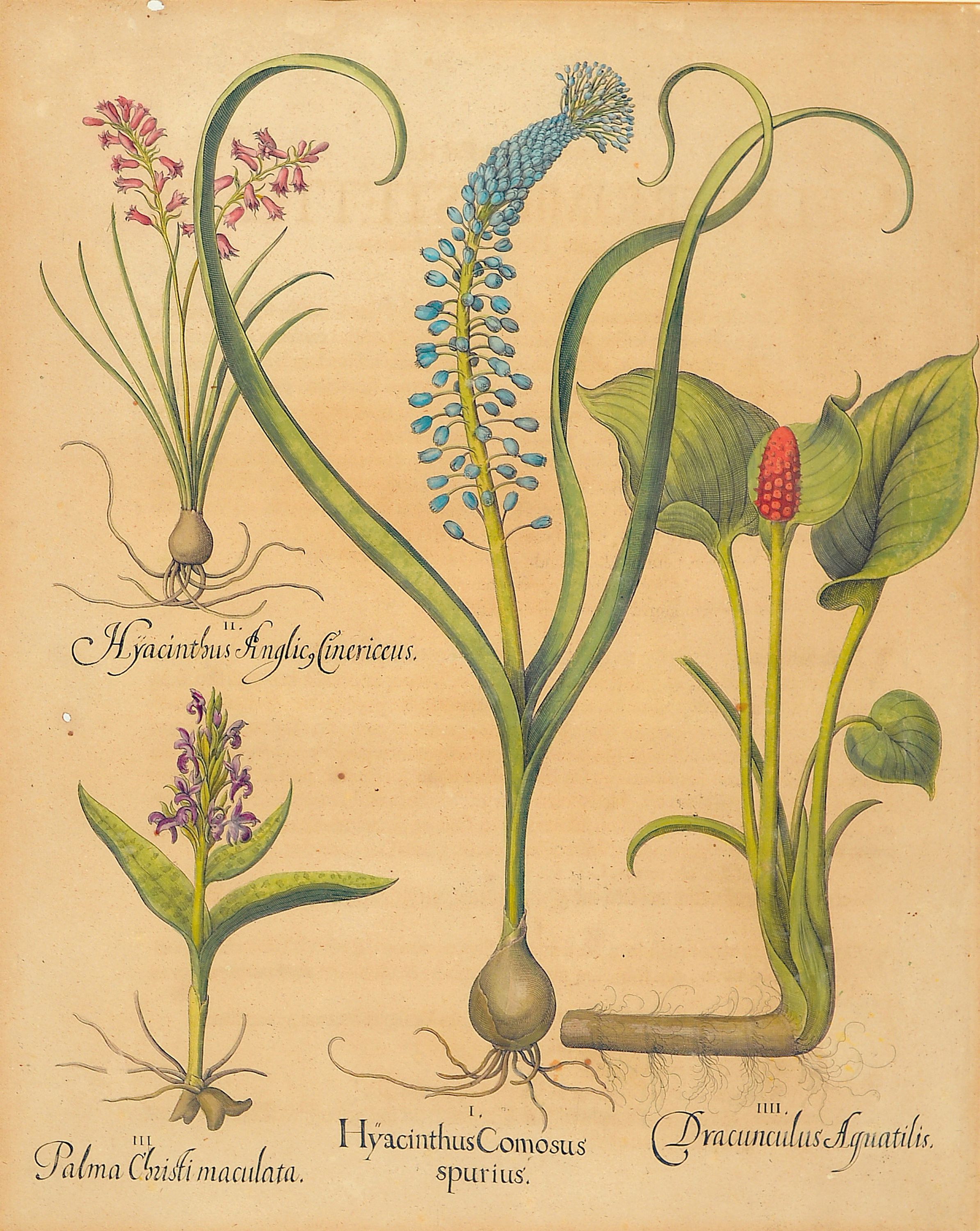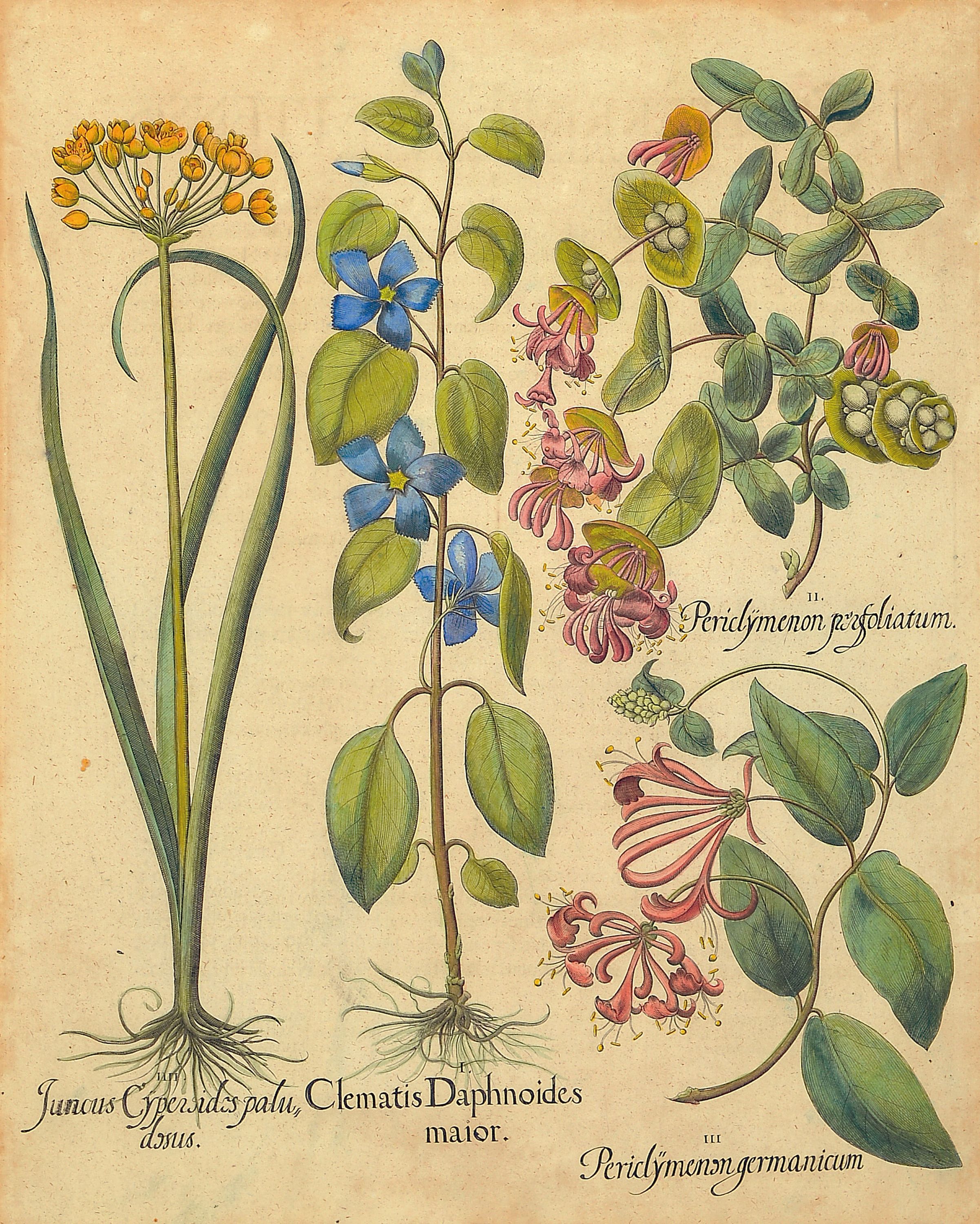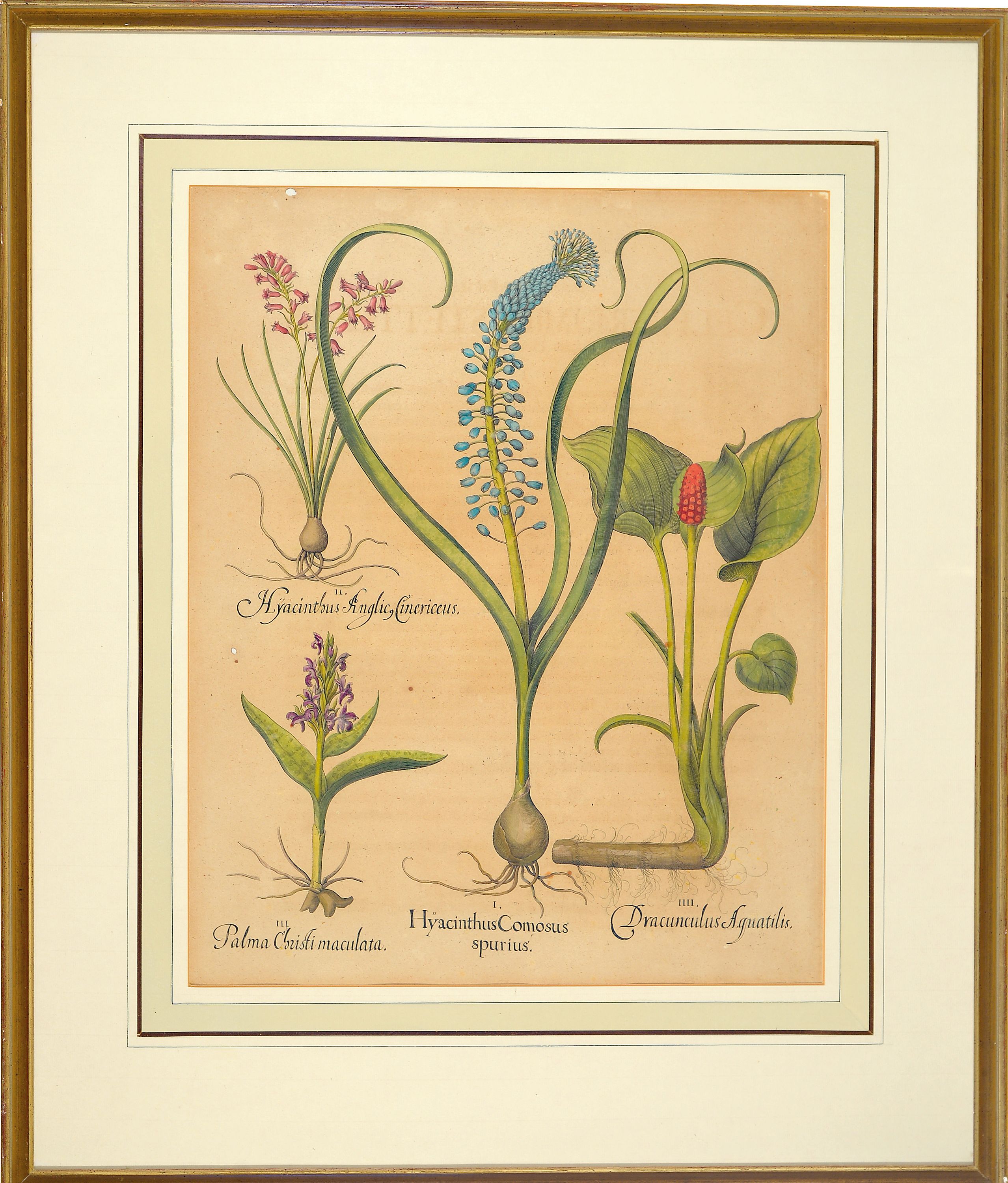 4 Kupferstiche aus Hortus Eystettensis, Basilius Besler (1561-1629), Tulipa Serotina stellata, ca. 52x42cm, PP, u.Gl., R. ca. 69x 58cm, Flos Cheyri maximus eystettensis, ca. 50x40cm, leicht knitterfaltig, PP, u.Gl., R. ca. 69x58cm; Hyacinthus cosmosus spuriusm ca. 50x40cm, PP, u.Gl., R. ca. 75x63cm; Clematis Daphnoides Maior, ca. 51x41cm, PP, u.Gl., R. ca. 75x63cm
