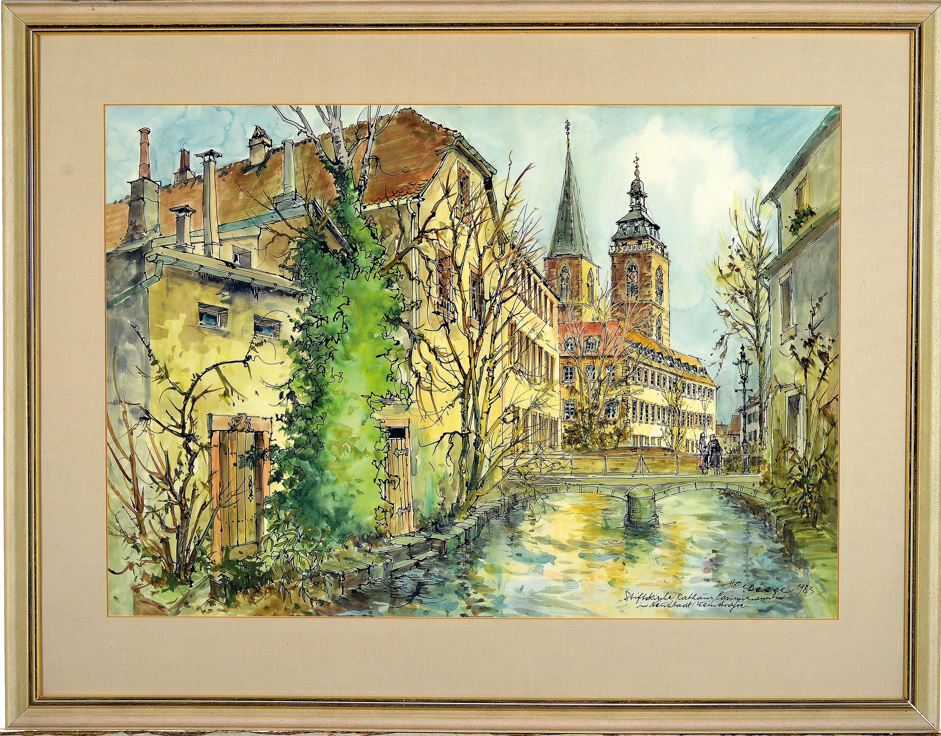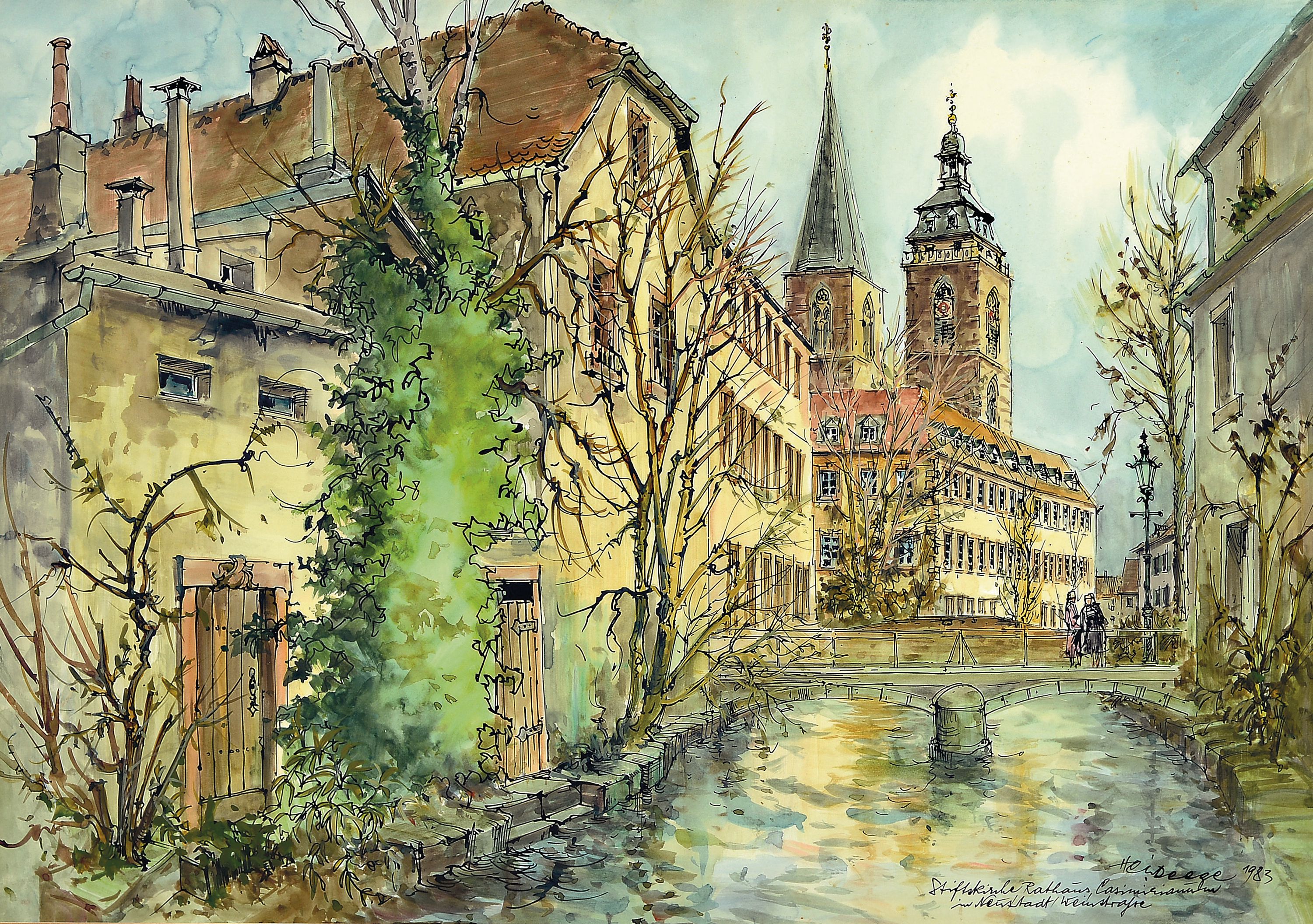 Stiftskirche und Rathaus, 1983, rechts unten signiert, bez. und datiert, unter Glas