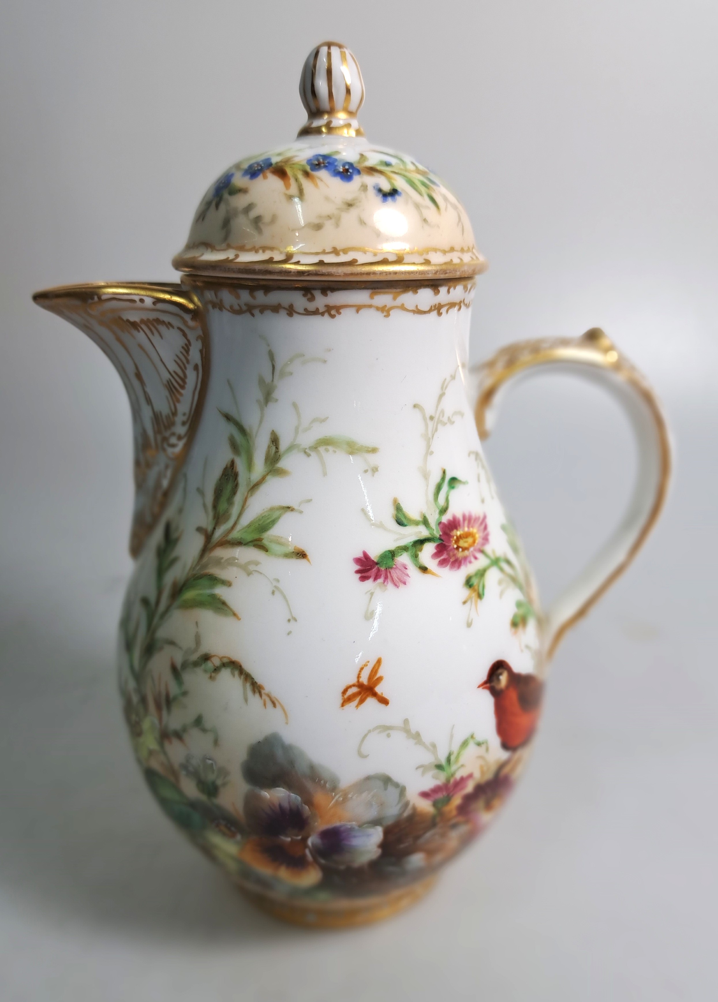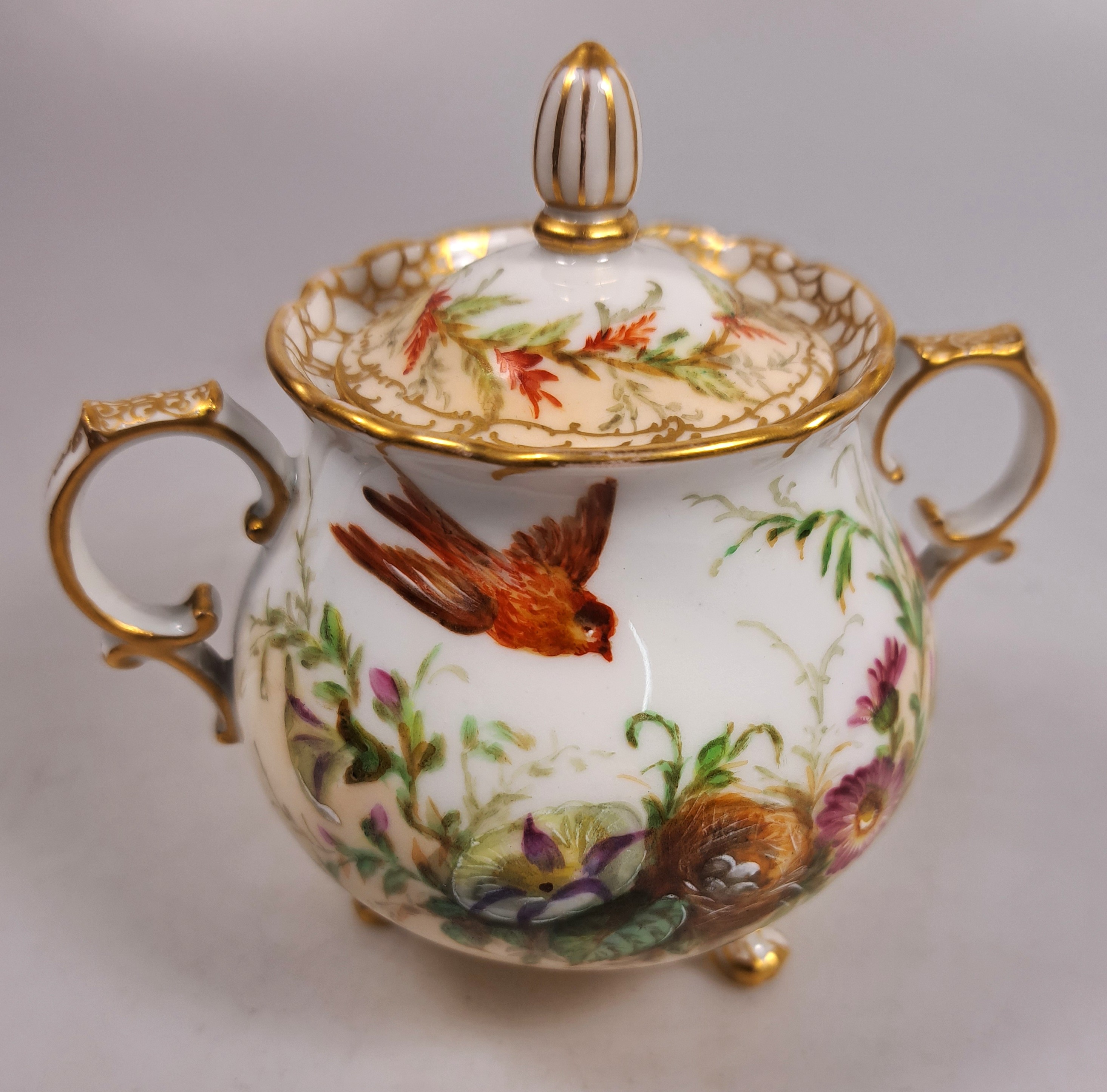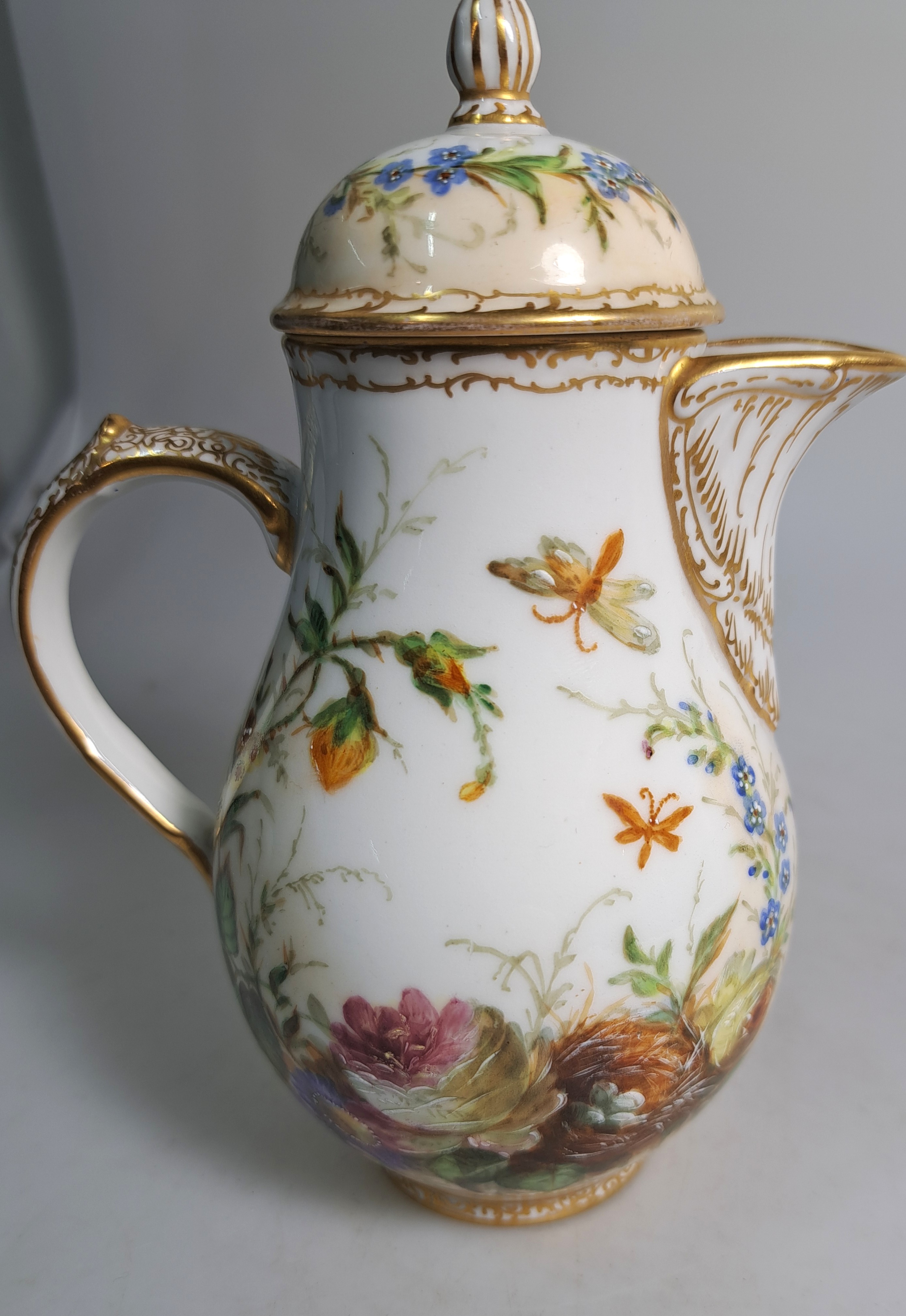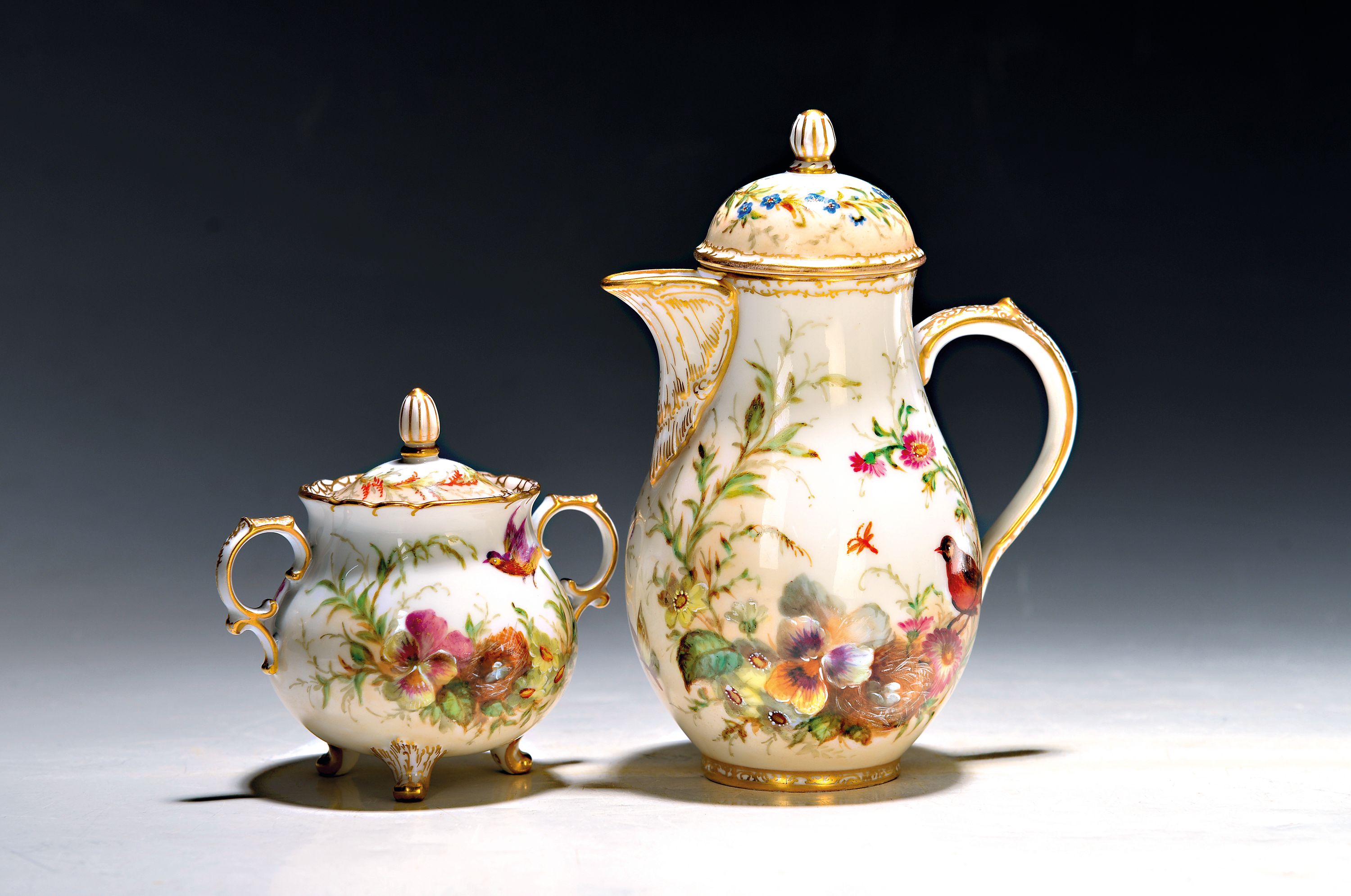 Unikate, Malerei mit Singvögeln und Nestern zwischen Pflanzenwerk, Kanne mit Szepter