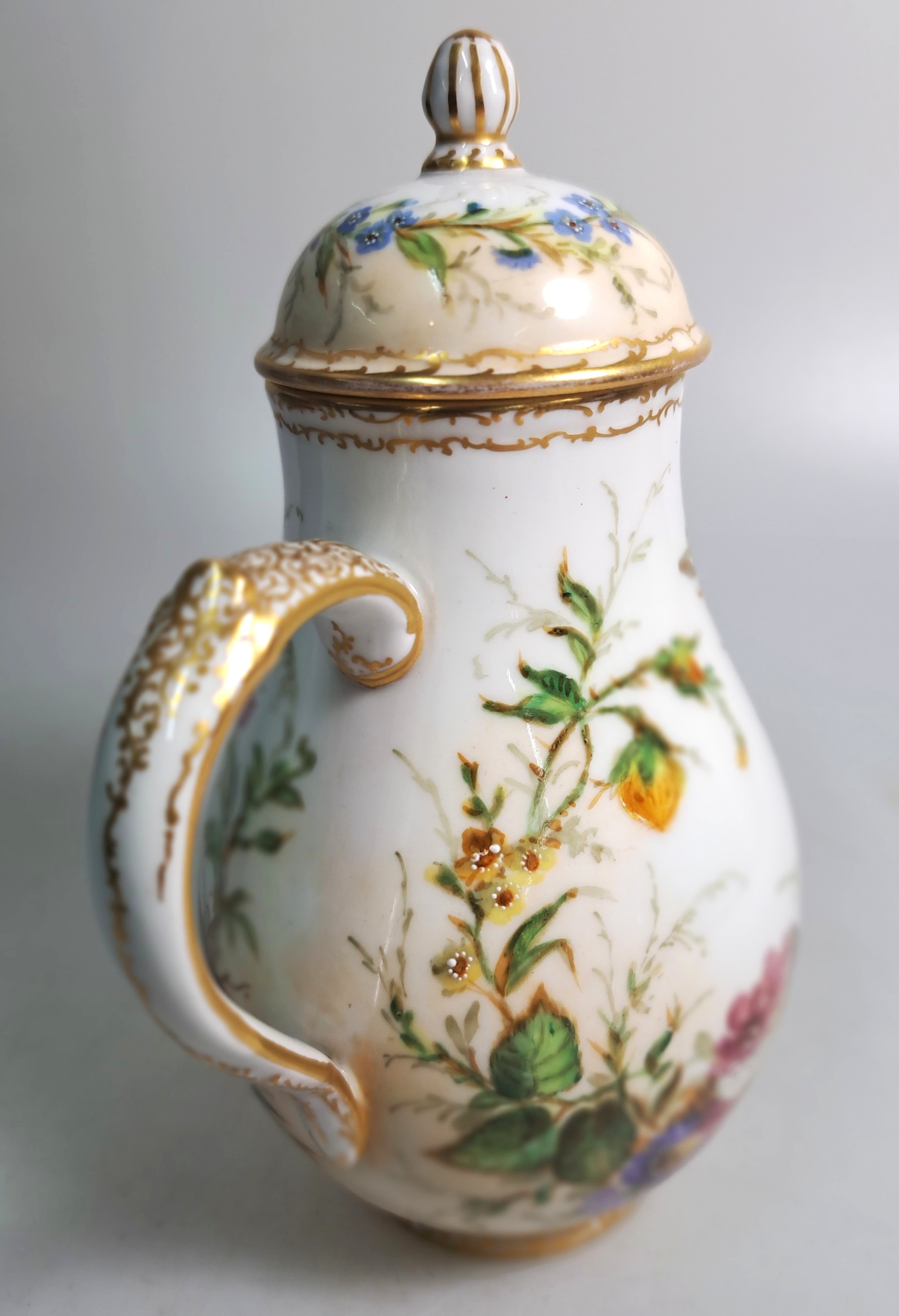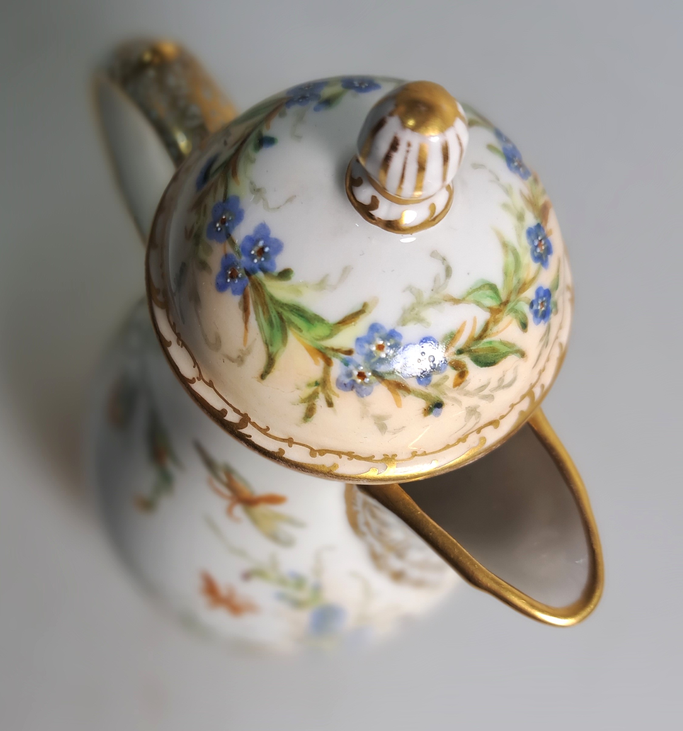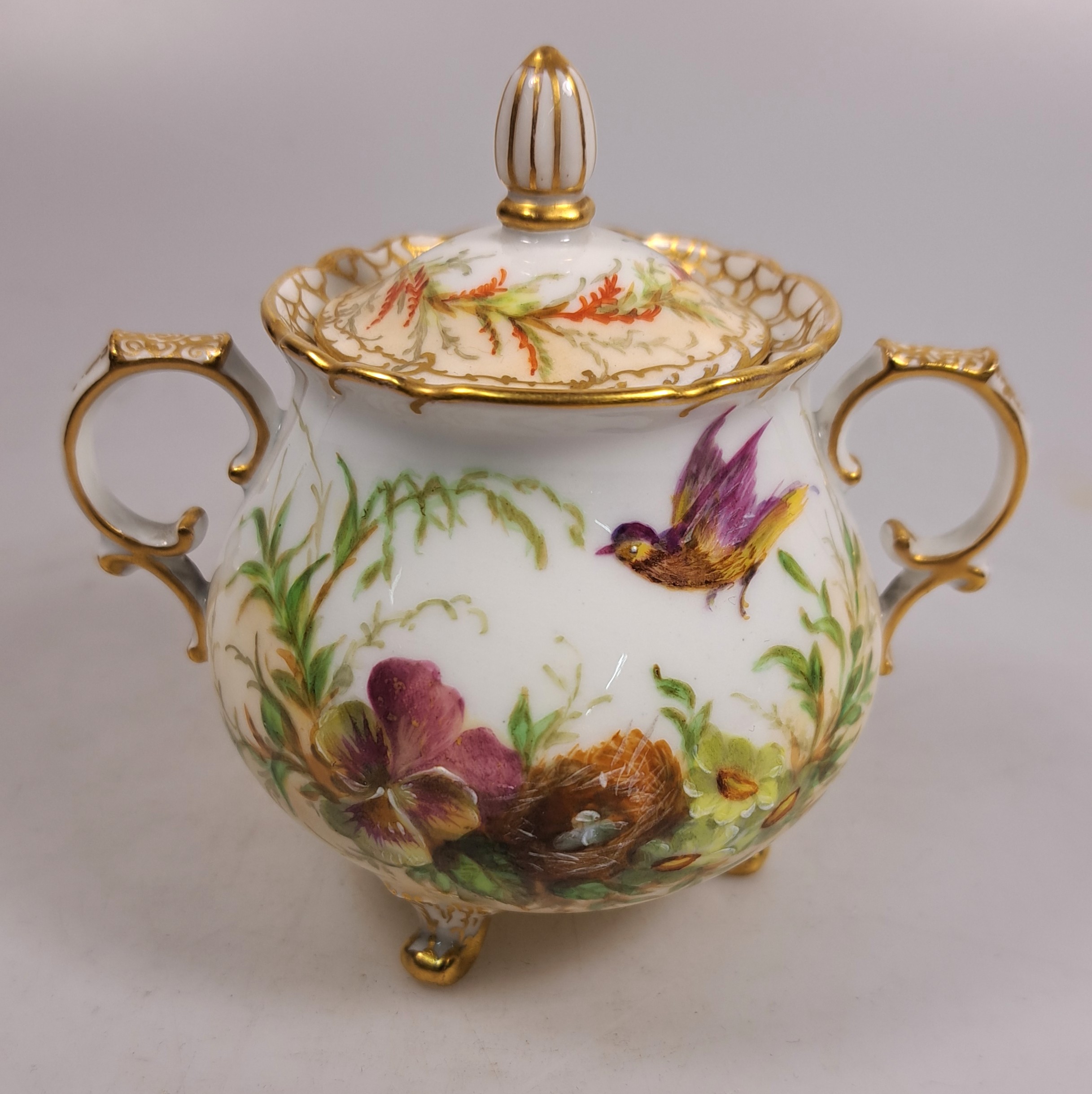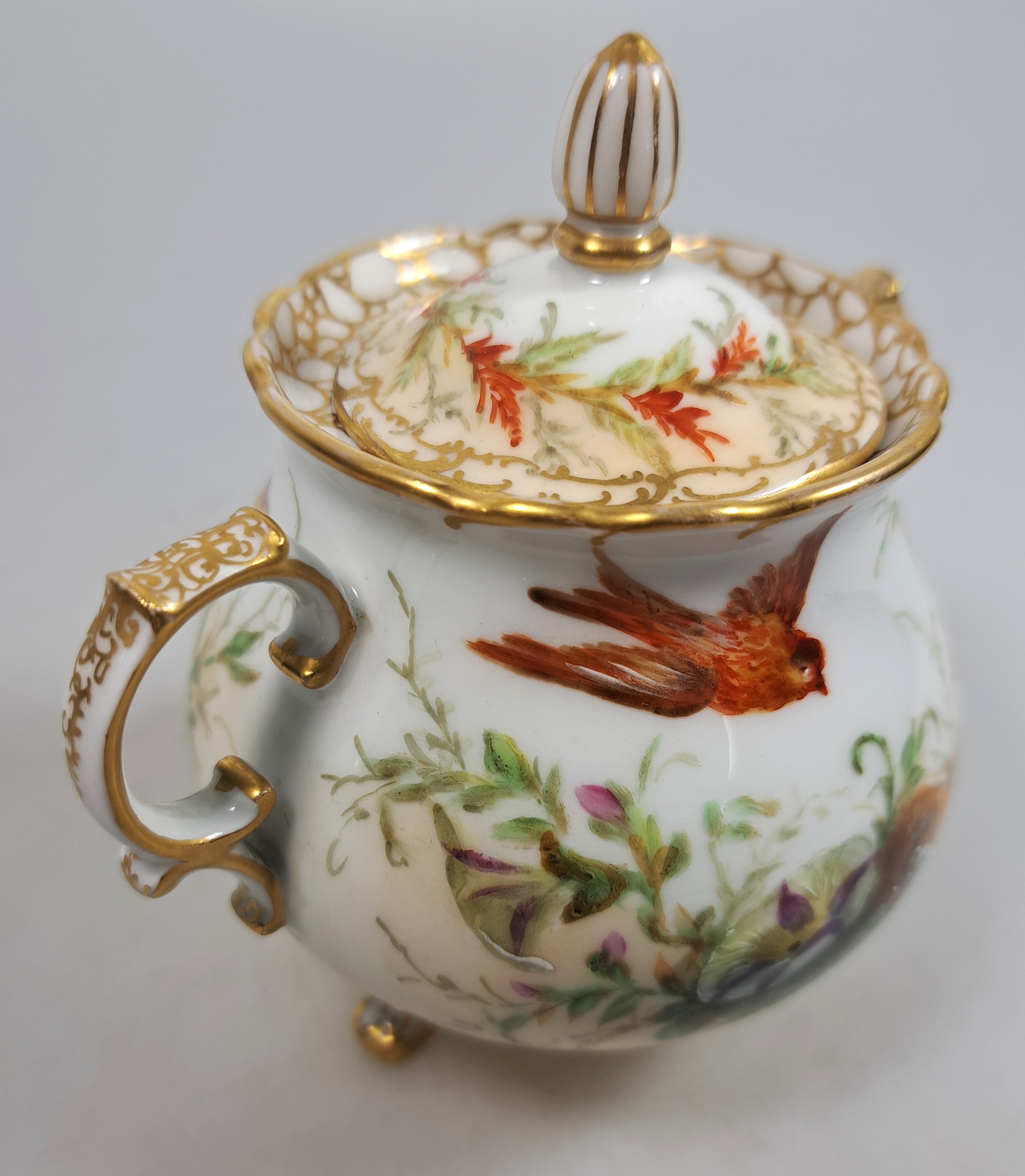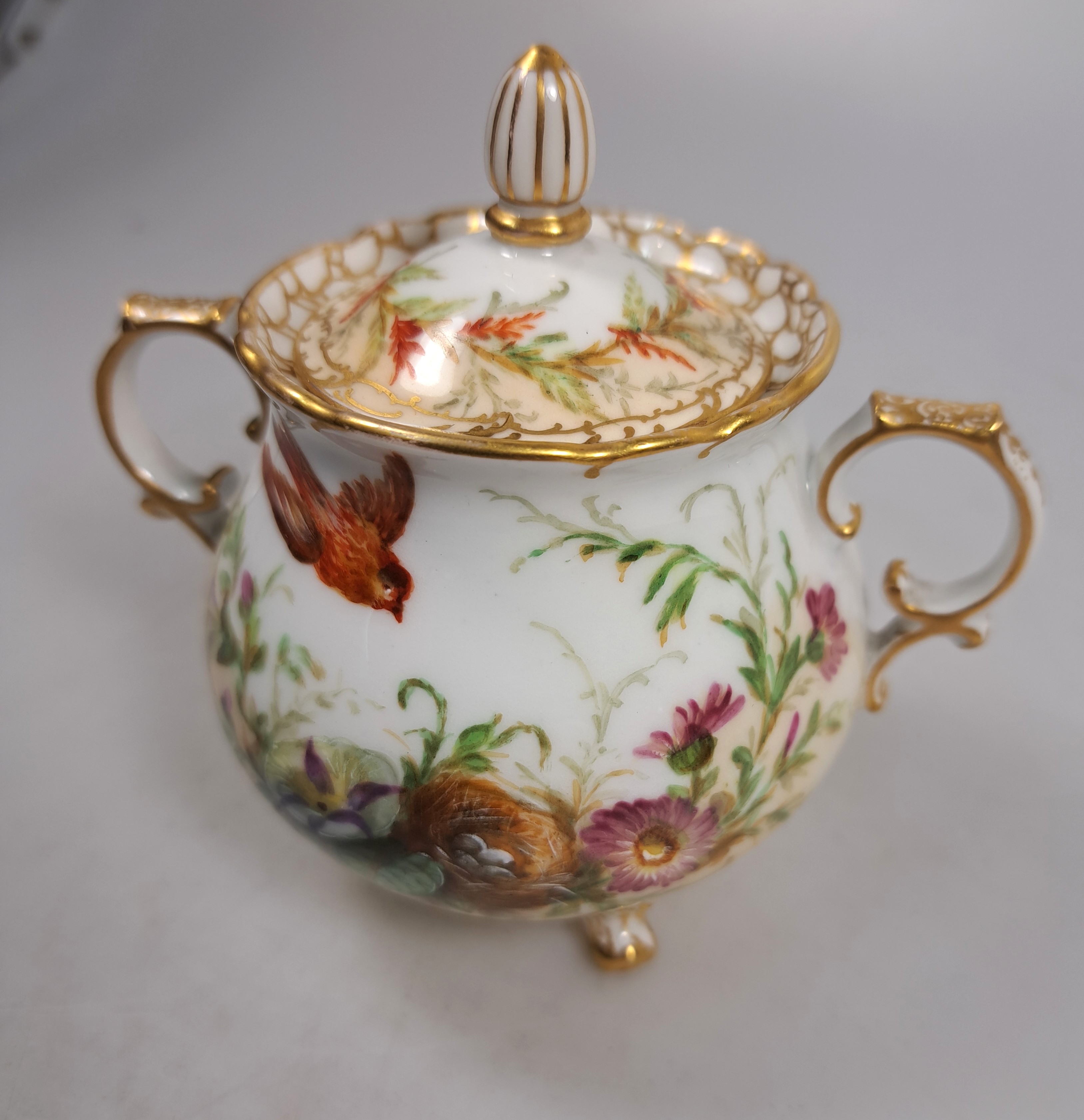 Unikate, Malerei mit Singvögeln und Nestern zwischen Pflanzenwerk, Kanne mit Szepter