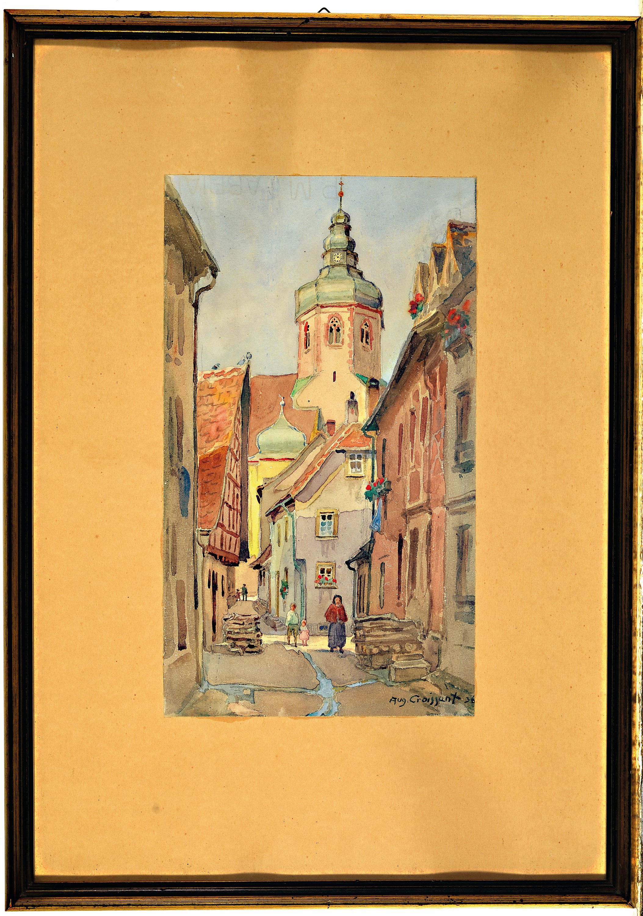 August Croissant, 1870 Edenkoben-1941 Landau, Stadtansicht mit Kirche, Aquarell auf