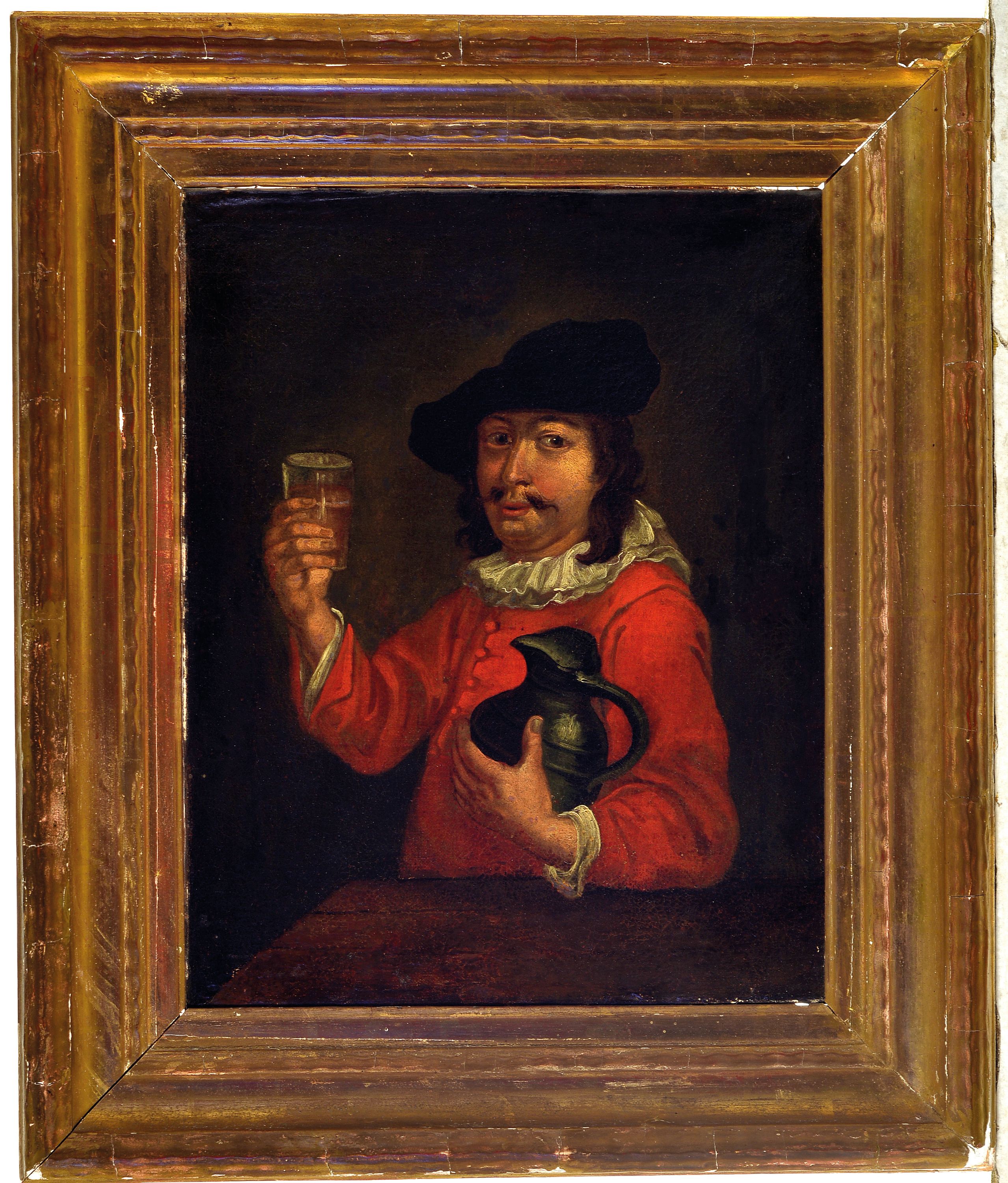 Unbekannter Künstler des 19. Jh., Porträt eines Mannes mit Krug und Glas zum Prosten erhoben, Öl/Lwd, rest., ca. 41x32cm, R. ca. 57x48cm